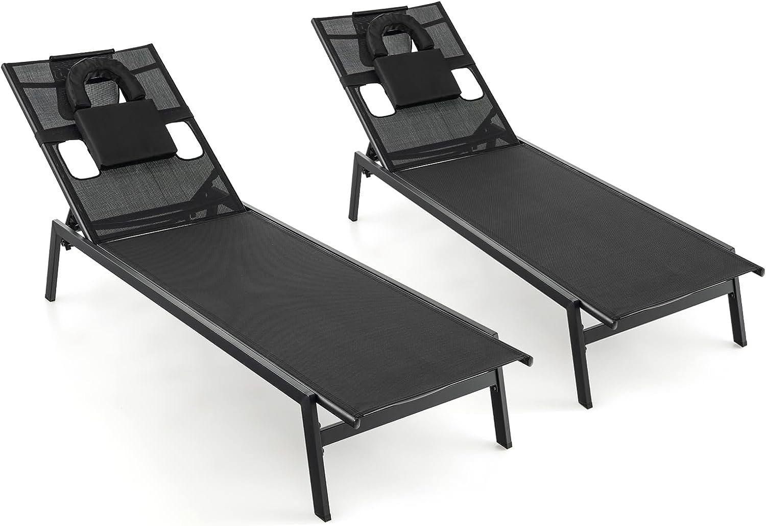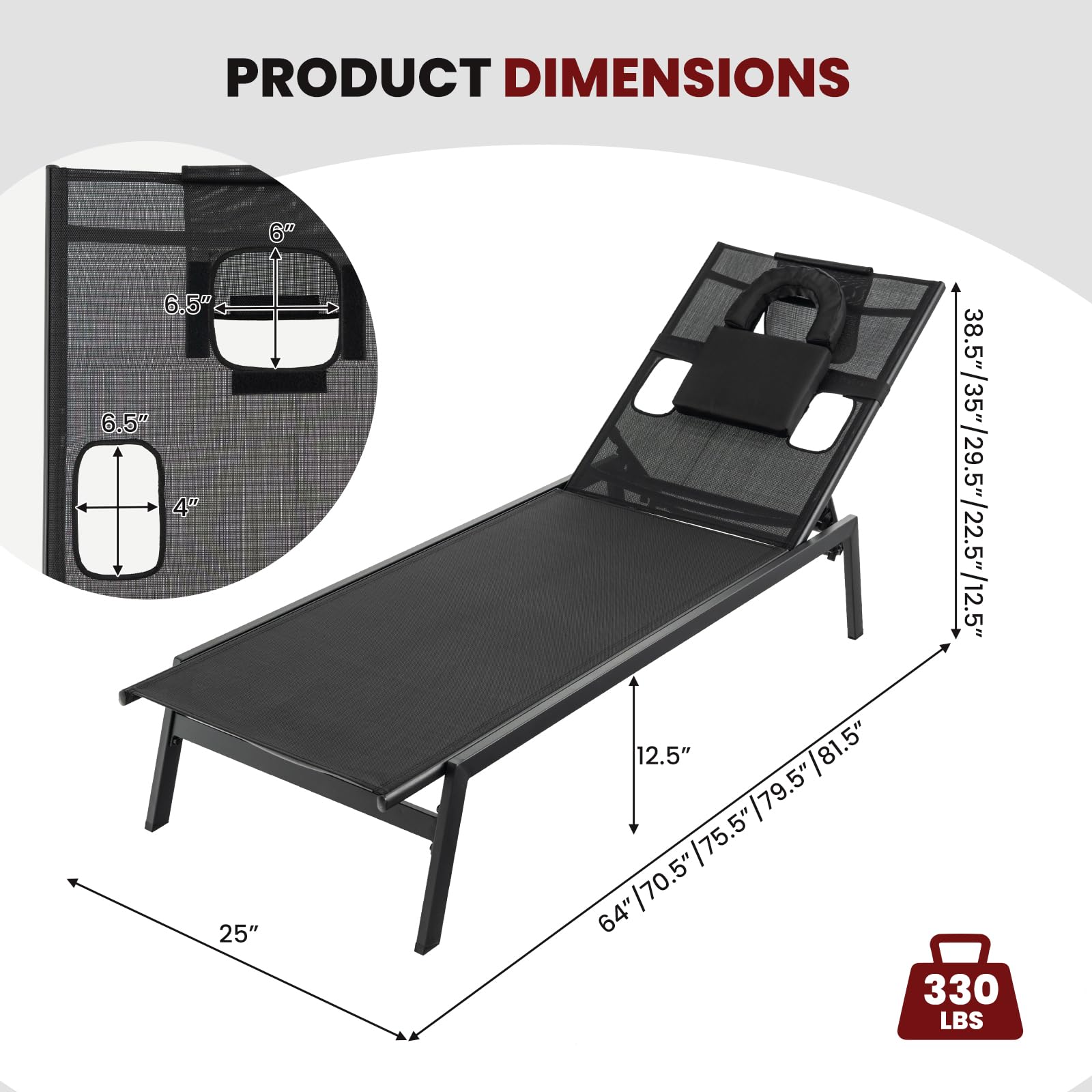 - Removable Pillow: This patio chaise lounge is uniquely designed with a face hole and 2 side holes on the backrest, so that you can choose lying face up to relax or lying face down to take a sunbath. Plus, a headrest pillow and a U-shaped pillow are provided for more coziness.