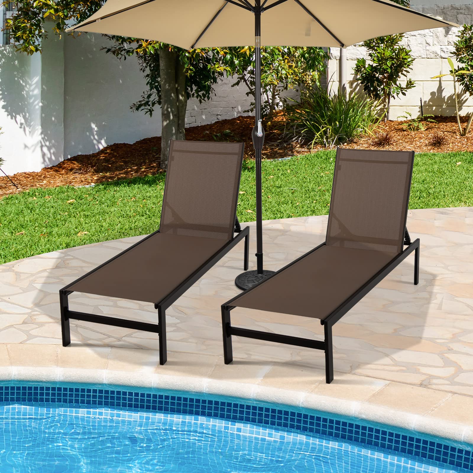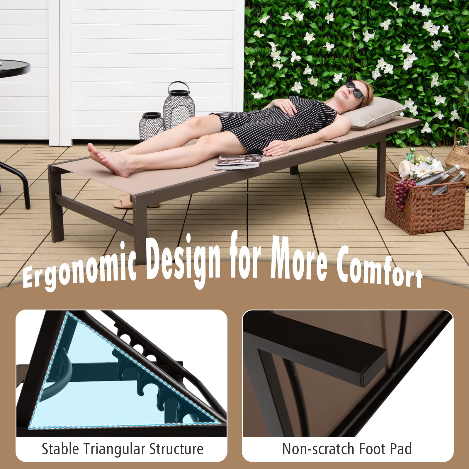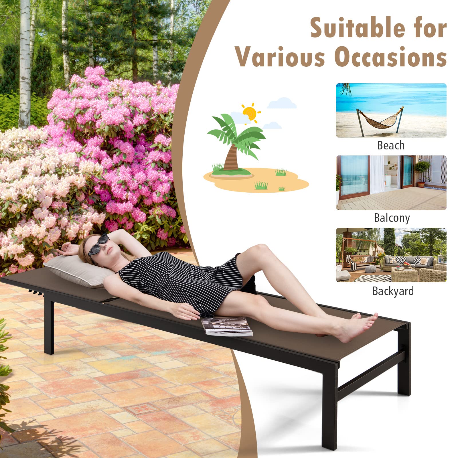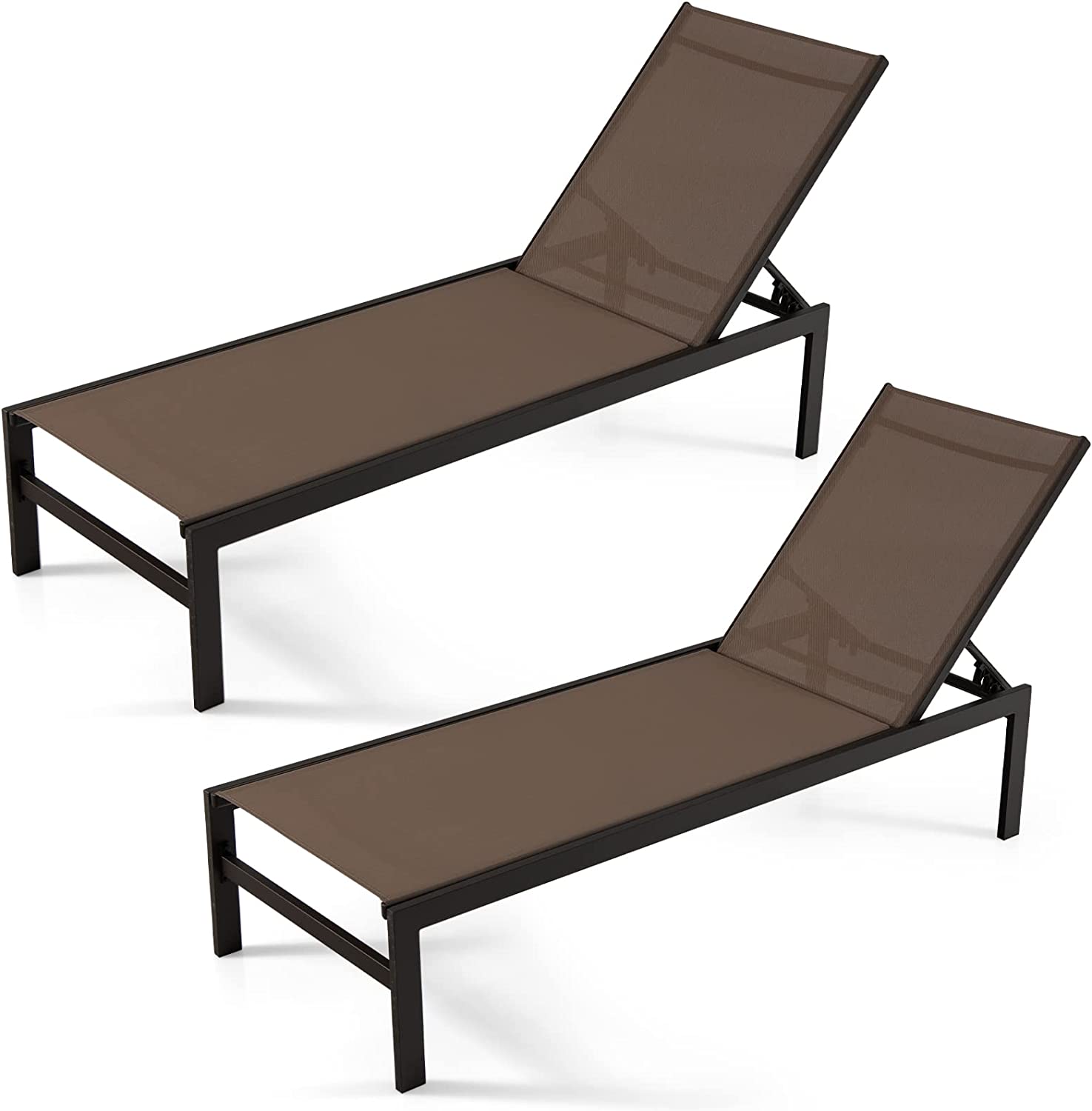 Designed with a 6-position adjustable backrest, this reclining lounge chair allows you to rest with the backrest up or flat. as needed for comfortable rest on the patio, poolside, beach, and deck. The rustproof aluminum frame ensures durability for outdoor use and the breathable fabric offers ultimate comfort. With a minimalist style, this patio lounge chair will add a touch of elegance to your space no matter where it is placed. What's more, the high backrest and wide seat provide you with better support. This versatile patio chaise lounge chair will achieve all your leisure needs!