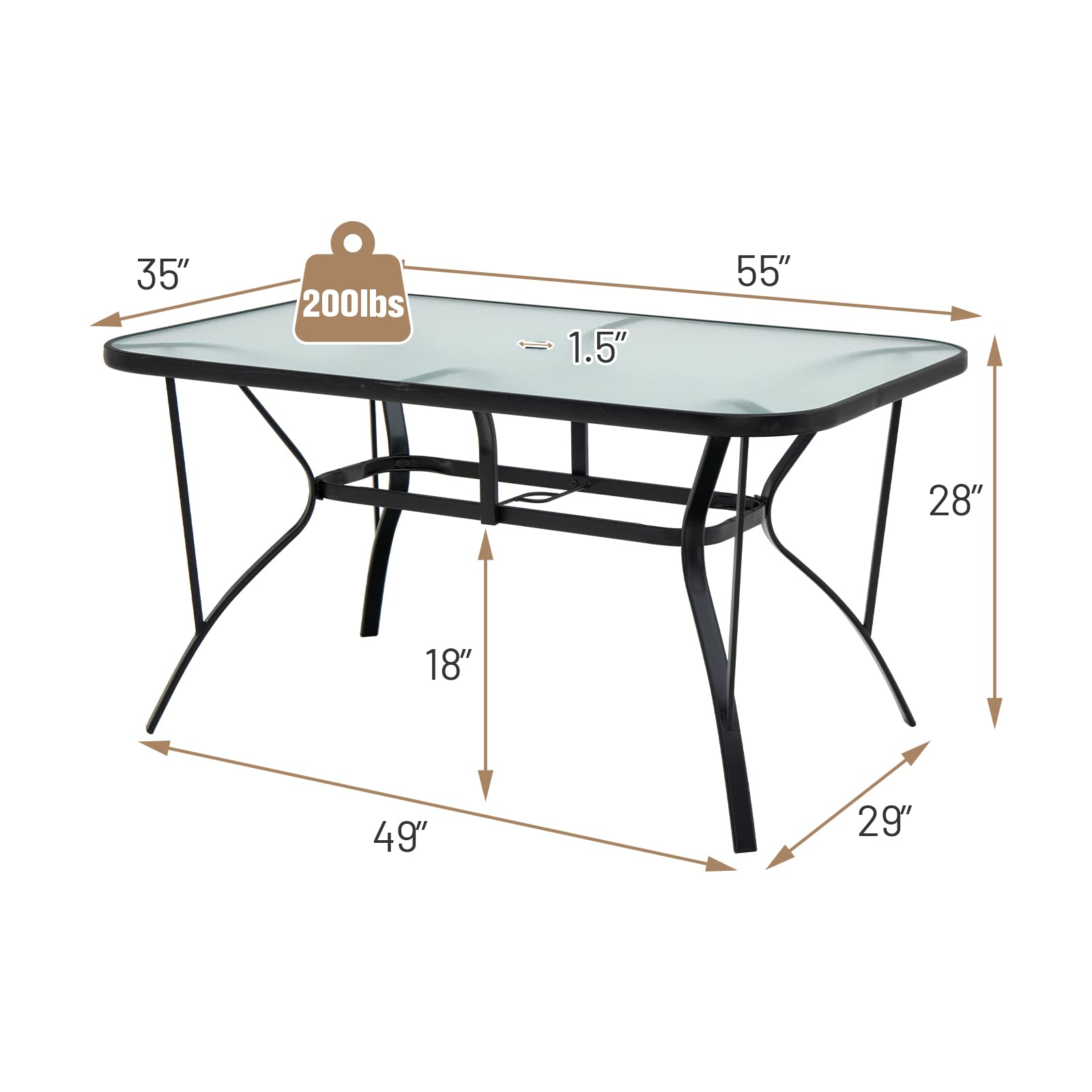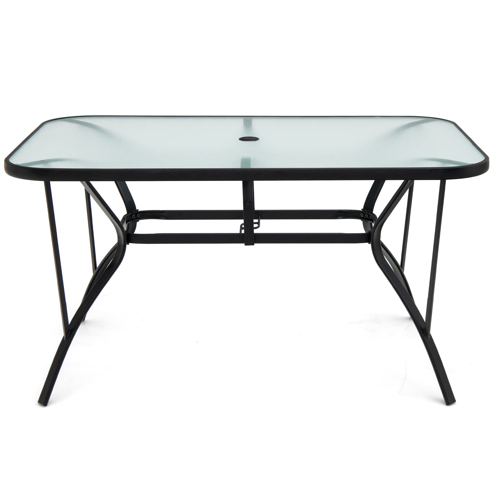 With a large tabletop (55”L x 35”W), this outdoor rectangular table features ample space for 4-6 people and food. And the tempered glass tabletop fits different types of food, no matter whether it is cold or hot. If you want to eat in the shade, just insert a patio umbrella (not included) into the 1.5” built-in umbrella hole. What’s more, the sturdy and anti-rust steel frame with anti-slip foot pads ensures 200 lbs strong loading capacity.