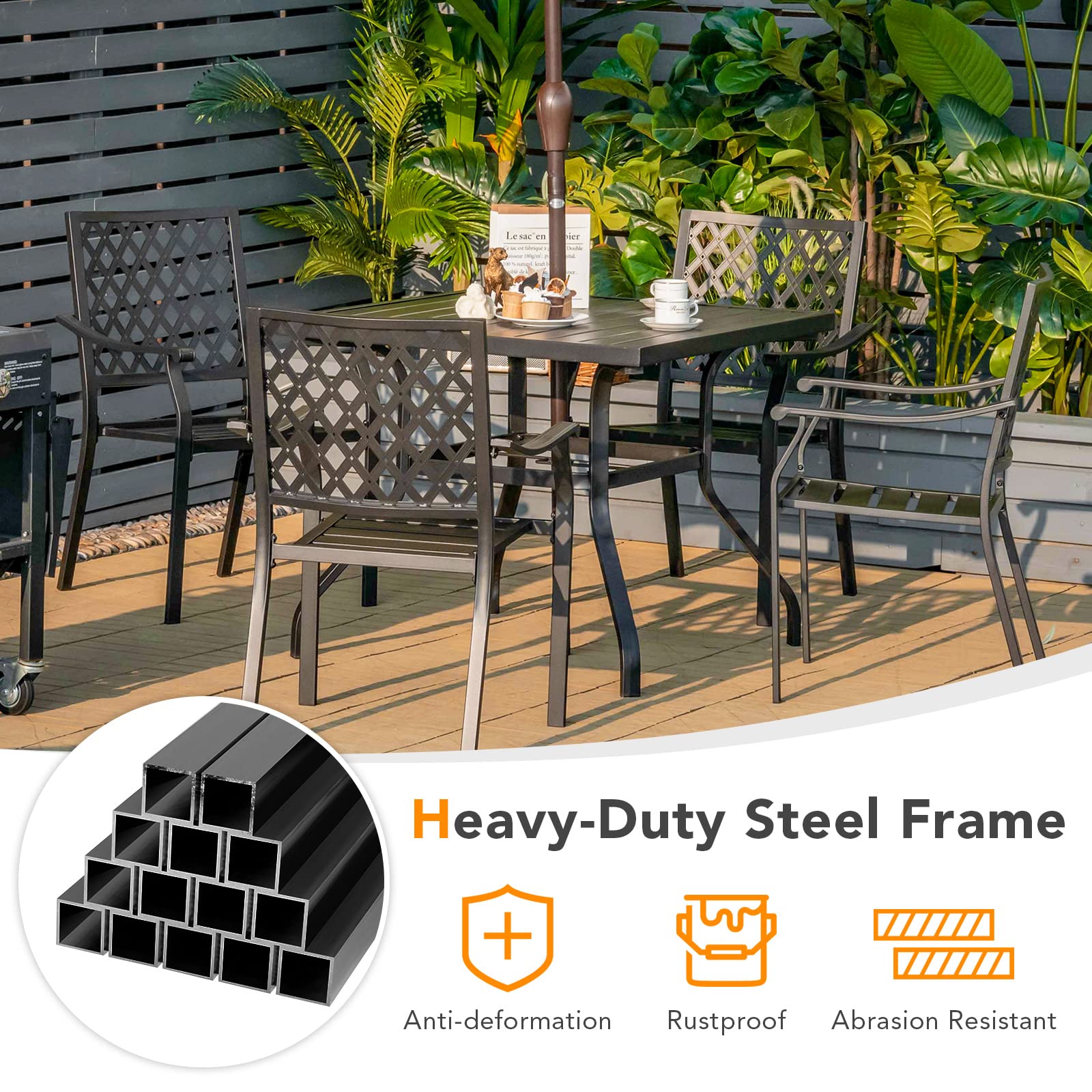Made of high-grade steel pipes, this dining table features super high stability and can withstand 180 lbs heavyweight. And its anti-slip footpads give good protection to the ground. The wide tabletop can be used to store multiple items, making everything you need easy to fetch. Furthermore, the surface of the table is powder-coated, so it won't easily rust, ensuring long-lasting using time. Additionally, the umbrella hole in the middle allows you to relax under the cool shade. If you are looking for a suitable table to match your outdoor dining chairs, this patio square table will be a great choice.