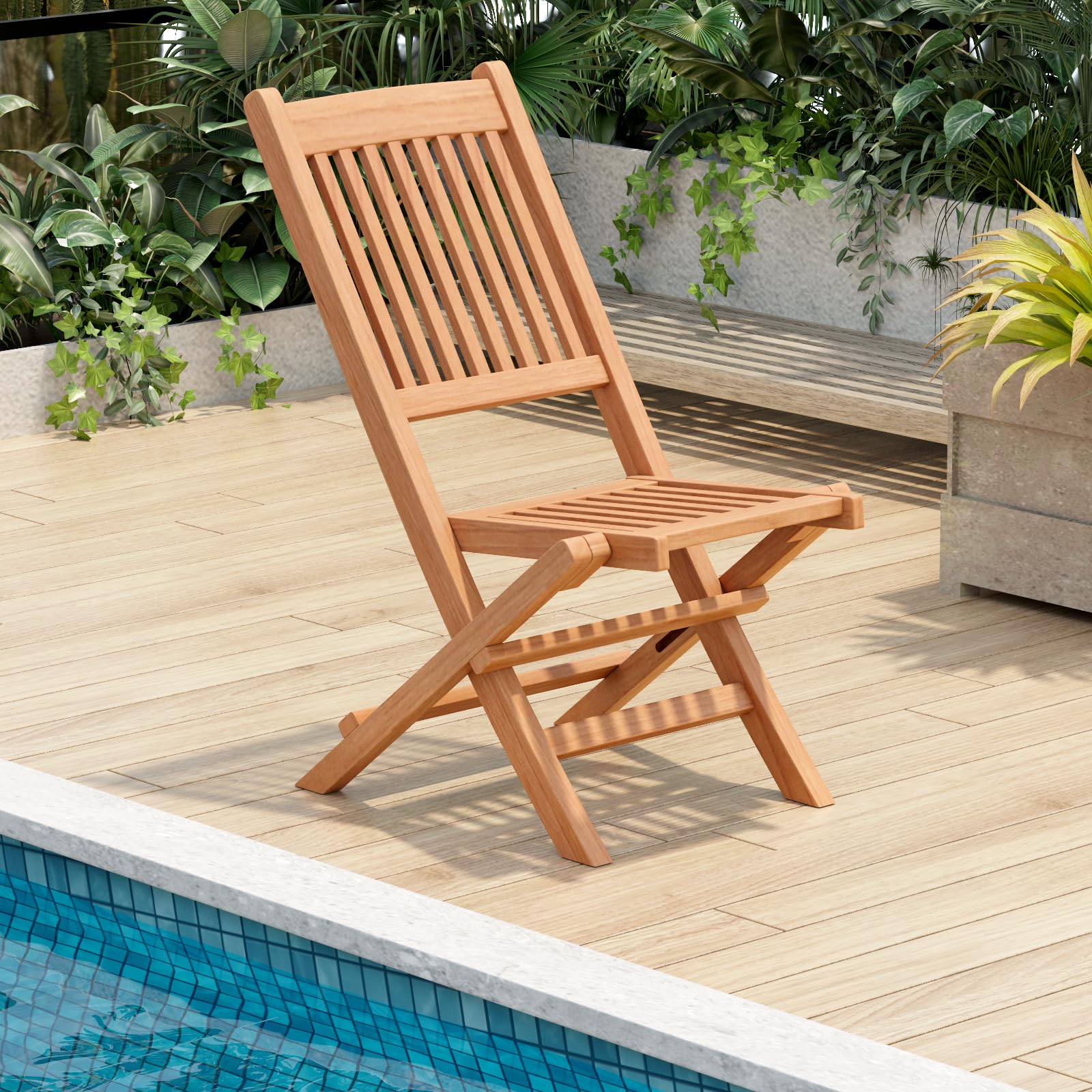 Featuring a slatted seat and backrest, this chair not only looks great, but also allows for plenty of airflow on hot summer days. The natural appearance of the teak wood makes it a perfect fit for any outdoor setting, whether it be in your backyard, on the terrace, or even on your next camping trip. Moreover, with its sleek design and solid construction, this chair will elevate the look of your outdoor space while providing unparalleled comfort. Enjoy the ultimate seating experience on your next outdoor adventure with this patio teak folding chair!