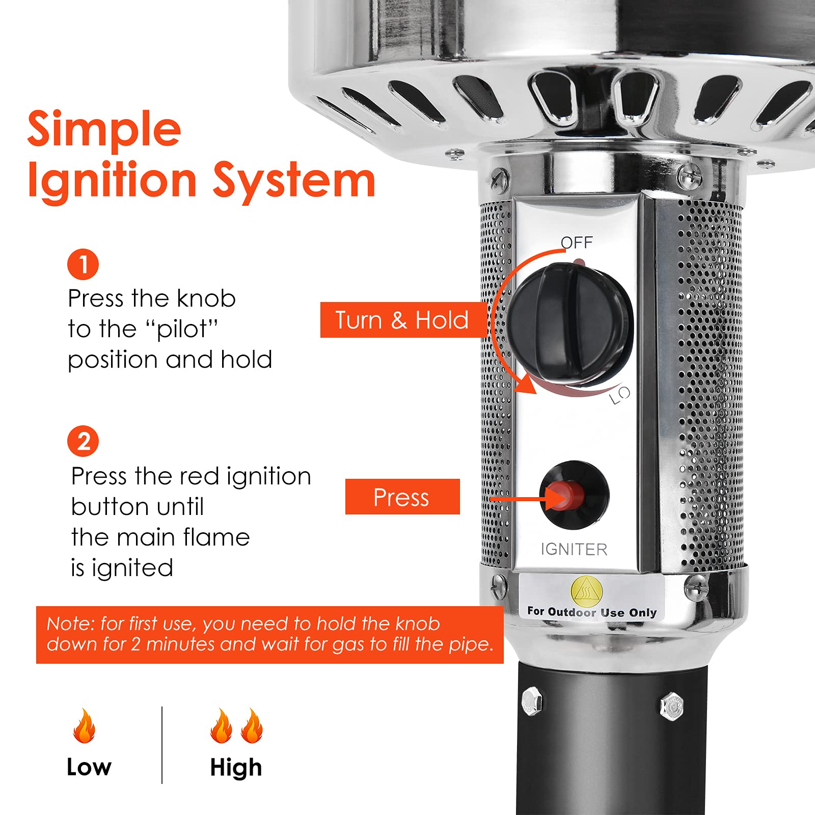 • Patio Heater with Efficient & Fast Heating: Made of premium steel, this patio propane heater with a powder-coated surface is rustproof and durable enough to stand the test of bad weather. The patio heater with a 32'' reflector provides a spacious warm area of up to 15 ft in diameter, and a powerful 50000 BTU of heat ensures faster heating speed.