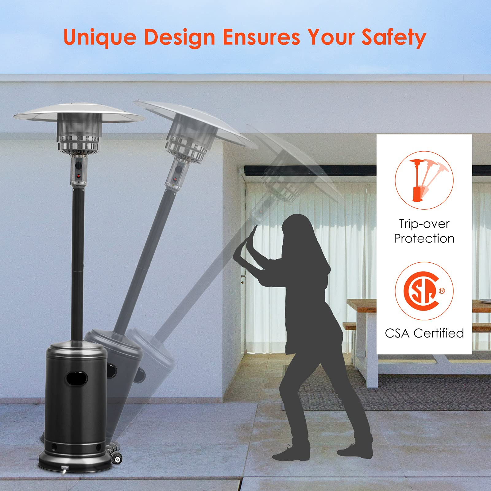 • Outdoor Heaters for Patio with Safety Protection: This outdoor heat lamp adopts an anti-toppling design to turn the heater off automatically if it tips over by accident, and the patio heater with CSA certification makes you feel relieved to use it. Besides, 3 stakes increase overall stability and safety.