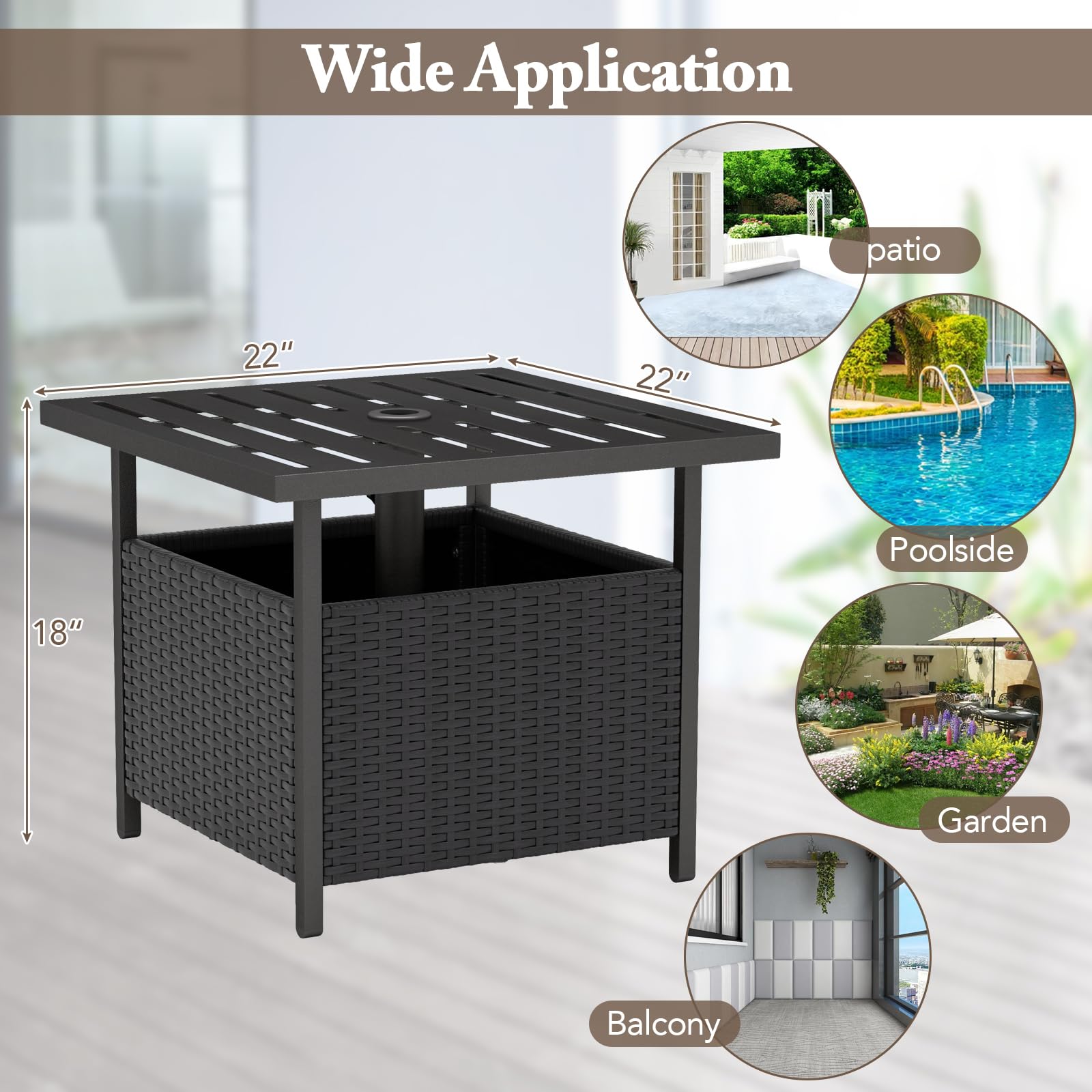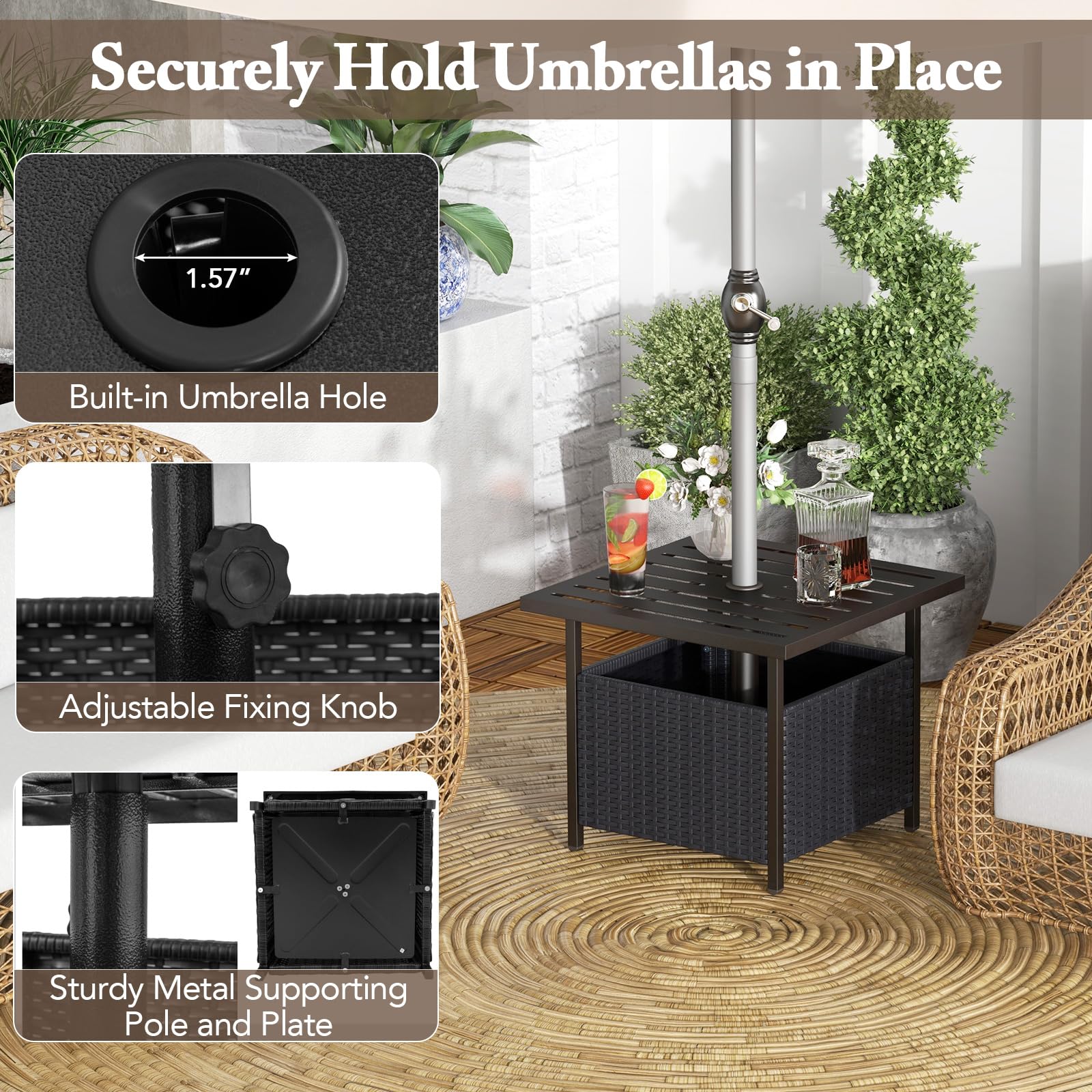 Upgrade your outdoor space with our multifunctional 2-in-1 patio side table, designed to serve as both an elegant end table and a sturdy umbrella stand. The built-in umbrella hole, reinforced with a metal support pole and an adjustable fixing knob, ensures your umbrella stays securely in place, providing shade and comfort.