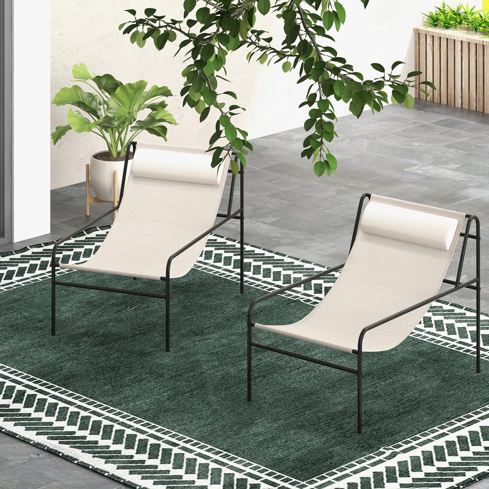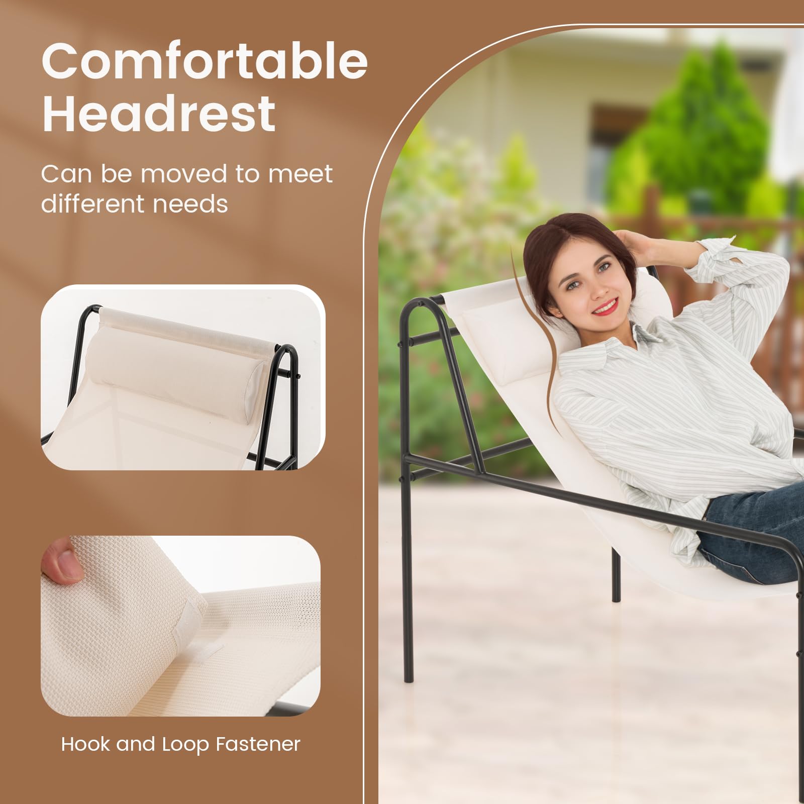 Complete with a detachable headrest pillow filled with soft and elastic sponge, this chair provides an added level of relaxation. The hook and loop fastener, which is one of the thoughtful details, allows for easy attachment and detachment of the pillow. Crafted with premium seat fabric that is breathable and quick-drying, this chair delivers a cool sitting experience while requiring minimal maintenance. The reinforced structure, built with super sturdy metal pipes and a stable triangle frame, provides robust support of up to 350 lbs. With its modern and minimalist style, this versatile sling chair complements various indoor and outdoor settings, making it an ideal choice for the living room, front porch, balcony, and more.