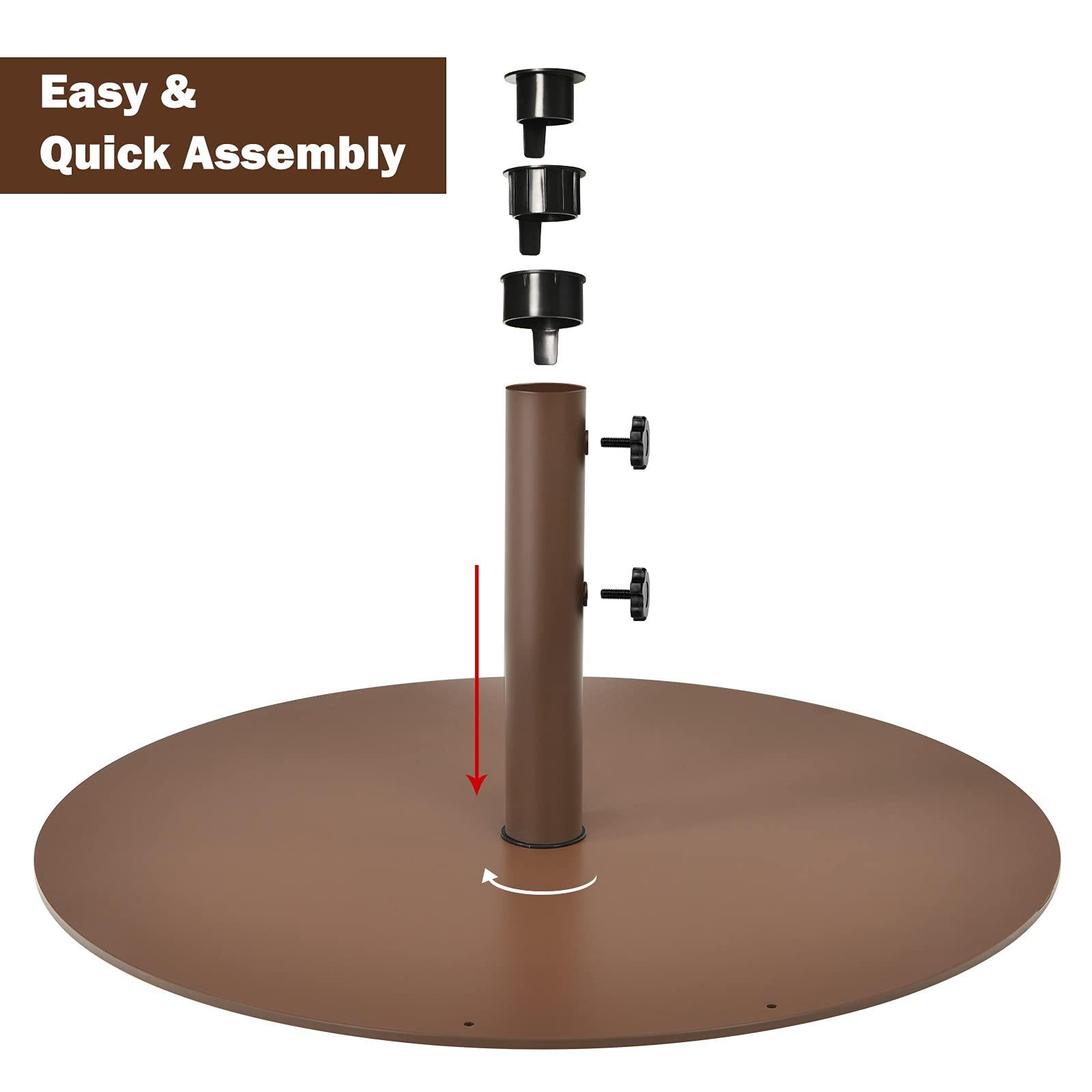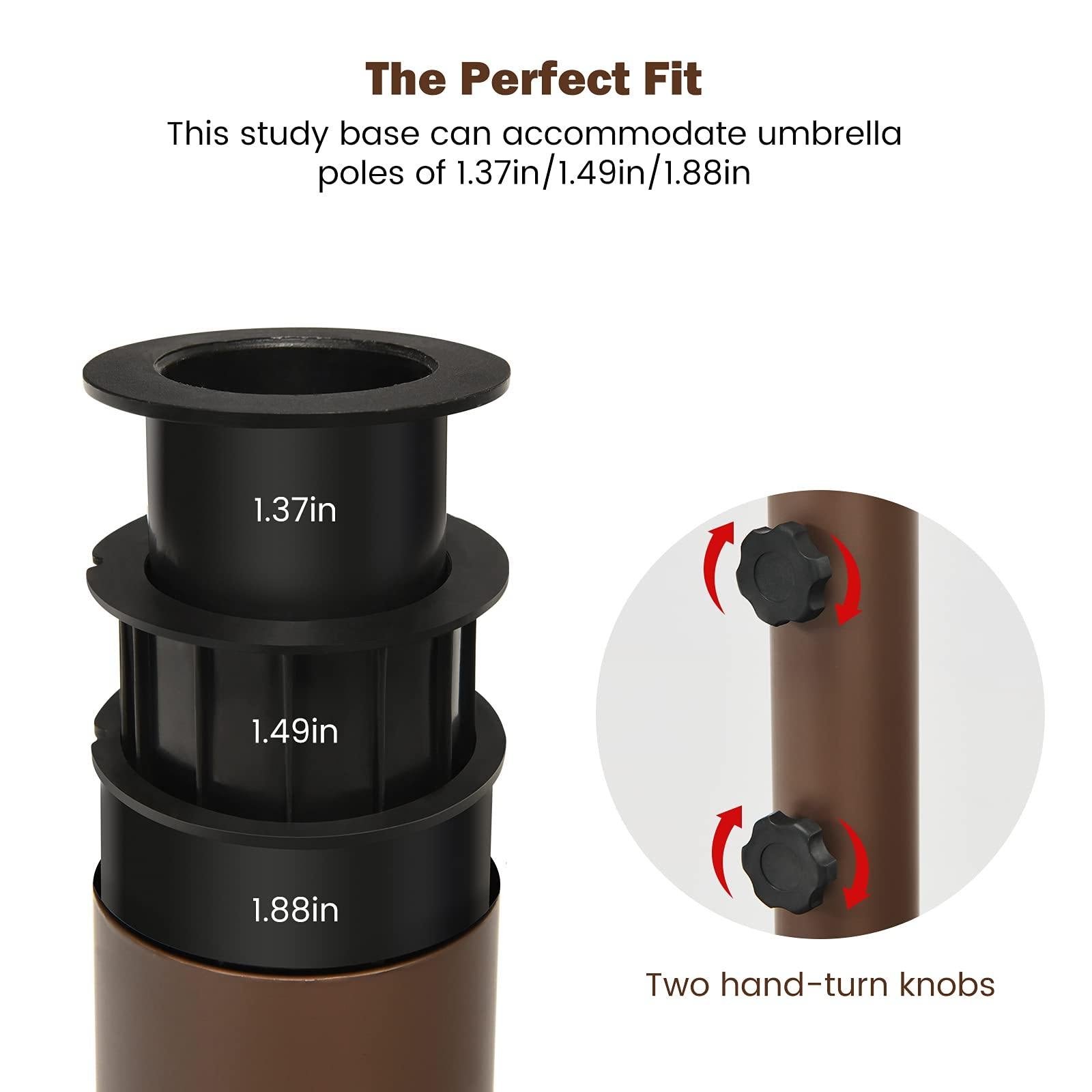 Our umbrella base is your perfect partner helping you to have more enjoyable outdoor time. Made of heavy-duty steel frame with powder coating, the umbrella base is not easy to rust, chipping and peeling for years to come. With 2 hand tightening knobs, the umbrella stand offers a secure grip for tightening the position of the umbrella pole in windy conditions. The umbrella base is compatible with umbrella pole from 1.37inch to 1.88inch and it perfectly work with the 1.37inch/1.49inch/1.88inch diameter pole for 3 adapters, making it an ideal choice for balcony, poolside, backyard, etc.