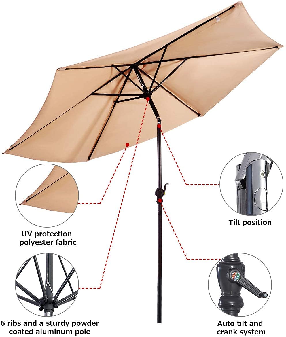 Designed with modern appearance, it will be a perfect addition whether for family or commercial. It can be used in all weather with the large umbrella cover of 9" to resist both sun and rain. As it is tilting, there is no illumination discomfort. Combined with the crank lift system, it will be much easier to use. The push-button tilt adds longevity to your umbrella by separating the tilt feature from the handy open/close crank. And a 50lbs umbrella stand can keep the umbrella stable when using it. Its rotatable wheels also allow you to move your umbrella around with little effort.