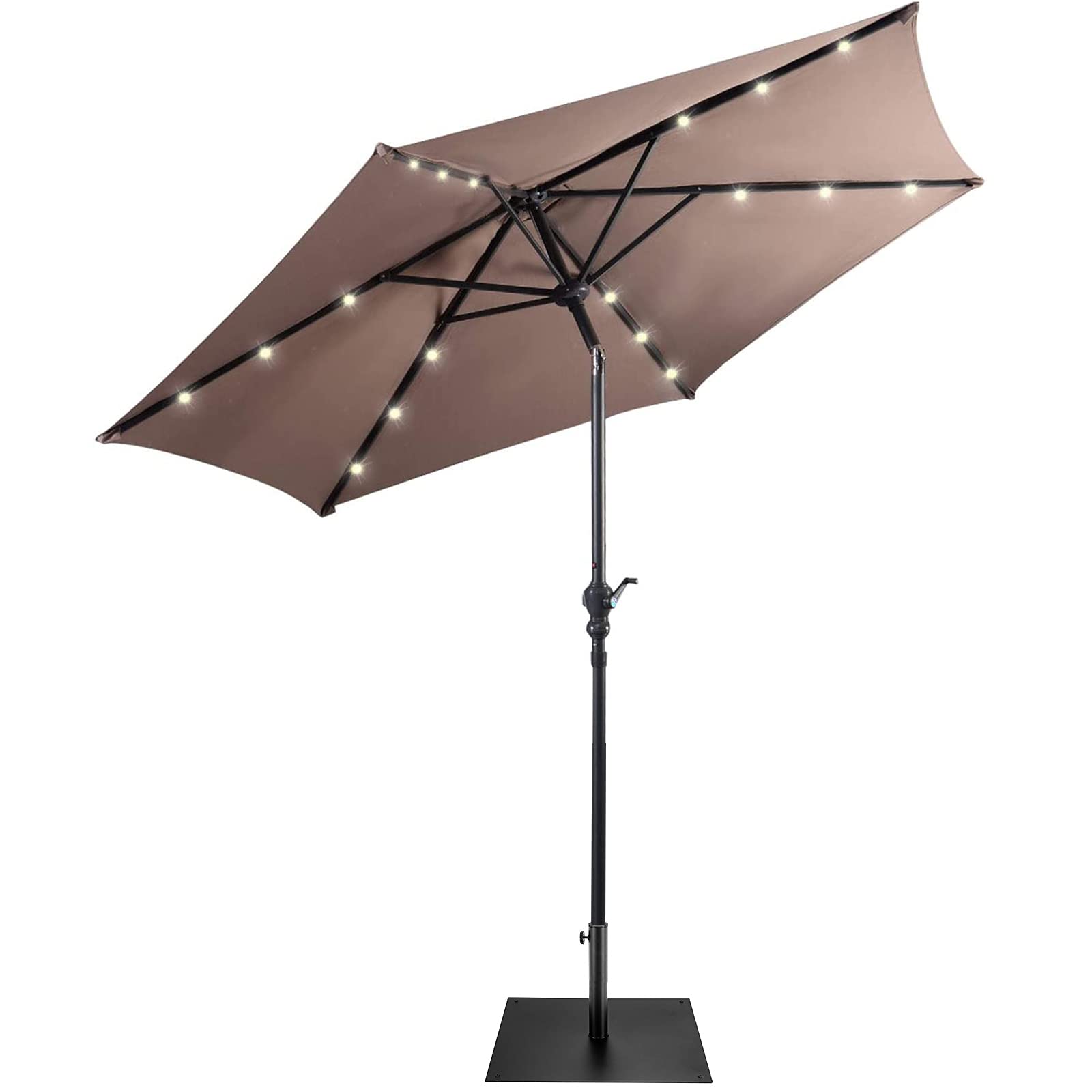 Designed with modern appearance, it will be a perfect addition whether for family or commercial. It can be used in all weather with the large umbrella cover of 9'' to resist both UV and rain. As it is tilting, there is no illumination discomfort. Combined with the crank lift system, it will be much easier to use. The top solar panel will store energy during the day so that you can use it at night. With the soft LED flame, the umbrella renders a romantic atmosphere for you to spend a great night. And a 40lbs umbrella stand can keep the umbrella stable when using it.
