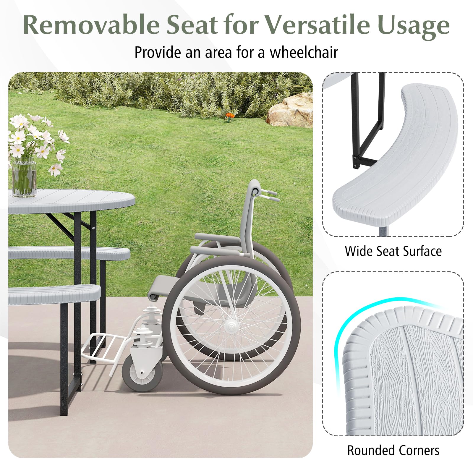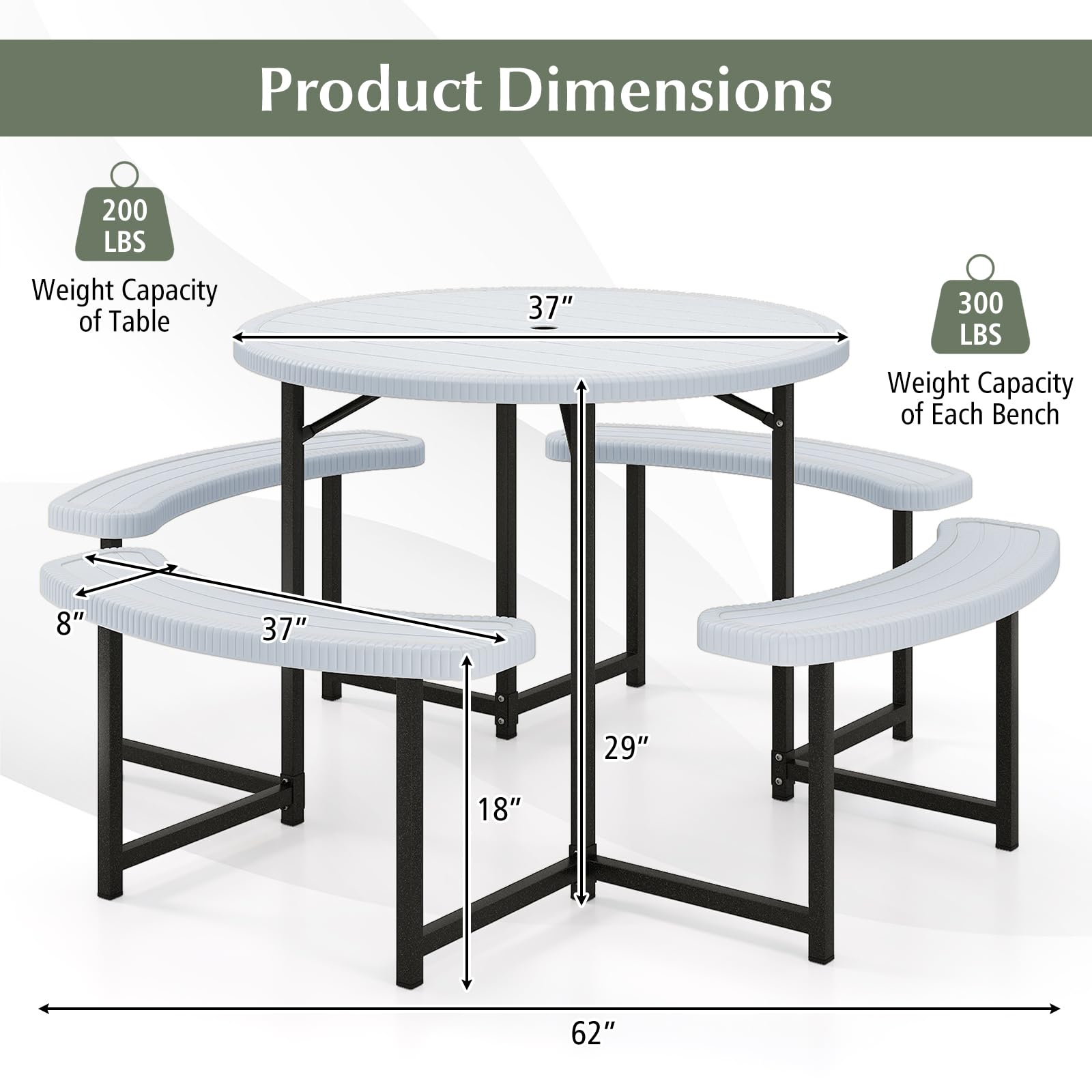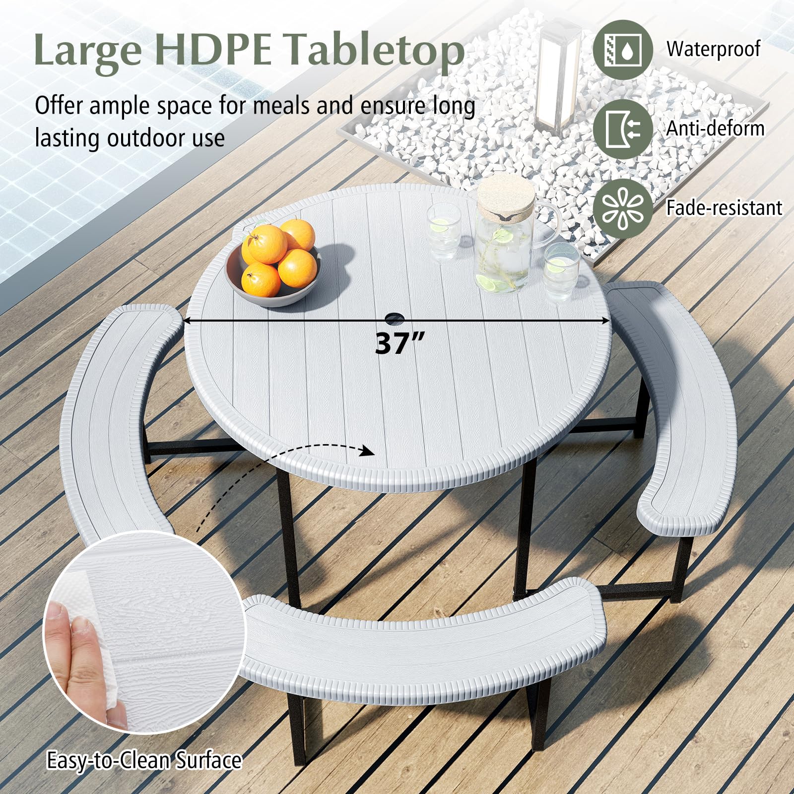 Are you looking for a versatile outdoor dining set that can accommodate up to 8 people? Look no further! This 37-inch round picnic table, crafted from high-quality HDPE material, provides ample space for meals and long-lasting outdoor use. Its waterproof and fade-resistant surface ensures durability and easy maintenance. The built-in 1.57-inch umbrella hole seamlessly integrates into the tabletop, compatible with most standard patio umbrellas. Perfect for patios, backyards, beaches, poolside areas, and more, this picnic table seamlessly fits diverse settings.