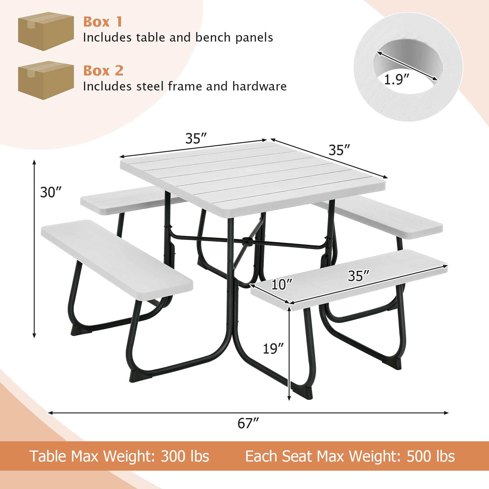 Featuring a spacious tabletop and 4 long benches, our picnic table can accommodate 8 people to have meal at once, making it a good choice for outdoor picnics. The large 8-person picnic table set is supported by powder-coated metal frame, ensuring exceptional stability. In contrast of others with wood tabletop, ours is made of high-quality HDPE material, which is waterproof and crack-resistant for lasting use. Besides, the central hole is convenient for you to install your patio umbrella. In that way, you can enjoy a view of your garden at any time without exposing yourself to sunlight. With all-in-one design, you don’t have to buy picnic table or chair separately. And it is applicable to various occasions, such as lawn, restaurant, backyard, poolside.