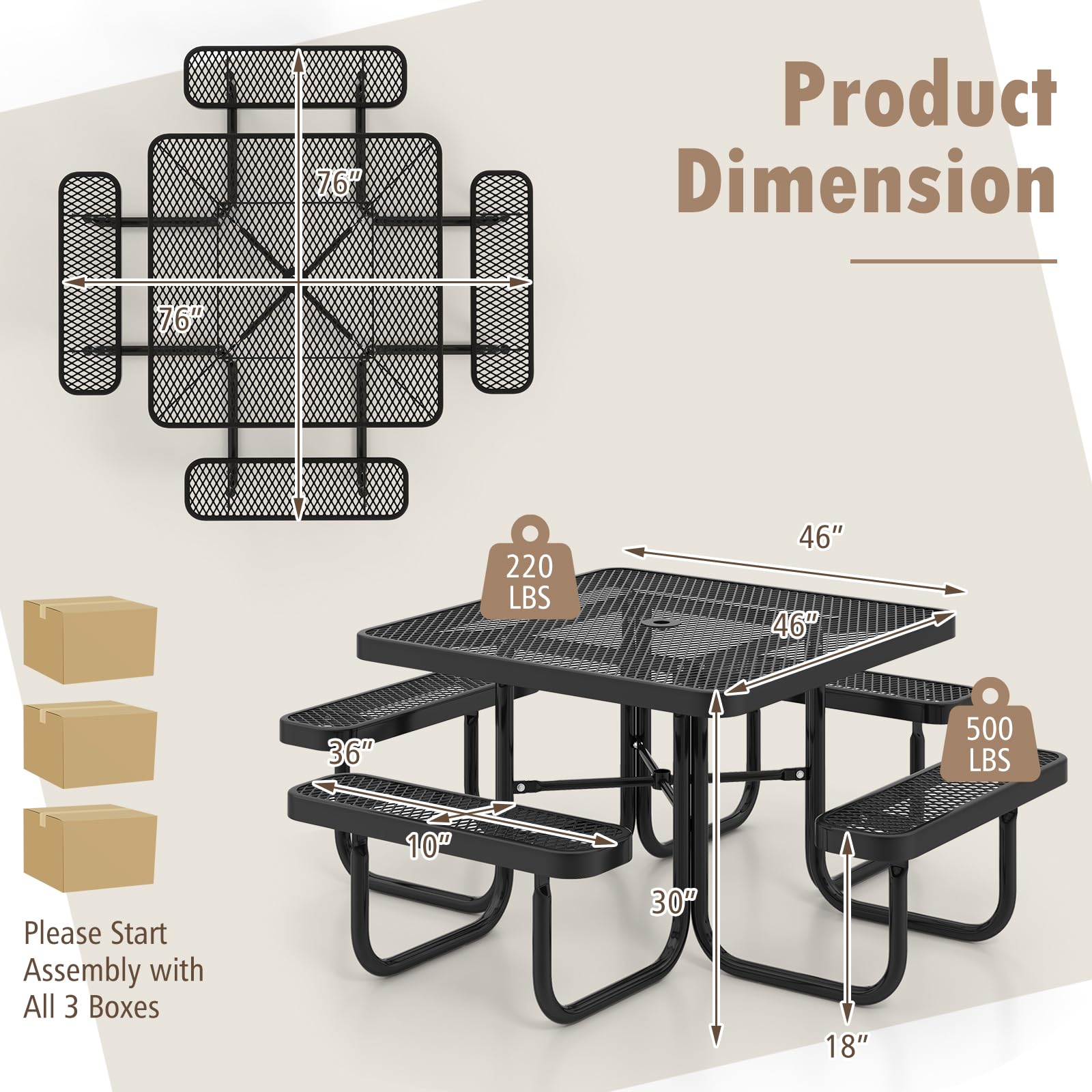 - Ease of Assembly & Maintenance: Coming with numbered parts and detailed instruction, the picnic table with umbrella hole is easy to setup. And the sprayed surface is easy to maintain. The overall dimension of the outdoor commercial table is 76” x 76” x 30”(L x W x H).