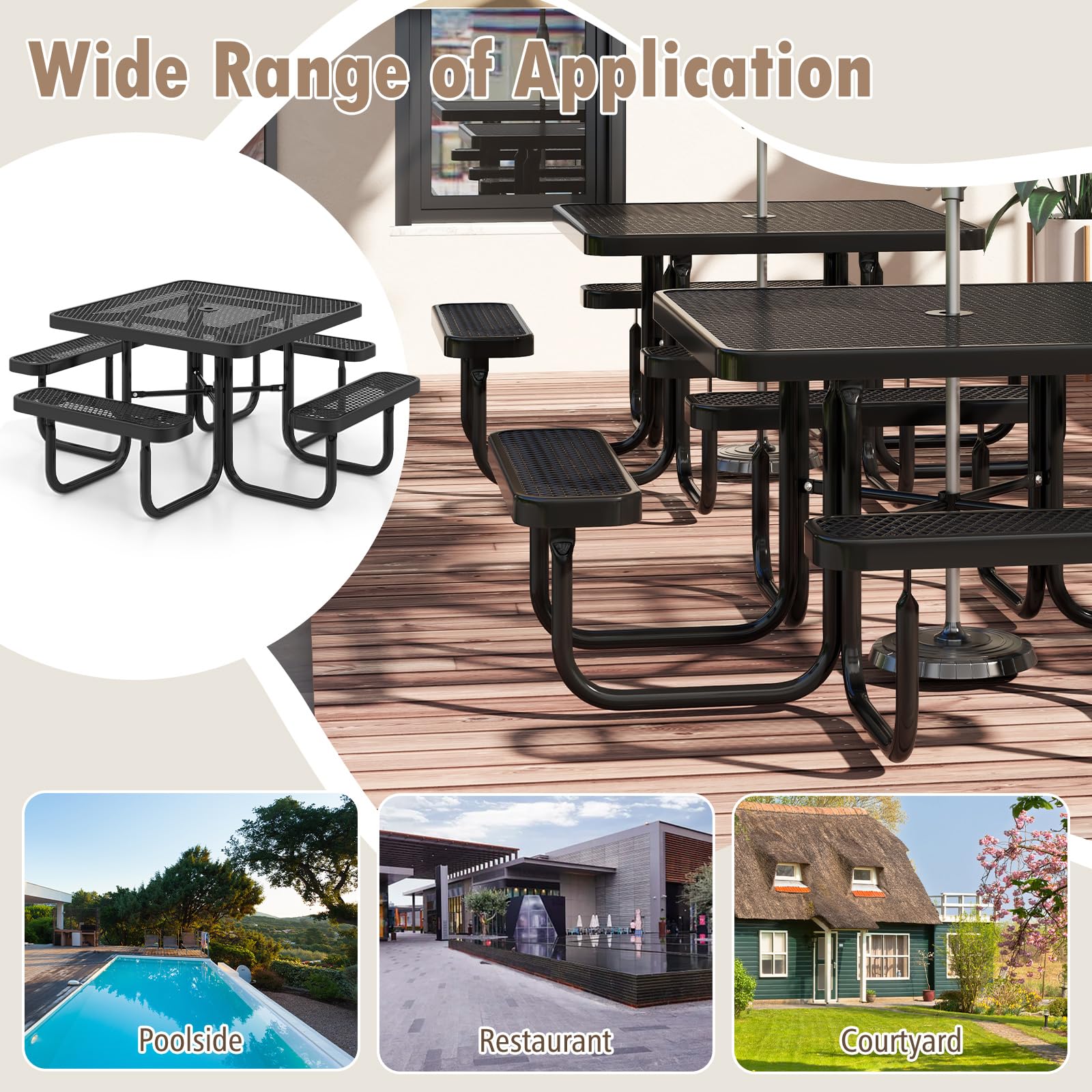 The square picnic table set with 4 benches can comfortably accommodate up to 8 individuals, providing a sociable space for connecting with friends and family. Whether you're hosting a backyard barbecue, enjoying a picnic, or just seeking a change of scenery for your meals, this portable set is designed to adapt to a variety of outdoor settings. With durable coated metal structure, the camping table with seat is weatherproof for years of outdoor use, which is suitable for courtyard, lawn or poolside. Coming with an umbrella hole, the square table can accommodate most standard patio umbrellas, offering the option to dine in shaded comfort when the sun is out.