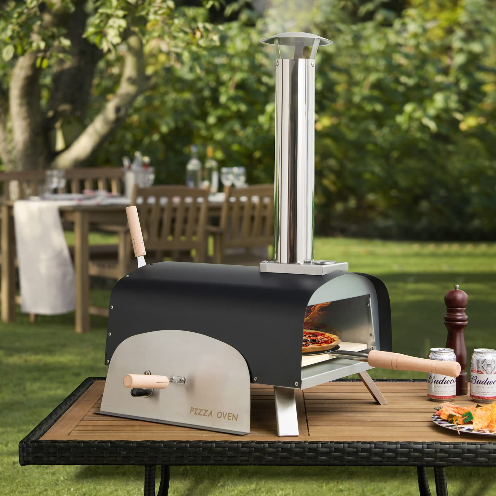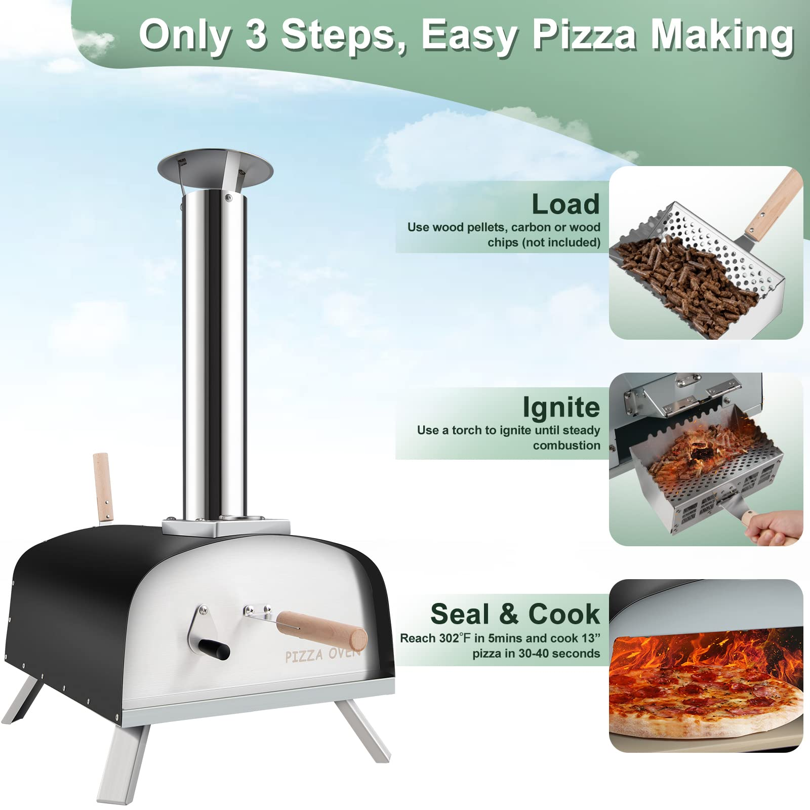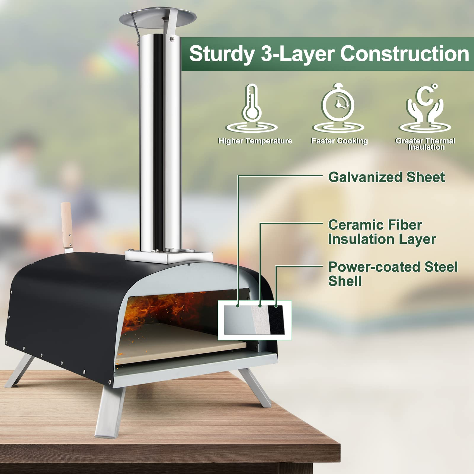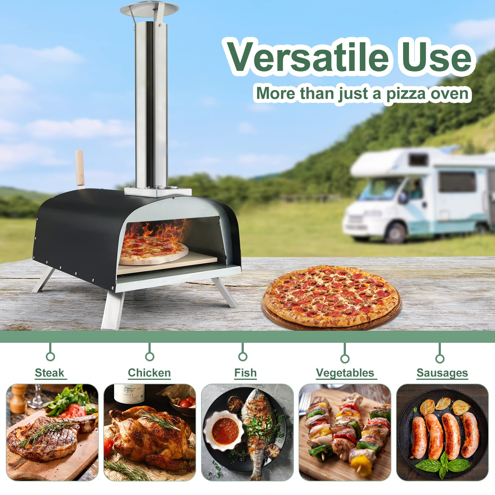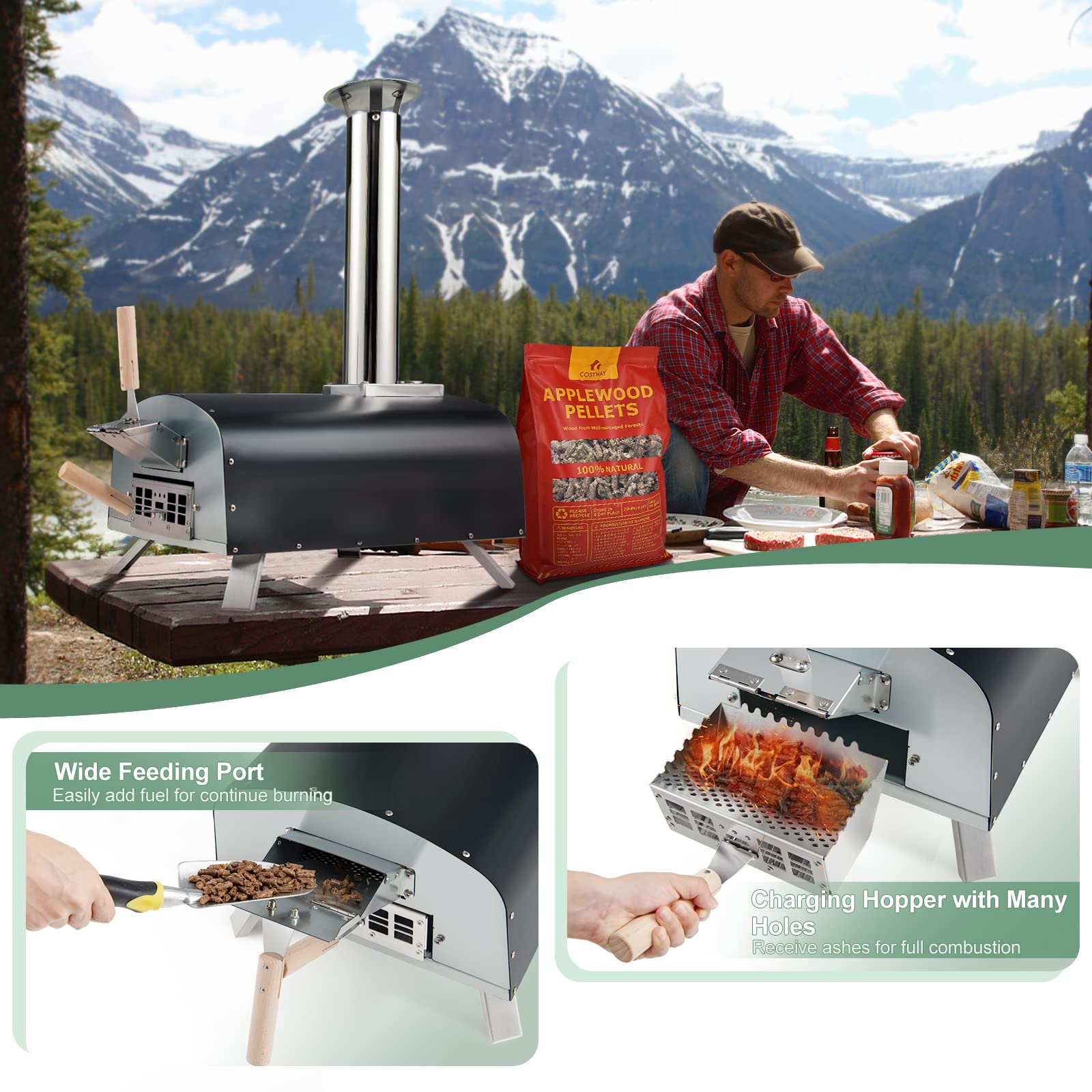 After ignition, the pizza oven only needs 5 minutes of preheating. It can heat up to 842 Fahrenheit and bake a pizza in a very short time. You can check the internal temperature through the built-in thermometer. What's more, the pizza stone can absorb water from the dough to create a crispy taste on the bottom and around the edges while leaving the inside fluffy. The 3-layer structure helps slow down the cooling rate of the oven, ensuring longer heat preservation. As for convenience, it's easy to add wood pellets into the feeding port and dump ashes with the charging hopper. The folding legs and removable chimney save a lot of space and make transport more convenient. It's ideal for roasting steak, fish, and chicken with your family and friends in a barbecue, party, camping, or catering event.