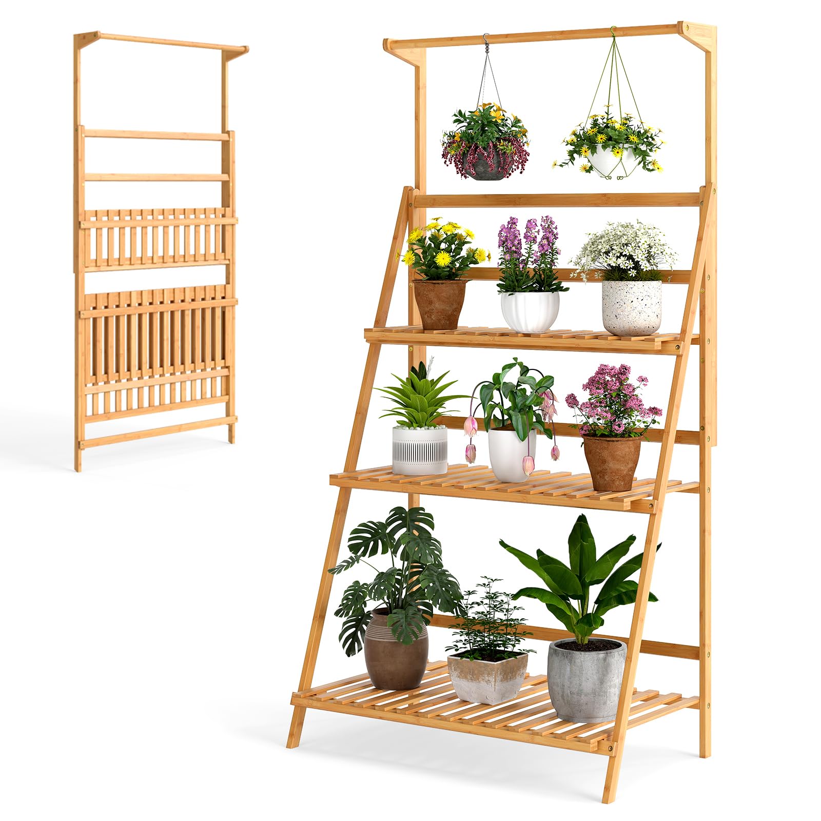 Made from solid bamboo with the oil-painted finish, this hanging plant holder offers exceptional hardness for long-lasting use. Its distinctive ladder design features 3 tiers of varying heights and widths, maximizing space while accommodating plants of all sizes. The sturdy triangular frame provides excellent stability and ensures your plants receive ample sunlight. Additionally, the tiered rack includes a height-adjustable hanger, perfect for hanging chimes, baskets, or lights. Whether you’re showcasing plants, flowers, shoes, books, or other decorations, this tall freestanding indoor outdoor plant stand adapts effortlessly to any space. Plus, its foldable design makes storage and transport quick and convenient when not in use.