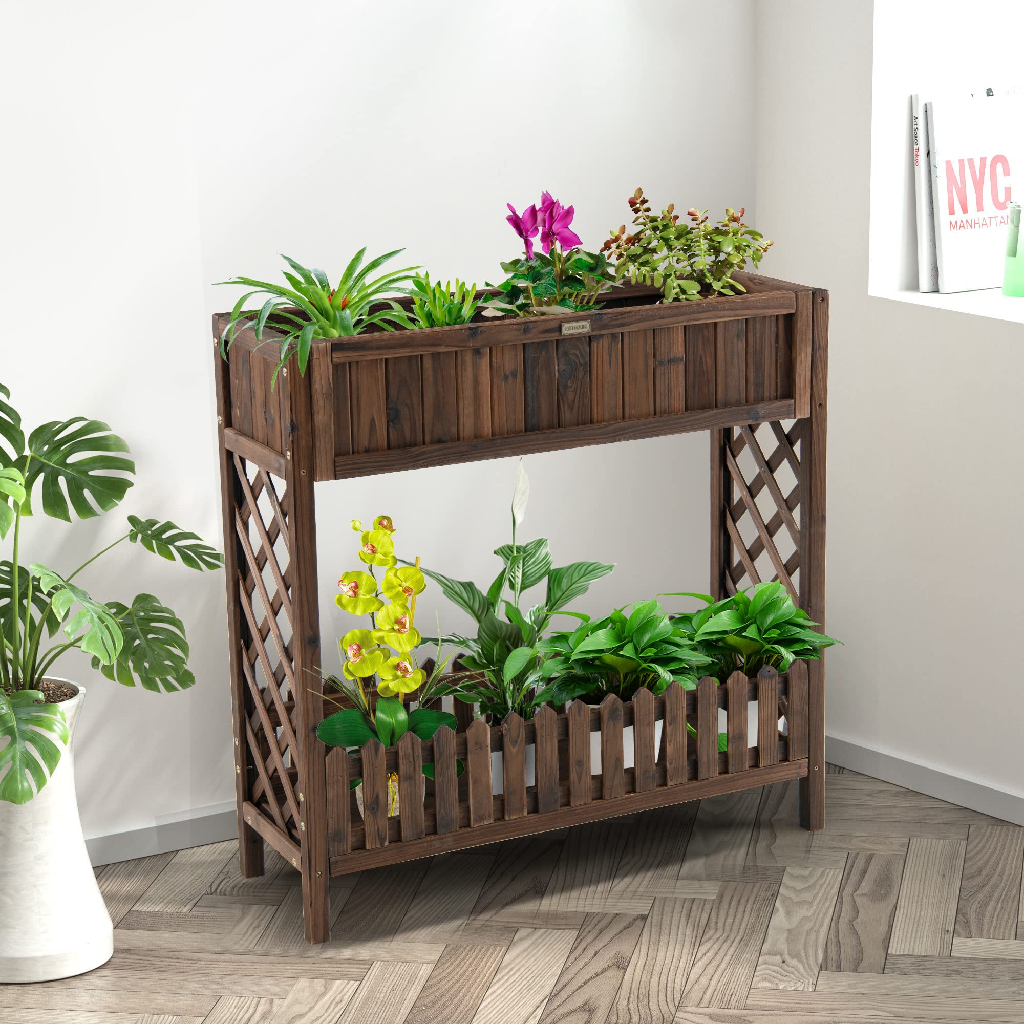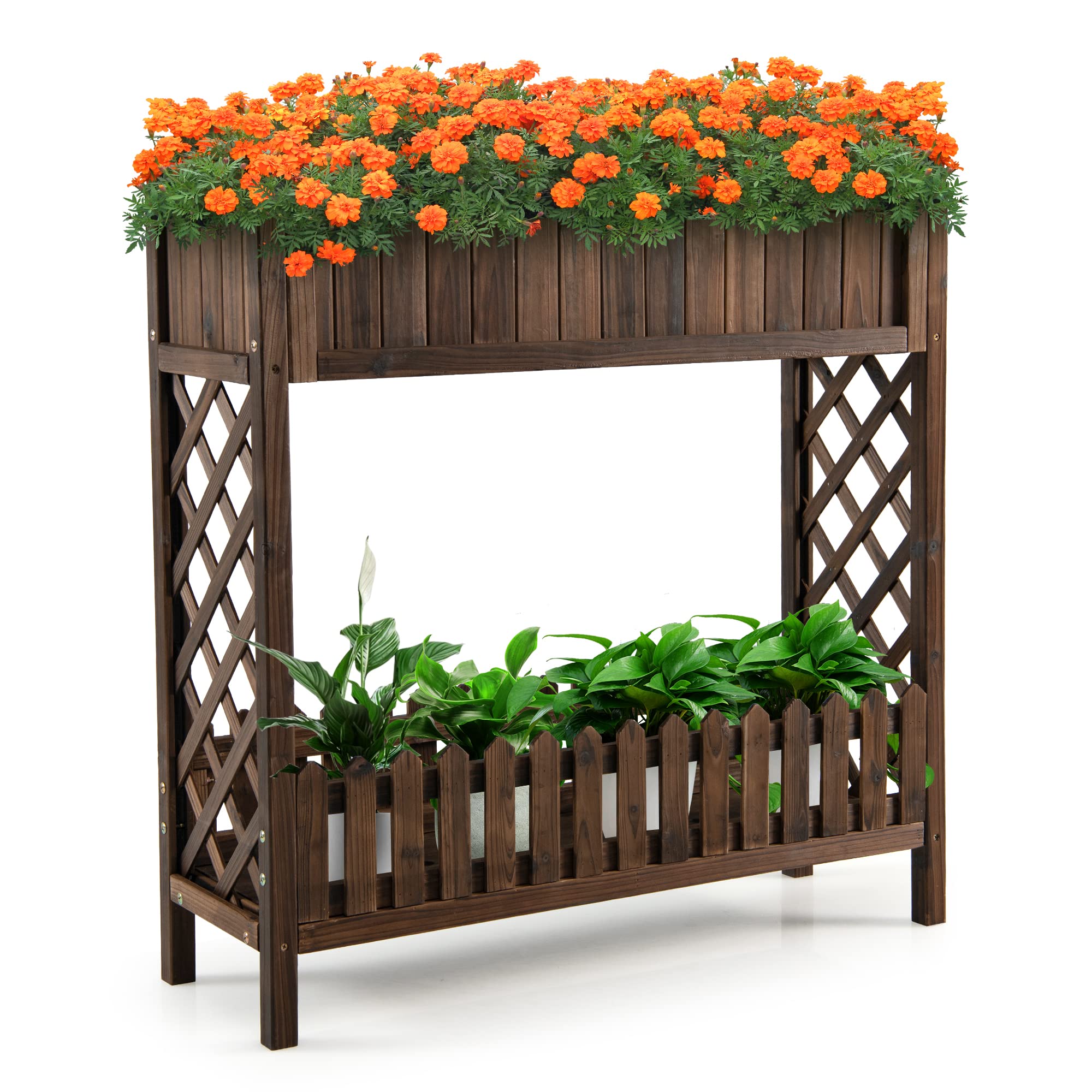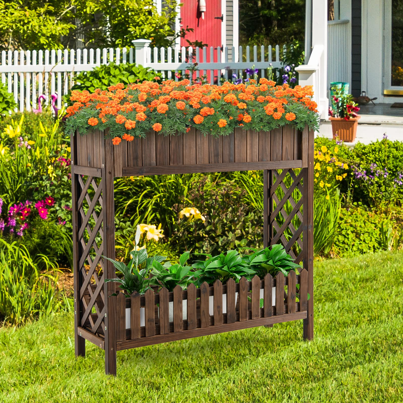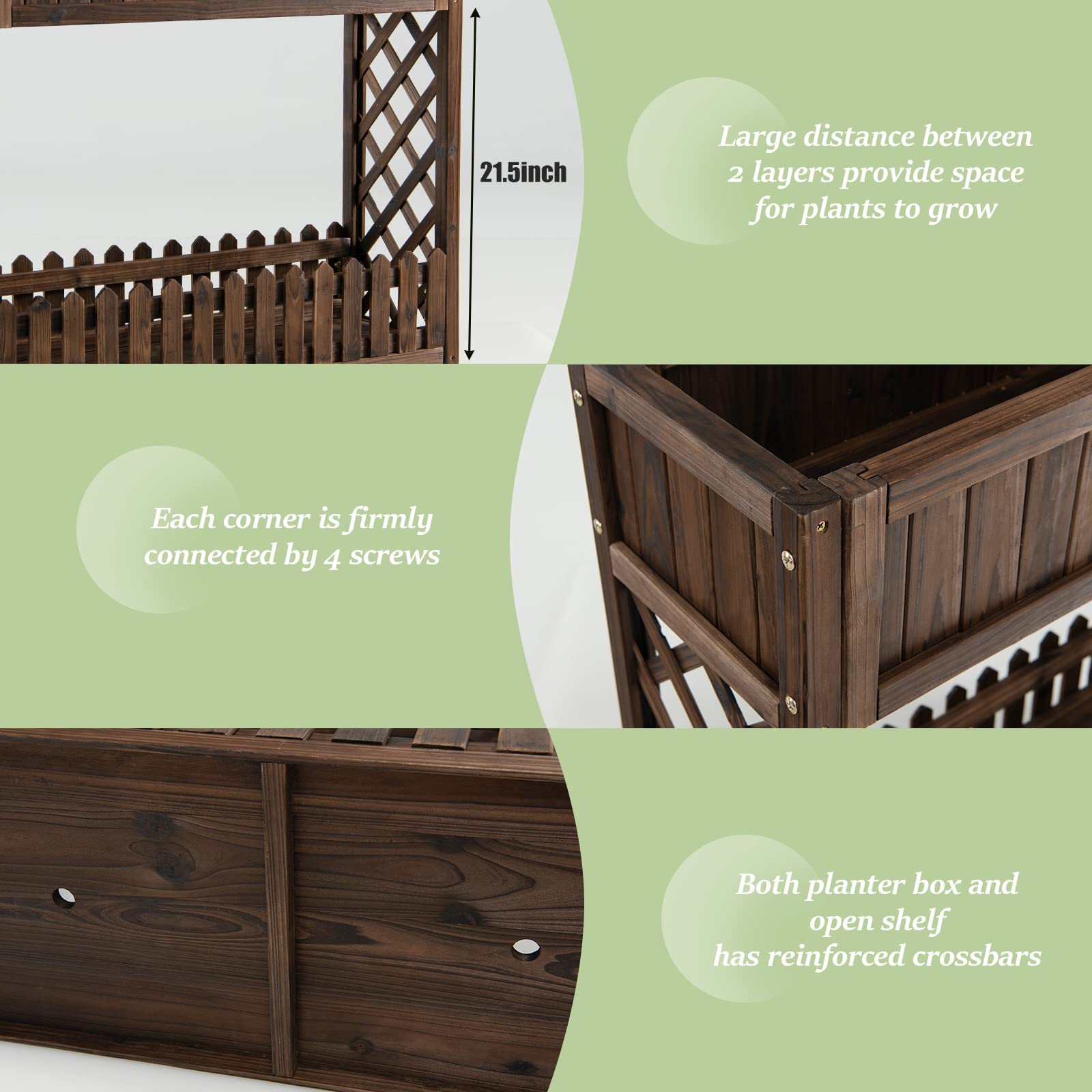 With our raised garden bed, your garden, yard and balcony will be more beautiful and tidy! This elevated garden bed features 2 layers to improve your space utilization, the planter box can grow a variety of plants, and the lower shelf can hold pots and garden tools. In order to ensure the healthy growth of plant roots, we designed four drainage holes at the bottom of the planting box to maintain good ventilation and promote the discharge of excess water. In addition, the bottom shelf fence provides double protection for plants, preventing them from falling. Our garden bed is made of carbonized cedar wood, which is water and corrosion-resistant and supports long life. Besides, strong support legs and side X-shaped reinforced grid batten will ensure greater stability. What's more, we provide detailed installation instructions with illustrations to help you assemble faster.
