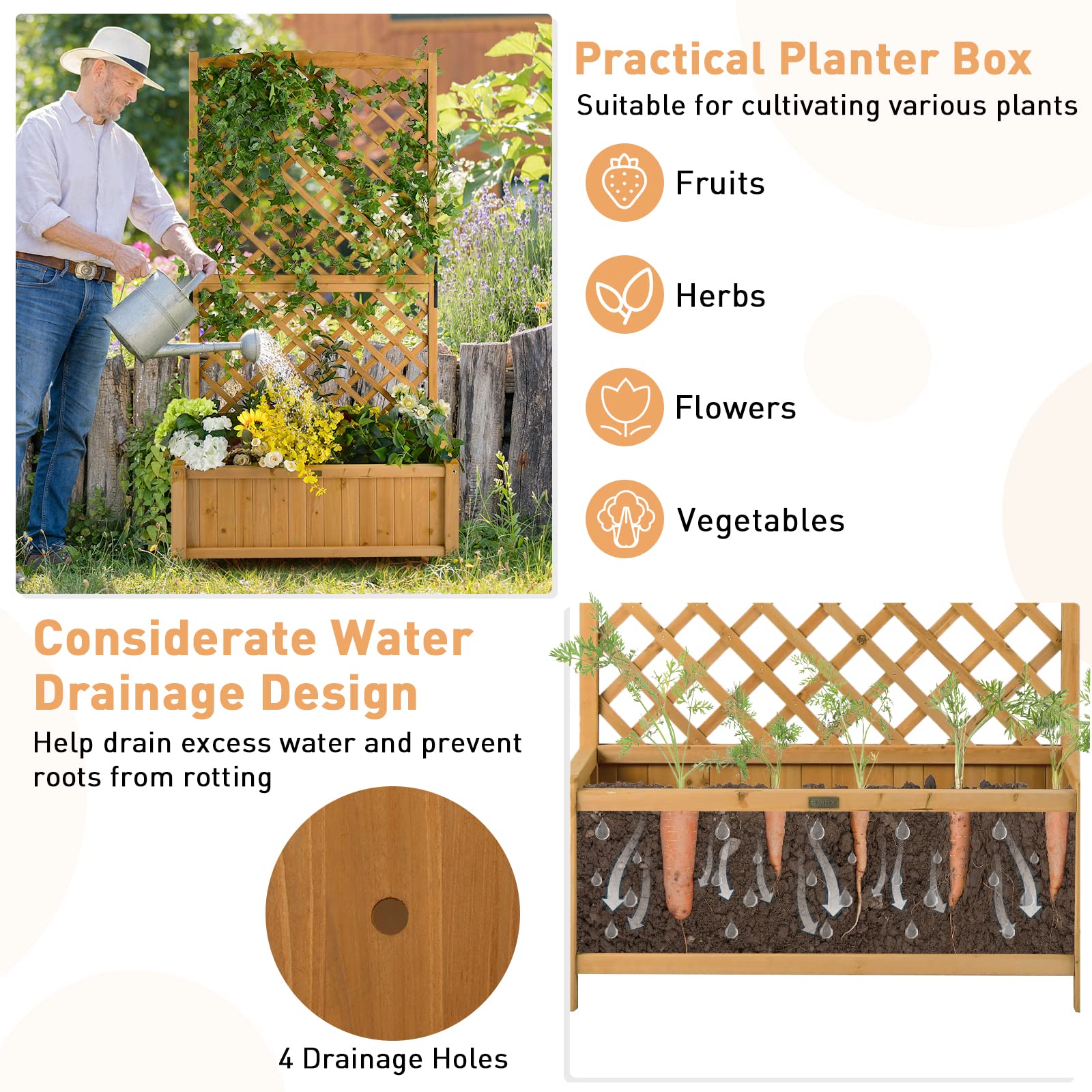Our tall standing raised garden bed measures 35.5inch x 17.5inch x 71inch (L x W x H), providing a large planting area for various plants. The trellis is suitable for climbing plants to grow up, and you can also add some decorations or hanging baskets to it. The large planter box is deep enough to grow flowers, herbs, vegetables, fruits, and more, meeting your different needs. Thanks to the considerate water drainage design, there is no need to worry about water logging or drying. More than that, the planter is crafted with 100% natural fir wood, which is deformation-resistant, weather-resistant, and durable, so this garden bed would be a perfect choice for any indoor and outdoor gardening. You can place it in the garden, patio, porch, balcony, and more, adding a touch of nature and vitality to your living space.