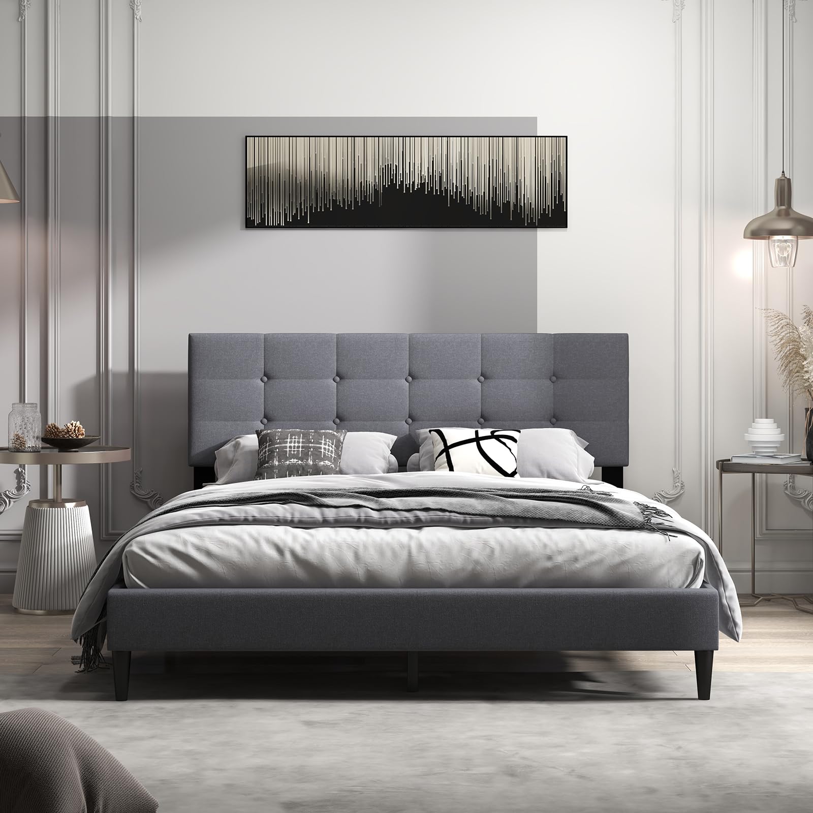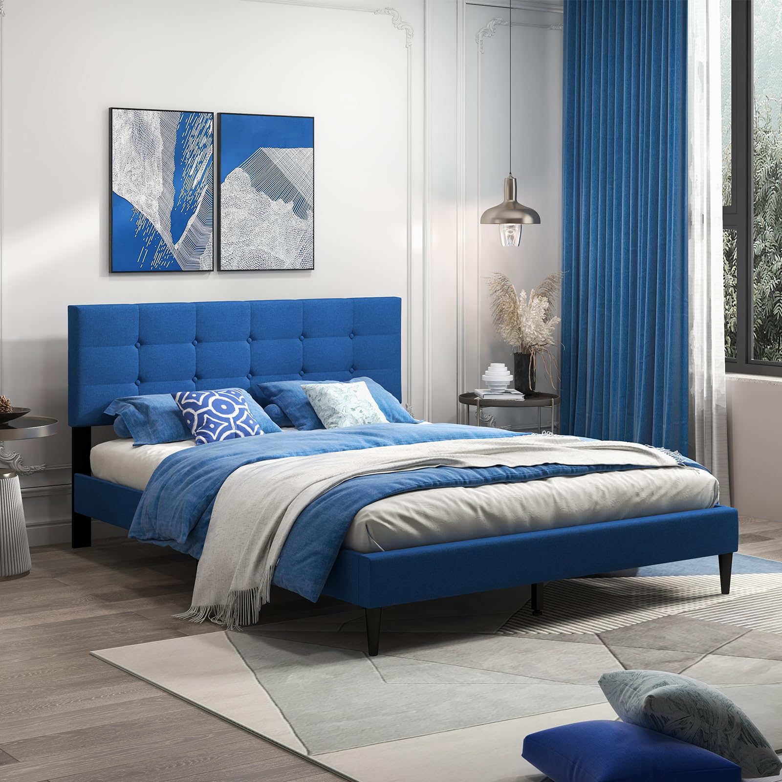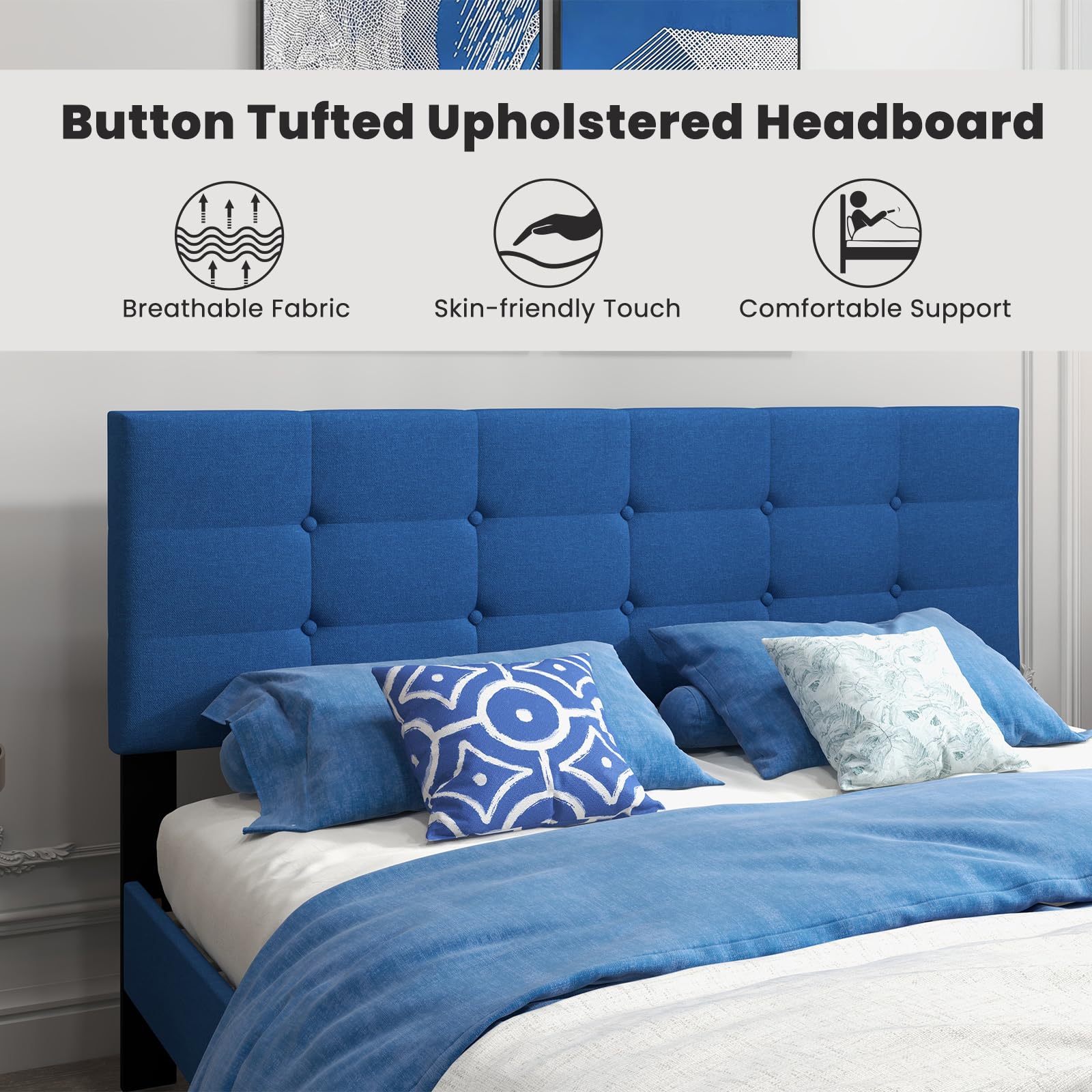 - Button Tufted Upholstered Headboard: The button tufted design adds a touch of sophistication and elegance to the bed frame. The upholstered headboard is covered with breathable fabric and filled with high-density sponge padding, providing a skin-friendly touch and comfortable support for optimal relaxation.