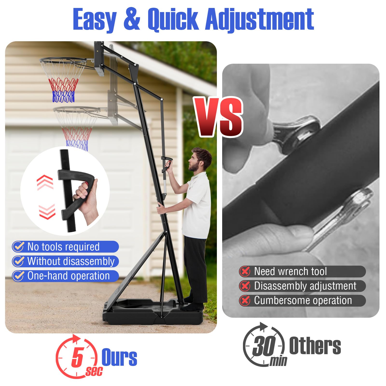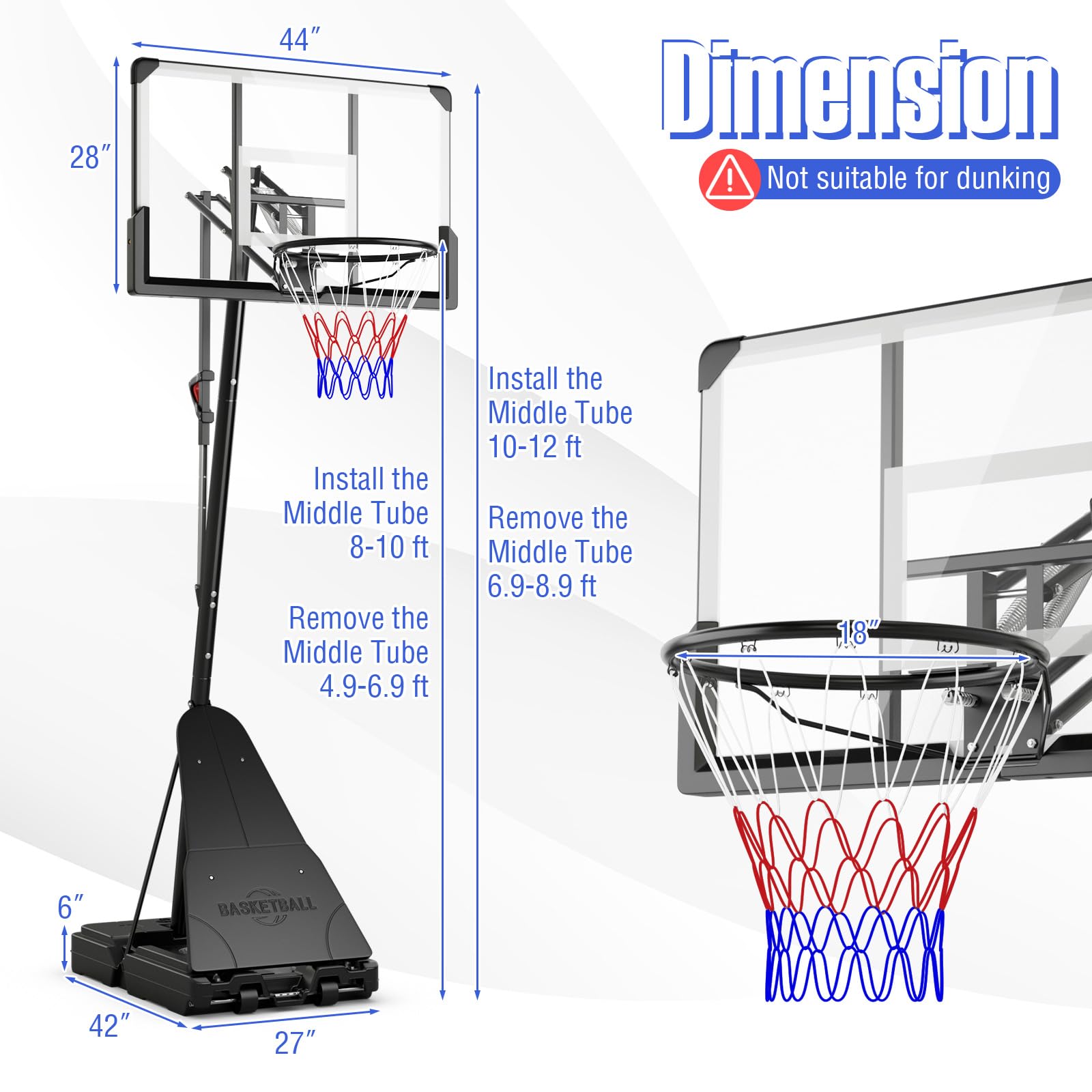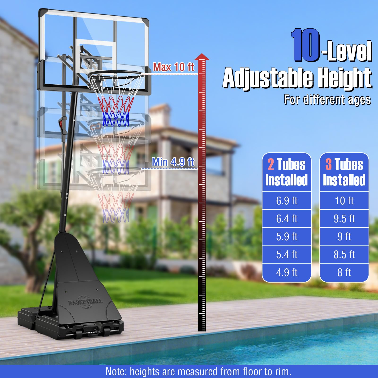 - [10-Level Adjustable Height]: This basketball hoop offers ultimate height adjustment for different ages, ranging from 4.9-6.9 ft (2 tubes installed), or from 8-10 ft (3 tubes installed). Note: heights are measured from floor to rim. No tools required for easy and quick adjustment, it is simple without disassembly and only needs one-hand operation.