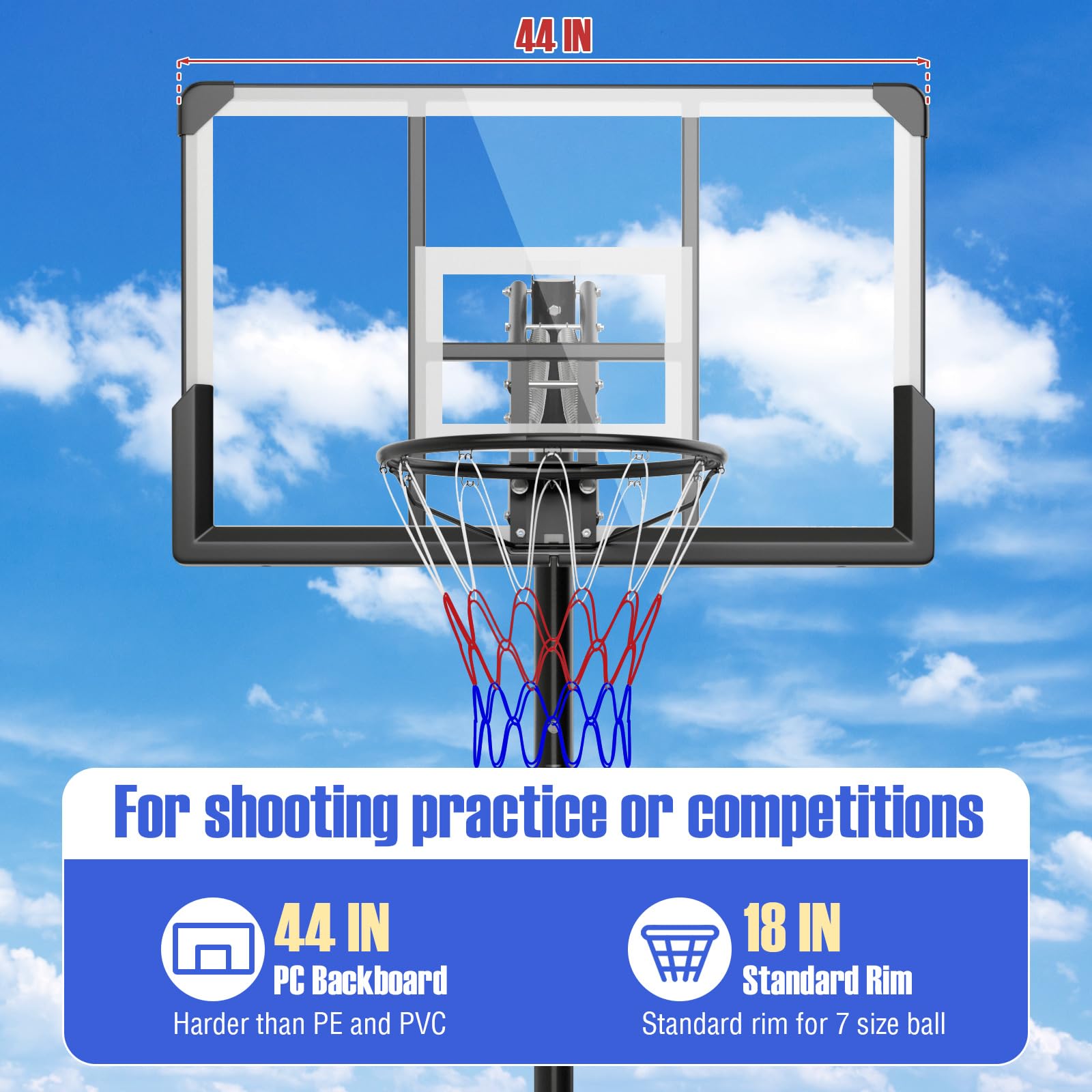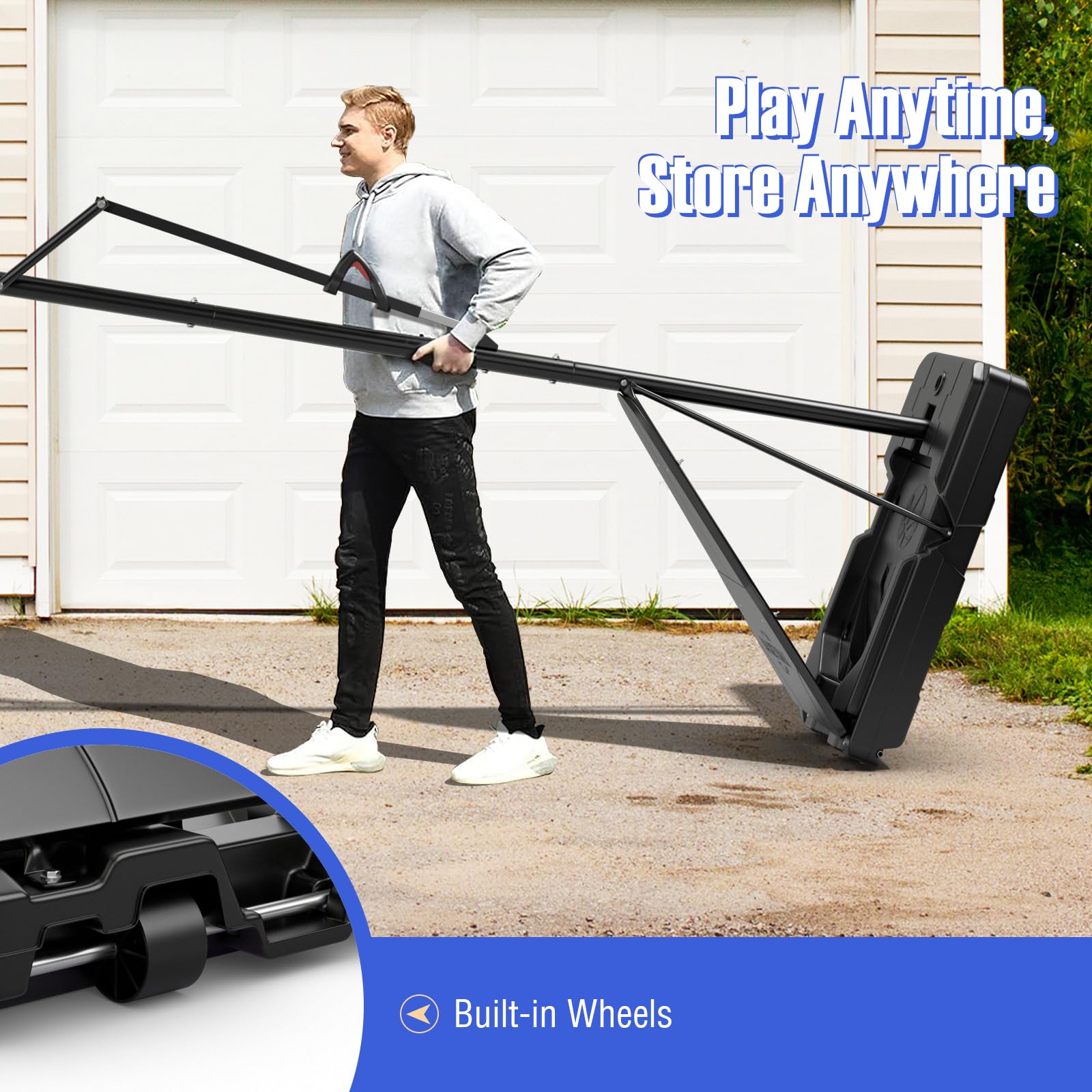- [Play Anytime, Store Anywhere]: Fitted with built-in wheels, this basketball stand can be comfortably relocated to any desired spot. Perfect for indoor and outdoor fun, this portable basketball hoop is suitable for your backyard, driveway, poolside, etc..