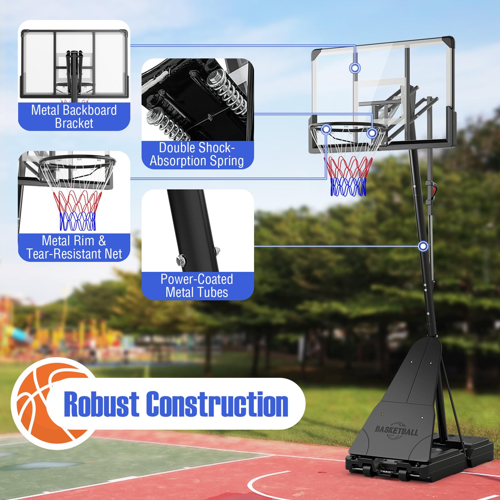 - [Robust Construction]: Constructed with powder-coated metal tubes (1" diameter), metal rim and tear-resistant net, this basketball hoop is built to withstand long-term use, allowing long-lasting outdoor sporting fun.