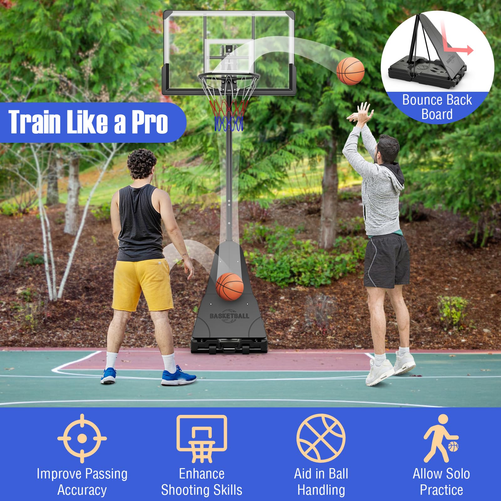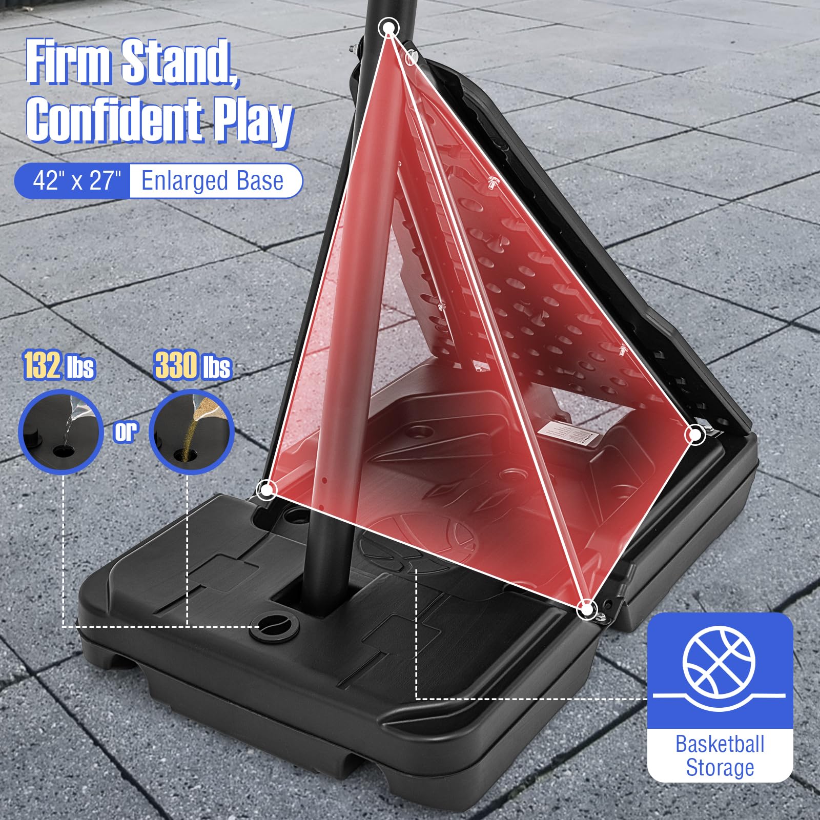 - [Firm Stand, Confident Play]: The 42" x 27" enlarged base can be filled with 132 lbs of water or 330 lbs of sand, anchoring the hoop firmly in place. Its triangular structure enhances stability. Moreover, you can train like a pro with the integrated bounce back board.