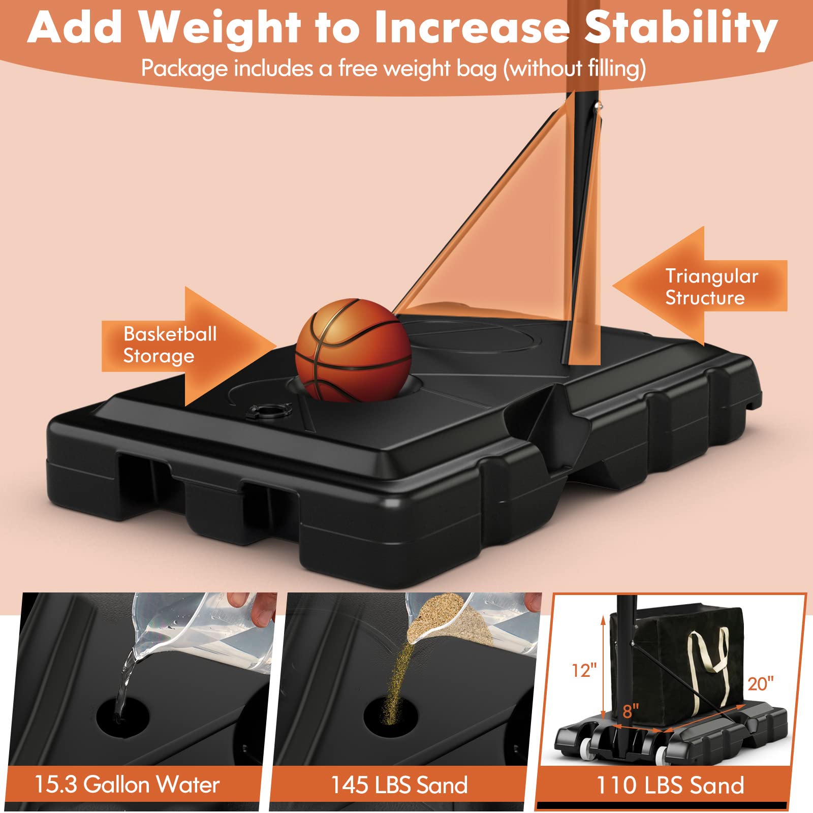 - [Add Weight to Increase Stability]: The solid PE base can be filled up to 143.3 lbs sand or 15.3 gallon water to ensure better stability, avoiding tip-over accidents during every shooting. Besides, you can add included hoop secure bag with sand (holding up to 110 lbs sand) and put the bag on the base, which is more convenient and easier to maintain.