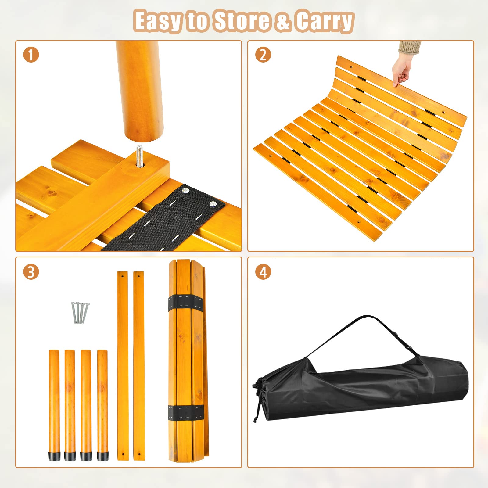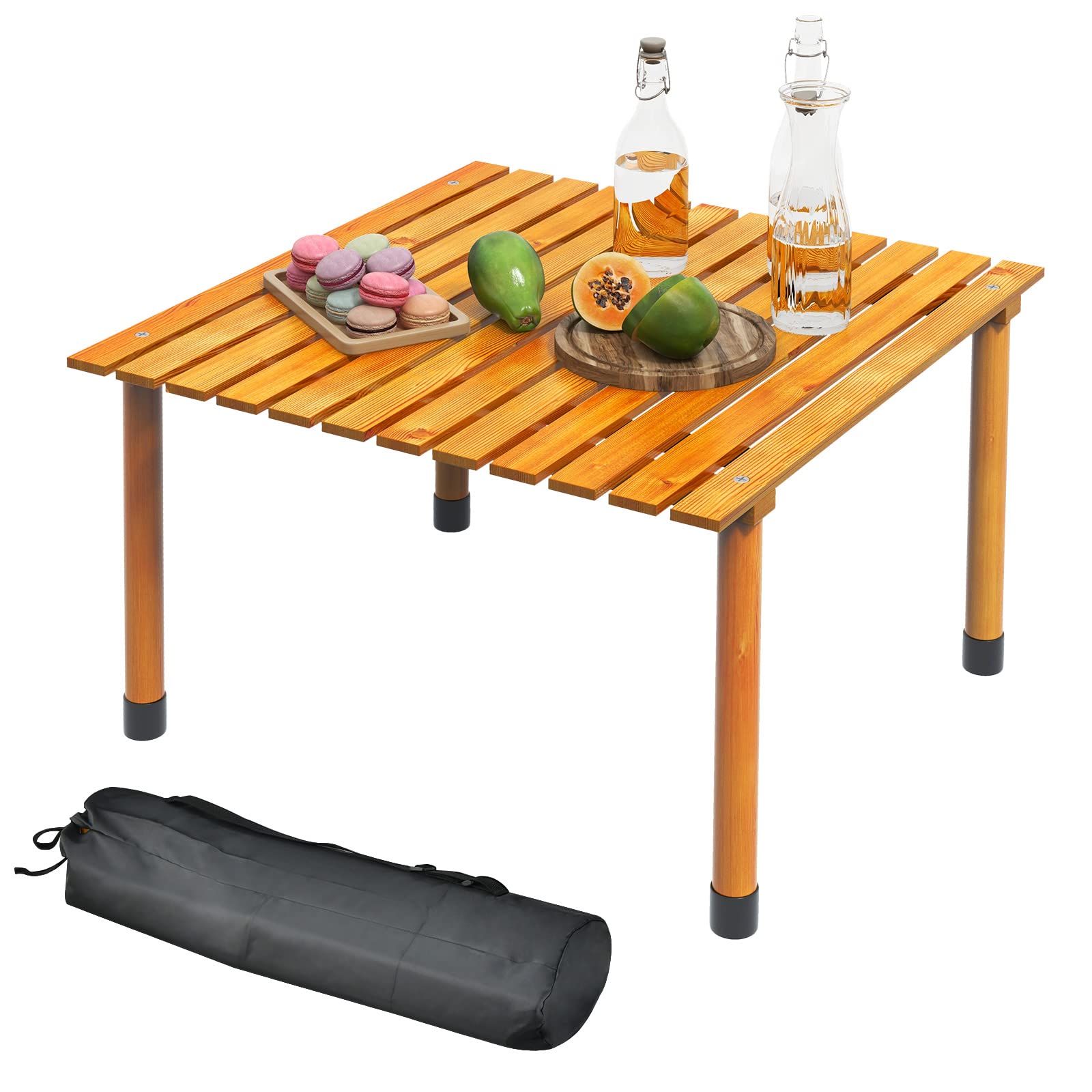 This camping table features a portable frame consisting of a roll-up table top and detachable legs. All components can be put in the carrying bag to store under the couch or taken along in the car. The tabletop is crafted from natural fir wood, which is resistant to bending, warping, and cracking. Plus, it provides ample storage space for your snacks and beverages. What's more, the reinforced legs and non-slip feet help to improve stability. Take it with you to the camping, picnic, fishing, hiking, or any other activity. Have a great time outdoors with our camping table!