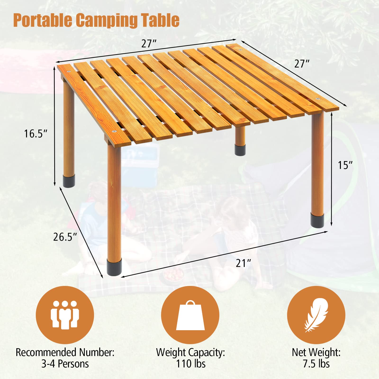 - Spacious Tabletop: This portable camping table features a spacious top with extra large capacity, measuring 27" x 27" (L x W). It can hold your snacks, fruits, drinks, kebabs, magazines, and other items. 3-4 people are able to sit comfortably around the table without feeling crowded.