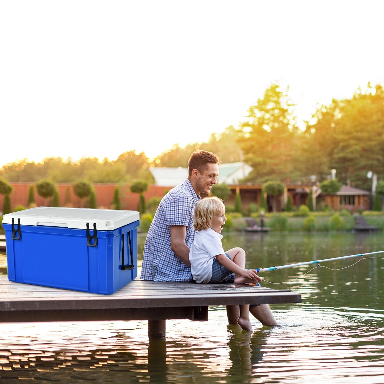 Our portable cooler will help you camp, picnic or fish even longer. With high-quality insulation materials of the internal wall and top lid, this cooler can effectively hold ice up to 3-4 days. It has a large capacity of 79 quarts for holding your sodas, beers, snacks, etc. Wherever you decide to go, the lightweight body and nylon rope handle allow you to reach your destination easily. In addition, the sturdy PE materials and a tight seal with double latches enable the cooler to withstand the rigors of the journey. Don't hesitate to purchase one for your next fun adventure!