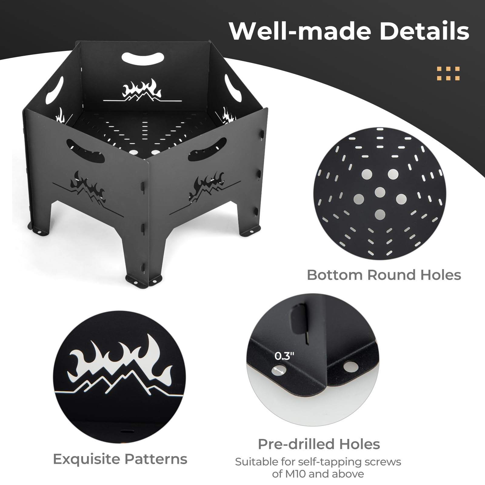 Convenience is key, which is why our camping fire pit features a collapsible design and includes a carrying bag for easy storage and transportation. Not only is it practical, but it's also built to withstand the test of time thanks to the rustproof and sturdy carbon steel material, which also endow itself with rustproof and high-temperature resistance performance. What's more, efficient wood burning is made possible by the strategically placed bottom holes that facilitate optimal air circulation. In addition to the wood, this fire pit also accepts other fuels, such as pellets and charcoals.