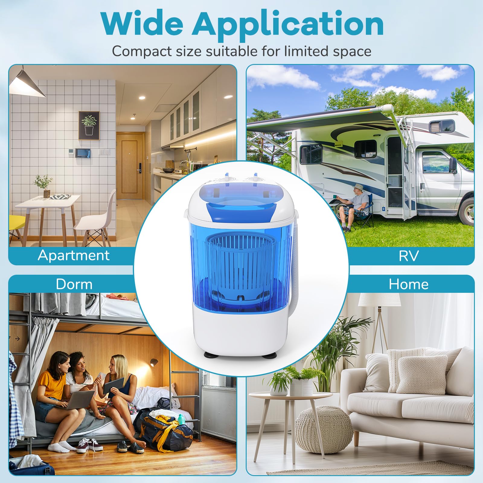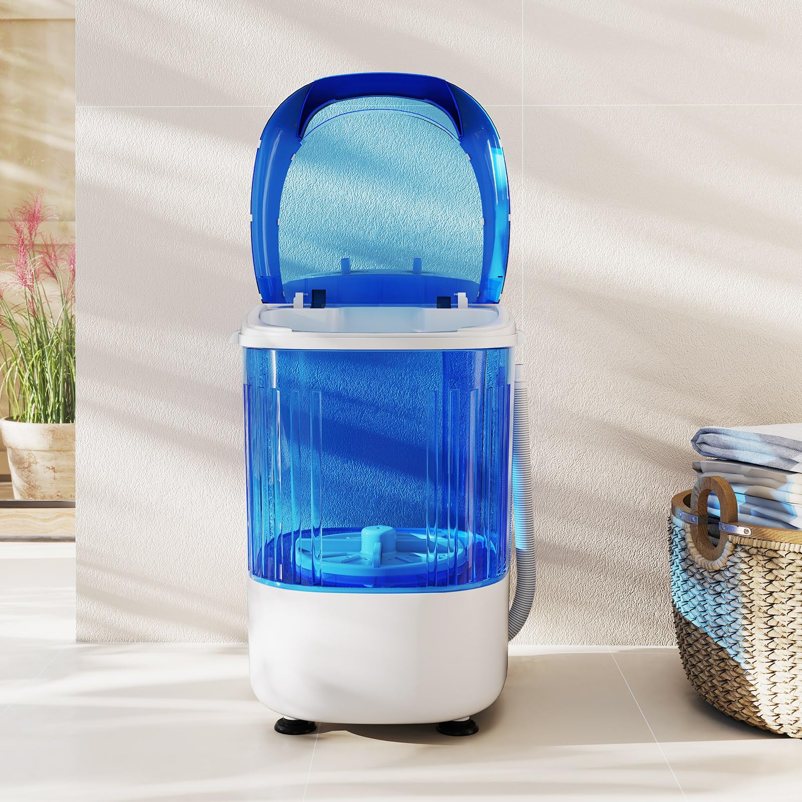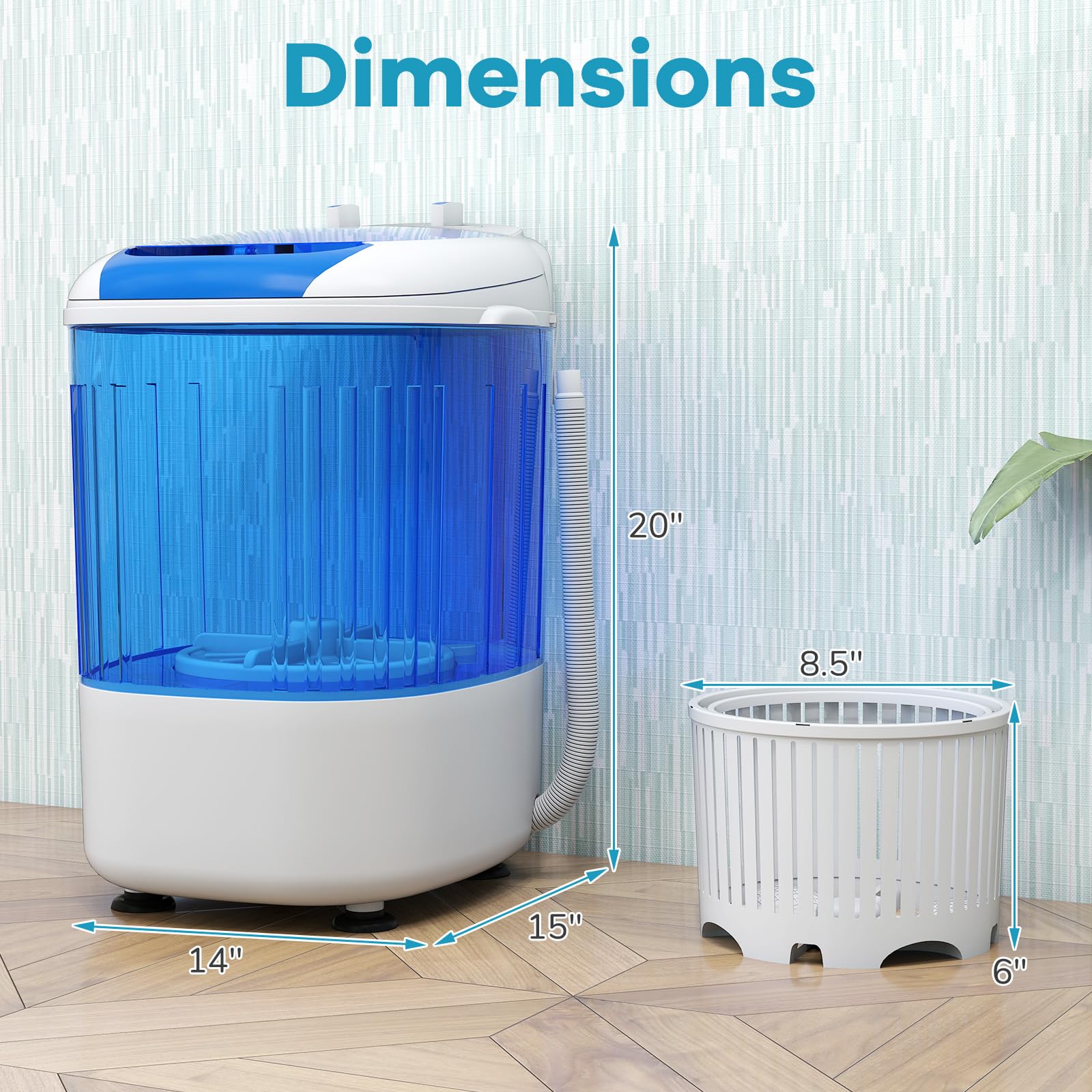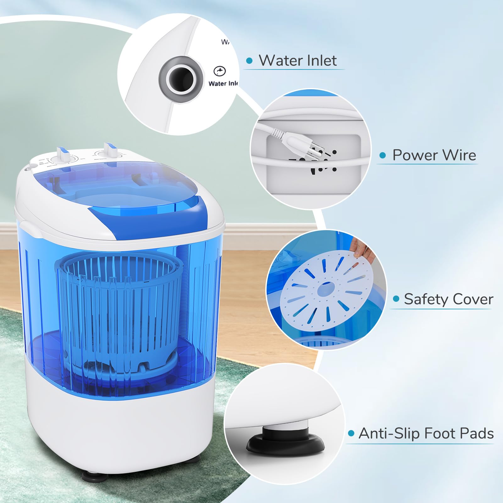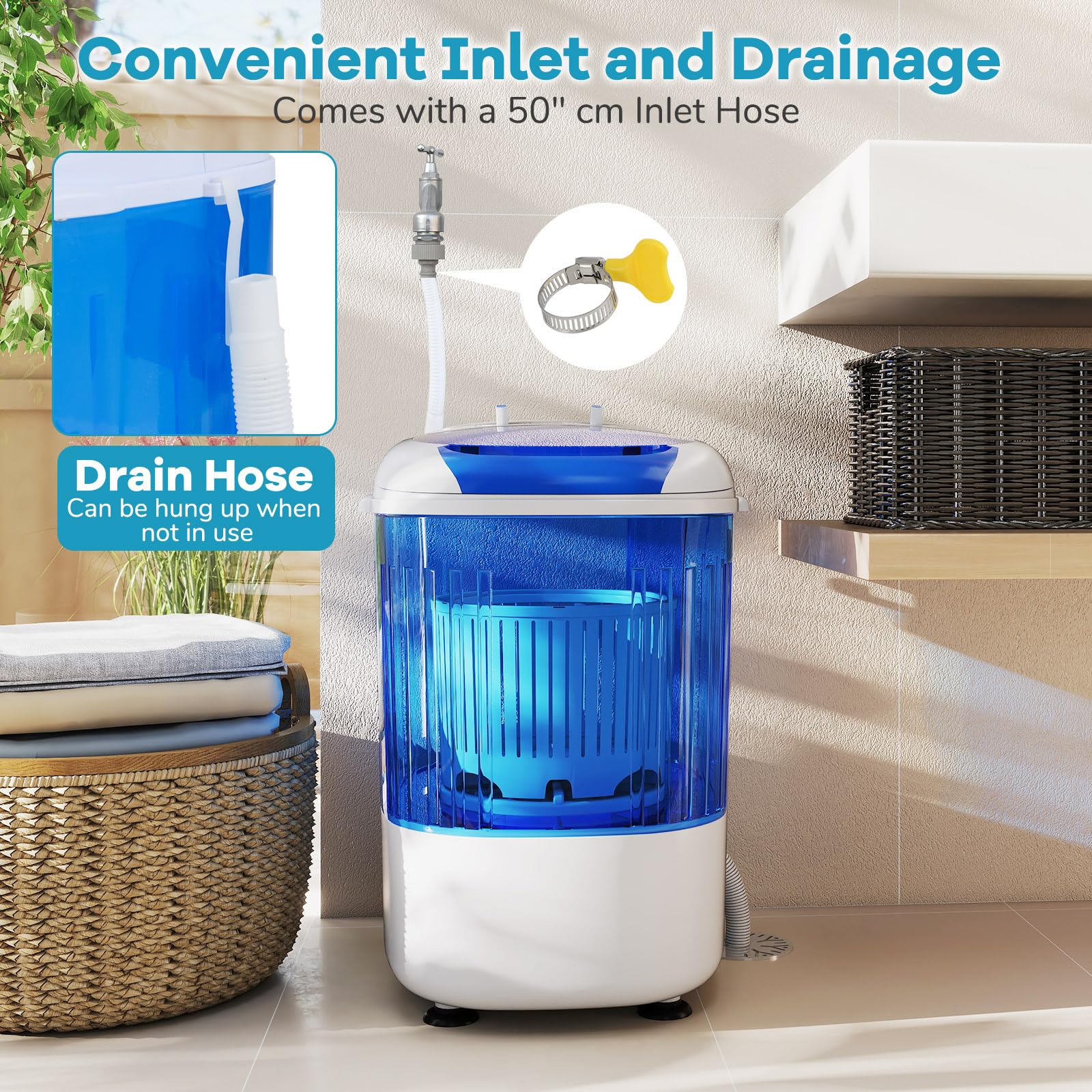 Perfect for small spaces like apartments, dorms, or RVs, this compact machine is easy to carry and store. Not only does it offer a hefty 5.5 lbs washing capacity and a 1.1 lbs spin-dry capacity, ideal for handling small items such as underwear, baby clothes, and towels, but it also simplifies your laundry routine with dual knobs that control a 15-minute wash and a 6-minute spin cycle. Equipped with a convenient 50" inlet hose that attaches directly to your faucet and a built-in drain hose for easy setup and cleanup, this washing machine is designed to make your life easier. Perfect for anyone looking for a practical, space-saving solution to daily laundry needs!