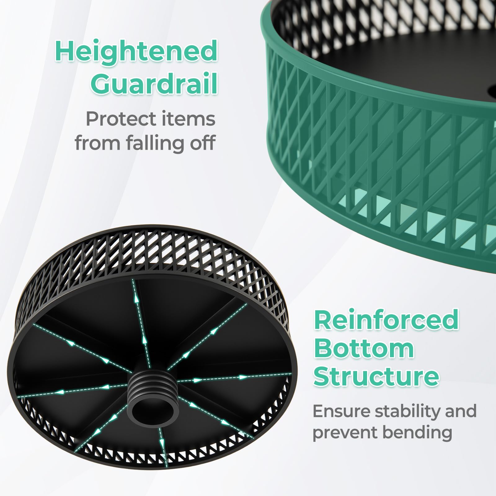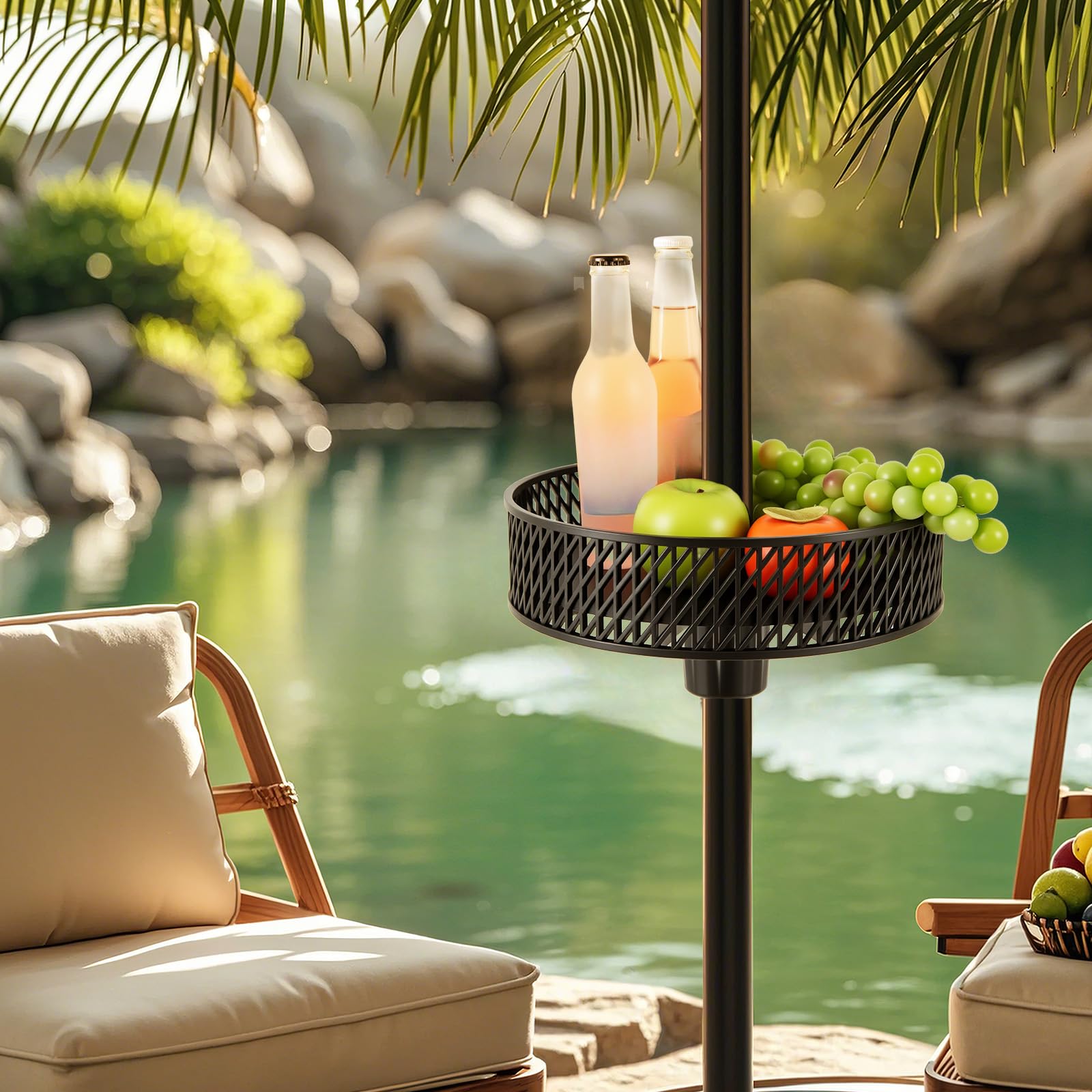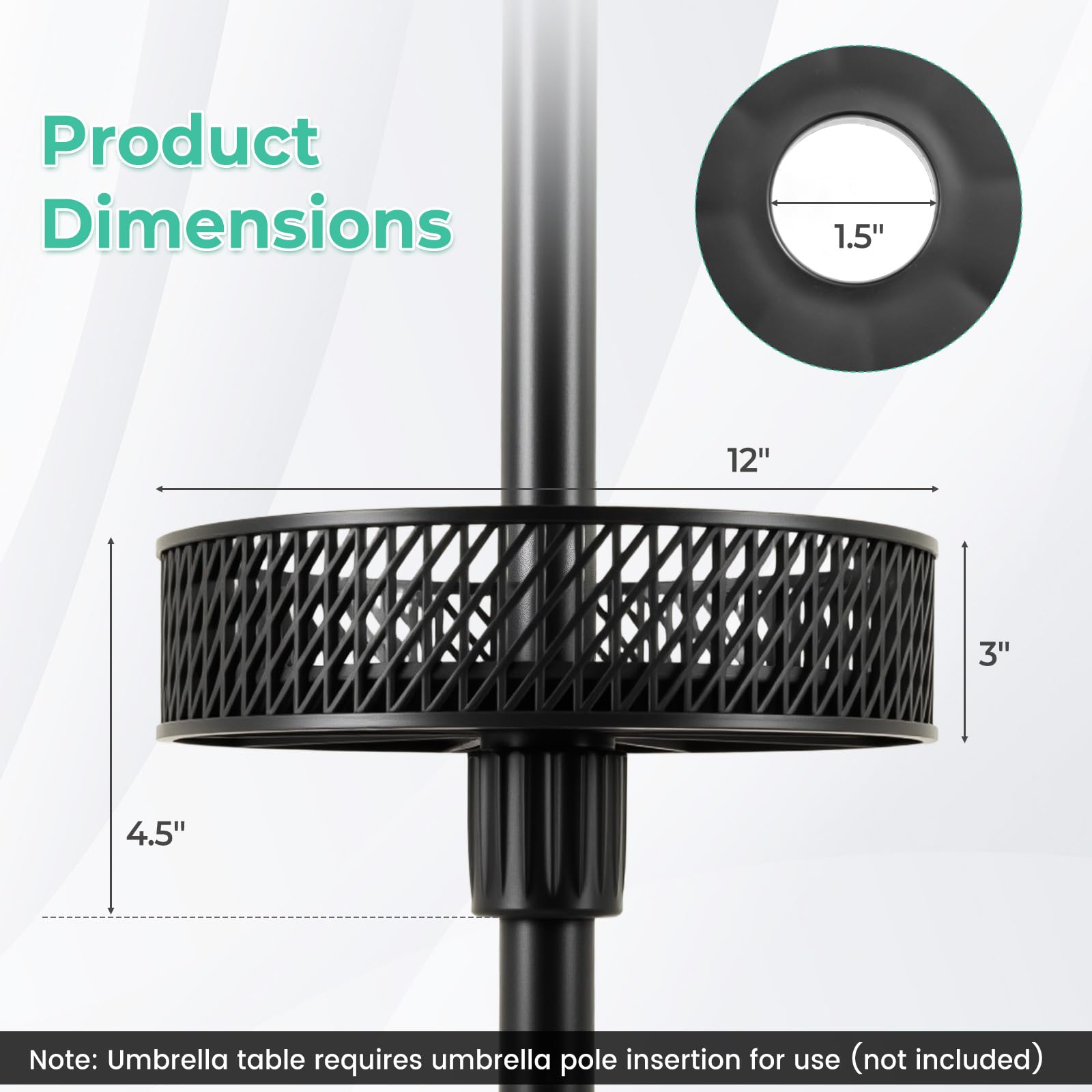 Our patio umbrella table tray measures 12" x 4.5" (Dia. x H) and comes with 3 hole rings, which are suitable for patio umbrella poles of 1.5"/1.34"/1.26" diameters. Complete with a raised guardrail, it could safely hold your drinks, snacks, and decorations. Installation is also a breeze, allowing you to set up it swiftly without any need for additional tools. Whether setting it beside a pool, on a sunny beach, or in a tranquil garden, our tray is the perfect companion to any outdoor setting.