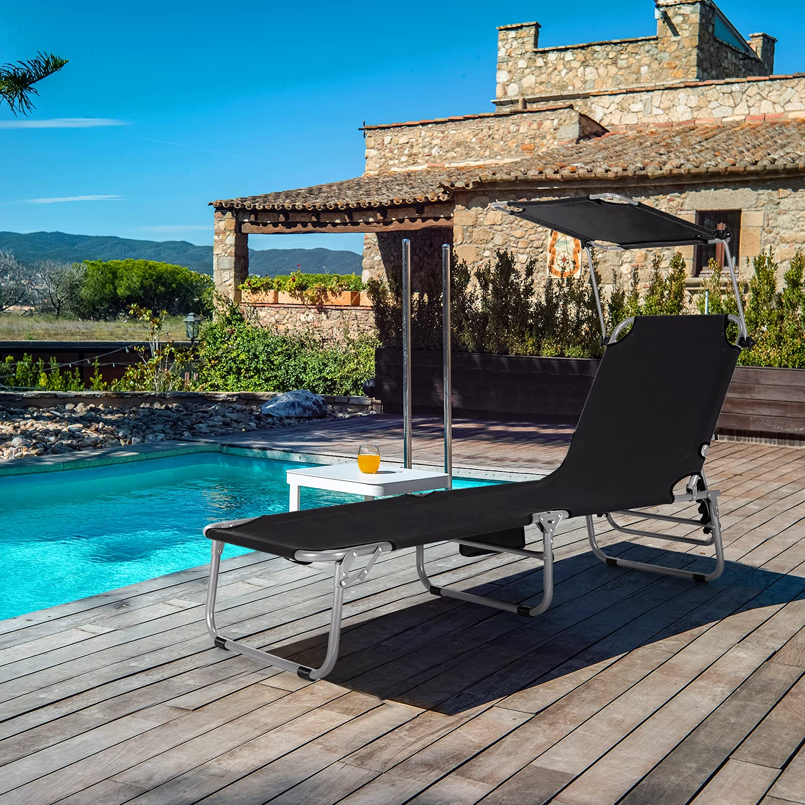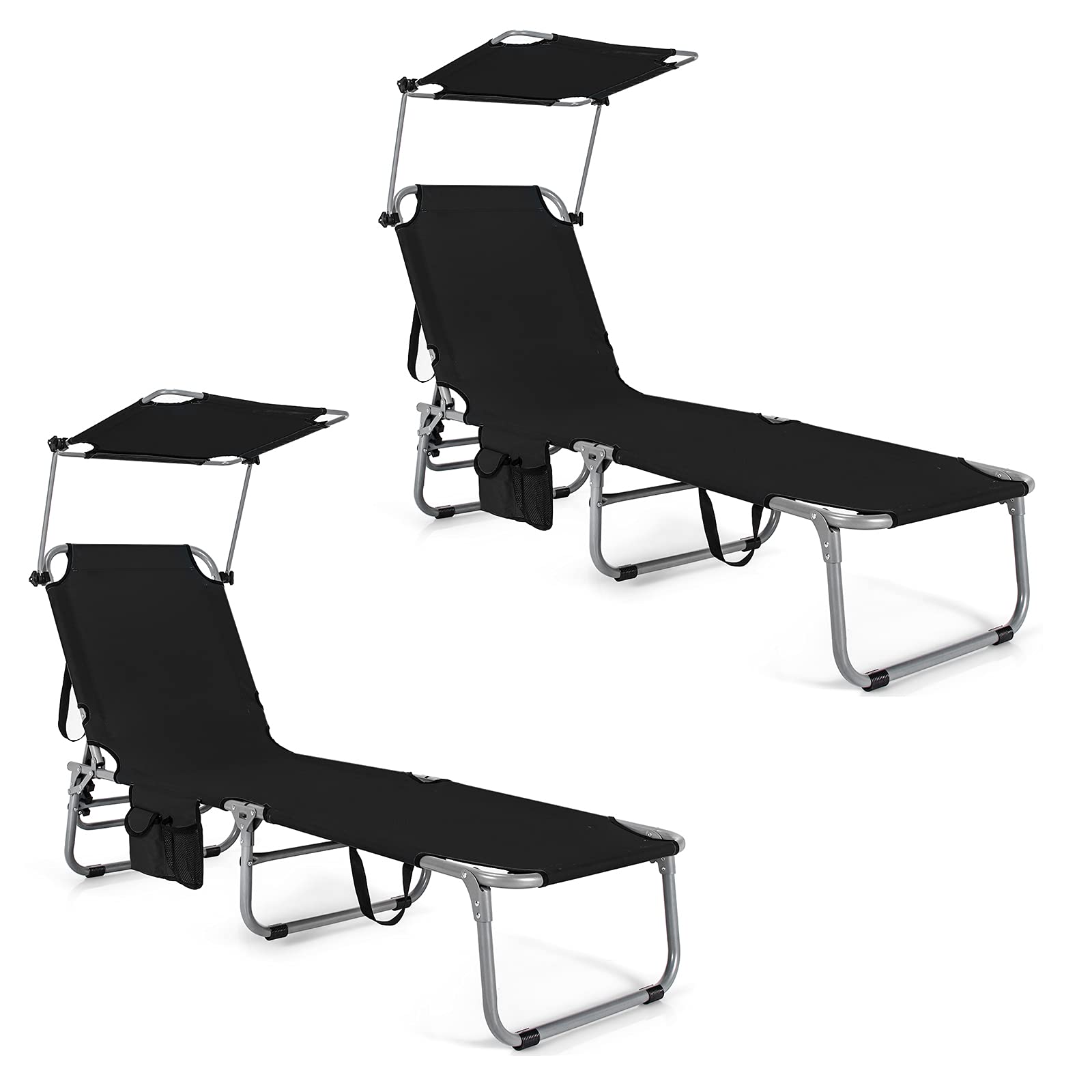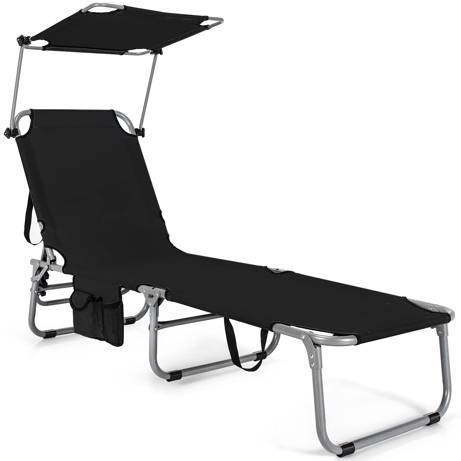 Coming with a 5-position adjustable backrest and 360 degree rotatable canopy shade, this outdoor recliner allows you adjust it with ease to meet your different needs. When you are lying, the side storage pocket can accommodate your different items and make them within reach. Made of breathable oxford fabric and anti-rust steel frame, this premium lounge chair not only offers a comfortable lying experience, but supports up to 330 lbs for strong loading capacity. Furthermore, the foldable design and included hand ropes make this reclining chair easy to store and carry which is perfect for different places.