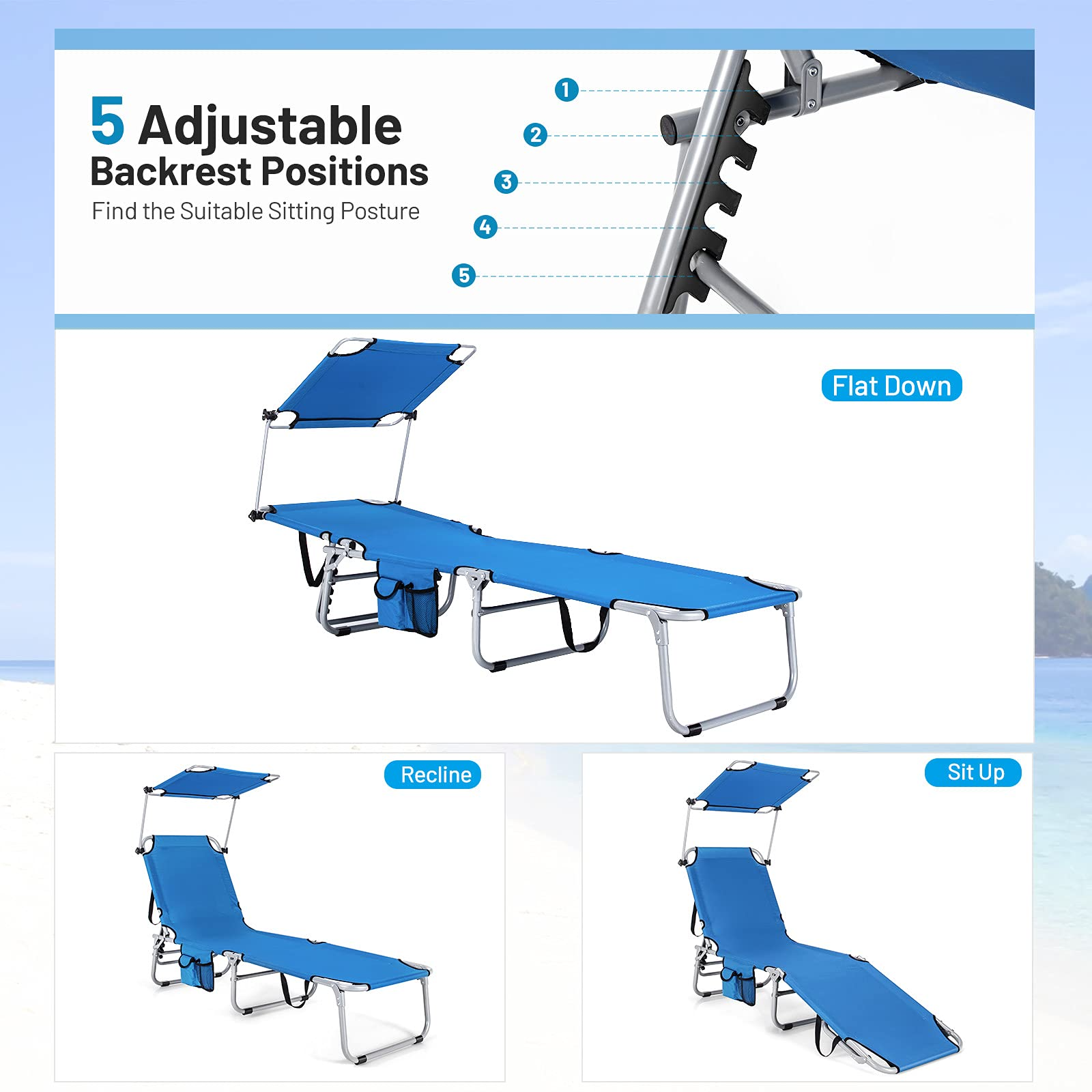 - 5 Adjustable Backrest: Featuring 5 different backrest positions, this outdoor chaise lounge chair meets your various sitting posture needs, such as sitting up, reclining and laying down so that you are able to find a suitable sitting position for maximum comfort and relaxation.