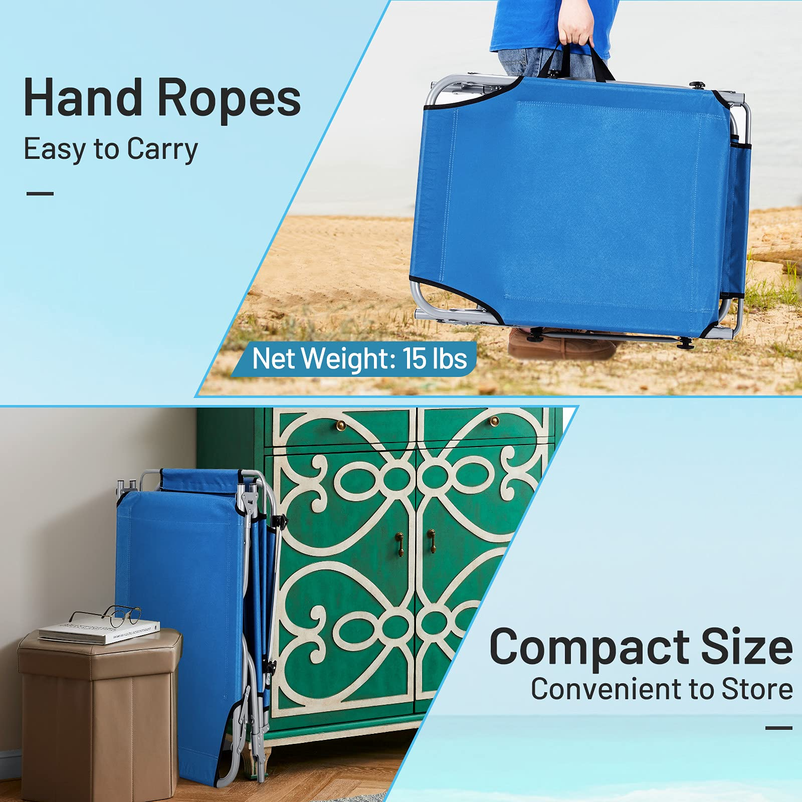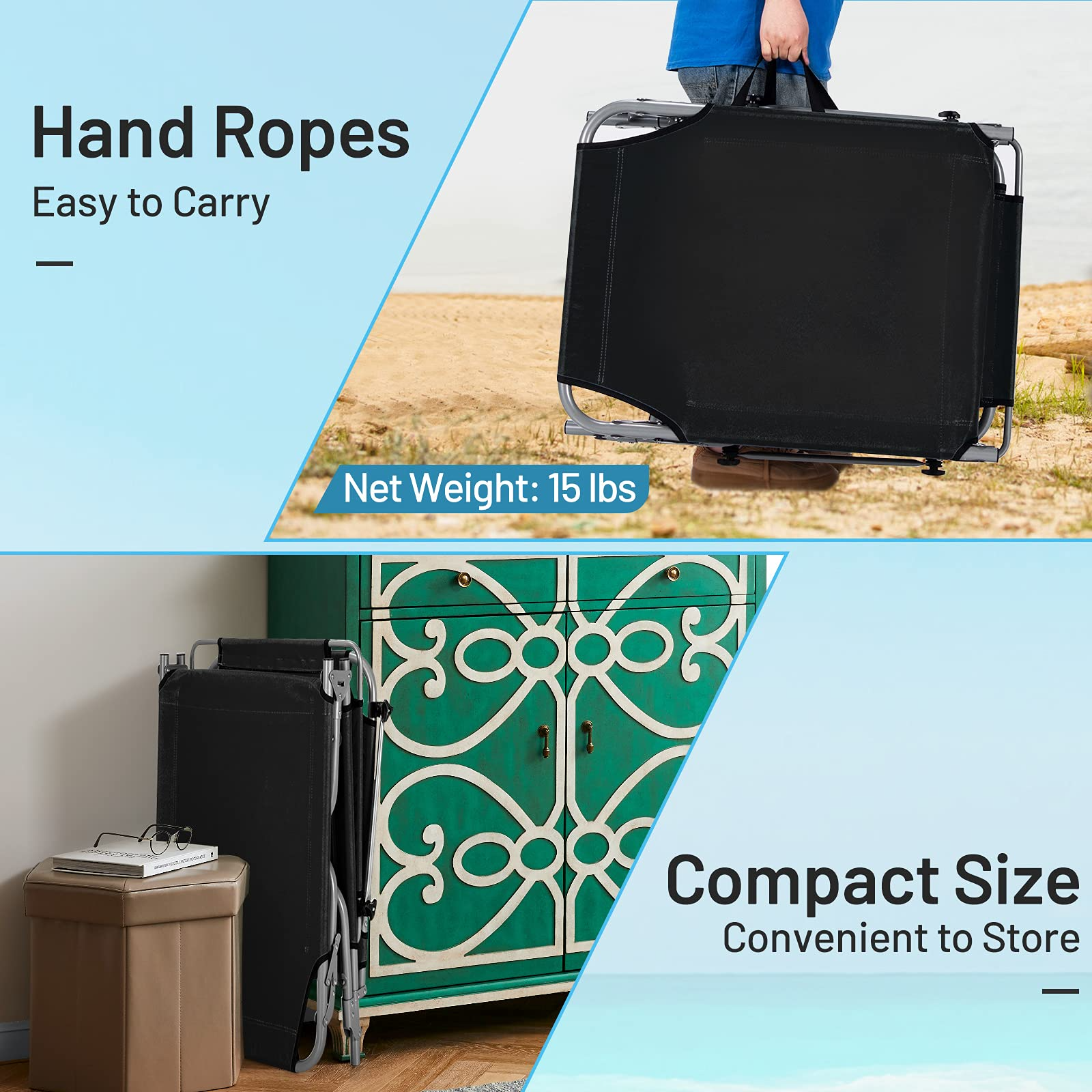 - Foldable & Portable Design: Thanks to its foldable and lightweight design, this premium reclining chair is suitable for different places, such as poolside, beach, patio and garden, etc. Meanwhile, the hand ropes can help to carry it more conveniently. And it can be stored easily for saving your space.