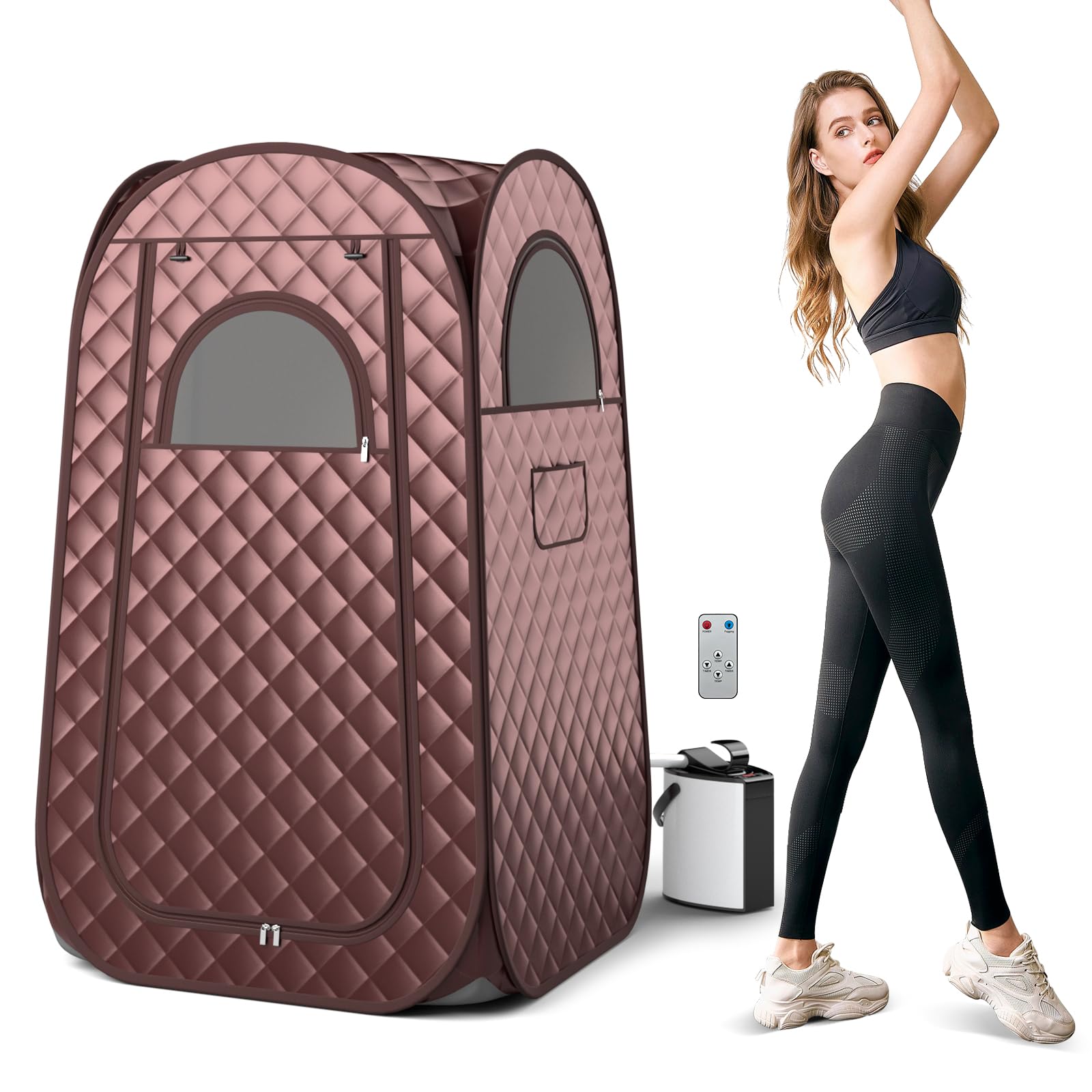 Enhancing skin absorption of mist, this portable sauna tent offers a fogging mode, and you can customize the sauna experiences by adding vinegar, ginger, or salt. Control options include the remote control and the control panel. With 9-level temperature control from 95�H to 145.5�H, it provides efficient heating and can ease physical pain, relieve fatigue, or reduce stress. Moreover, it has a 9-level timer to ensure safe auto shutoff. The 3L steam generator features an explosion-proof 2-layered tempered glass lid, anti-scalding handle, no dry heating function, and overheat protection. The 4-layered waterproof fabric provides soft touch and great durability. The roll-up zippered door ensures easy access and the zippered window promotes the air circulation. The package contains sweet accessories, like remote control, carrying bag, and more. By the way, the foldable chair can support up to 200 lbs.
