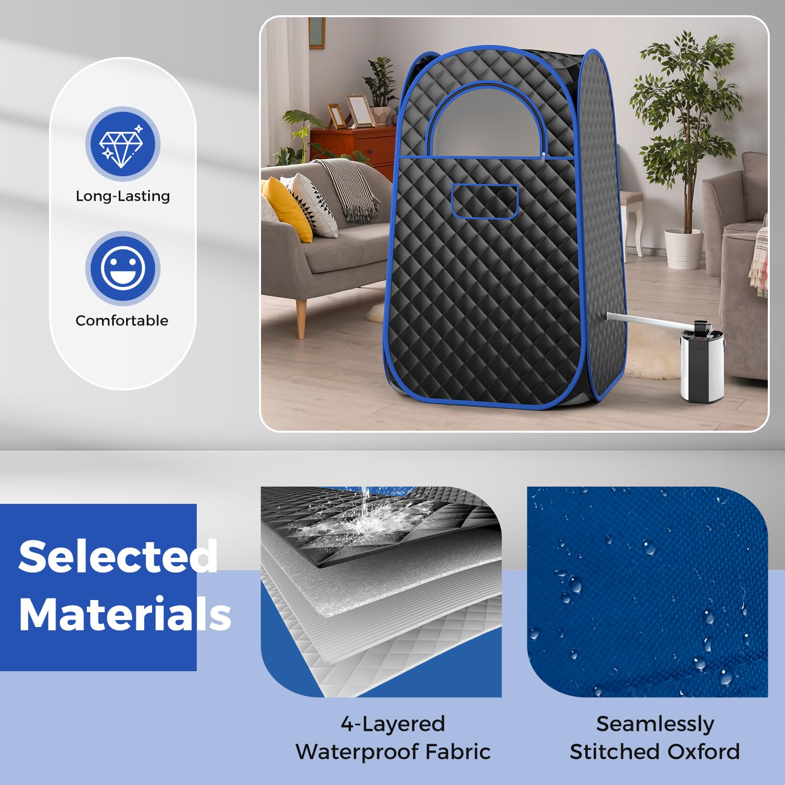 • Waterproof Fabric & Zippered Design: The 4-layered waterproof fabric of this portable sauna is comfortable and long-lasting, and the zippered door and window allow for easy access and air circulation.