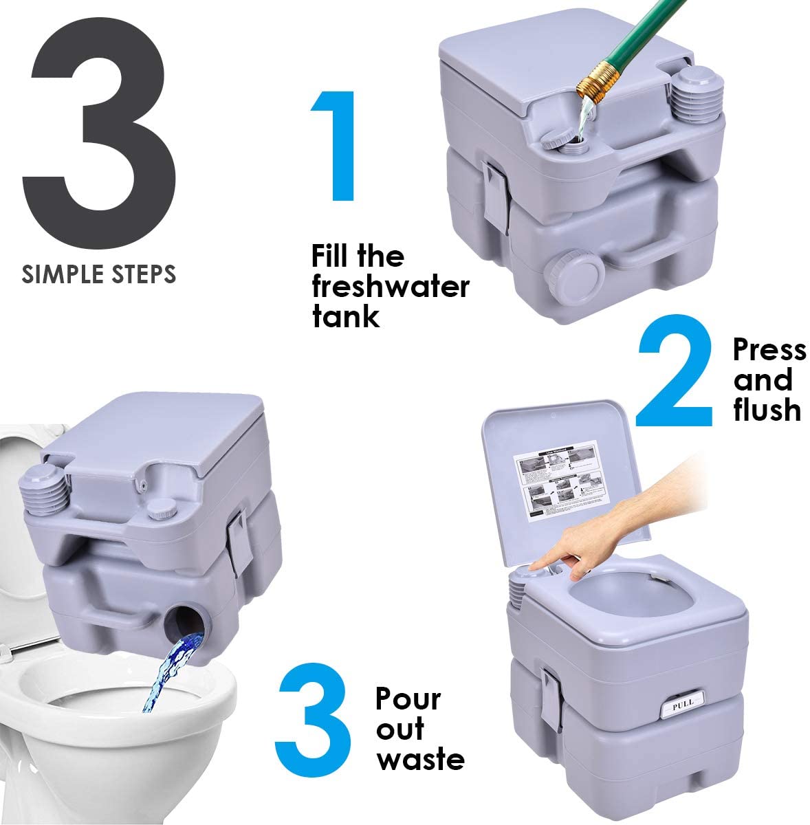 - With large 5 gallon waste capacity and half of fresh water capacity, you are able to feel free using it.