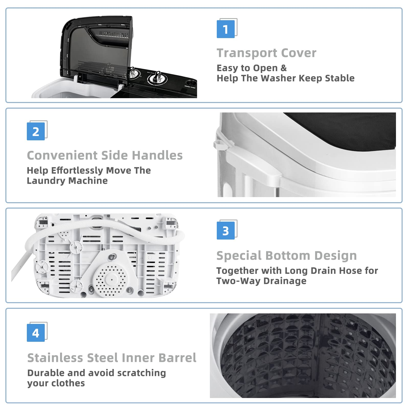• Thoughtful Details: Except for practical functions it provided, our 2-in-1 washing machine also offers other thoughtful designs. Top lid with elastic springs is very convenient to open and makes taking out clothes much easier. Also, the bottom storage space for drainpipe achieves neat arrangement and two-way drainage.
