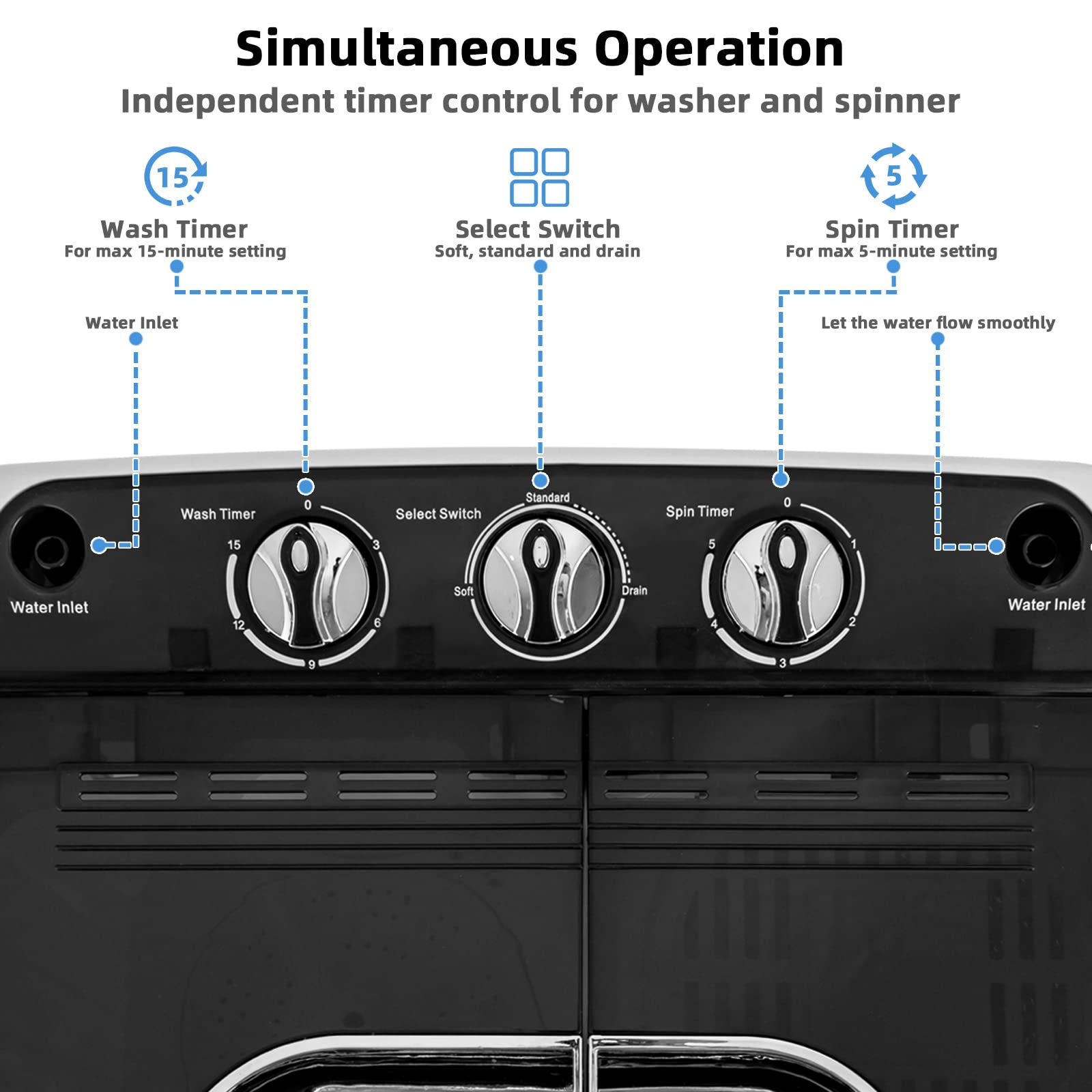 • Separate Time Control: On the control panel, you can choose 3 modes with the select switch and set operation time with washer timer (0-15 minutes) and spin timer (0-5 minutes). Depending on your requirements, the washing stage and spinner can operate separately or at the same time.