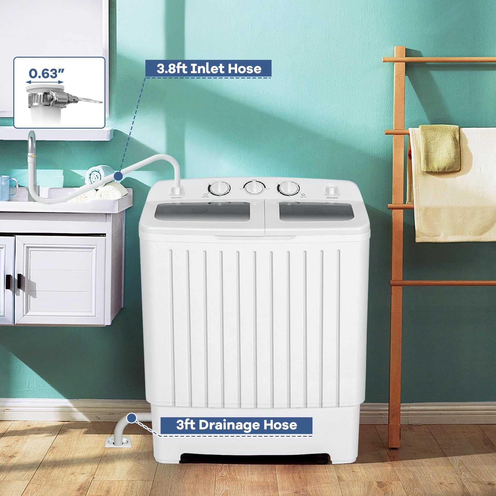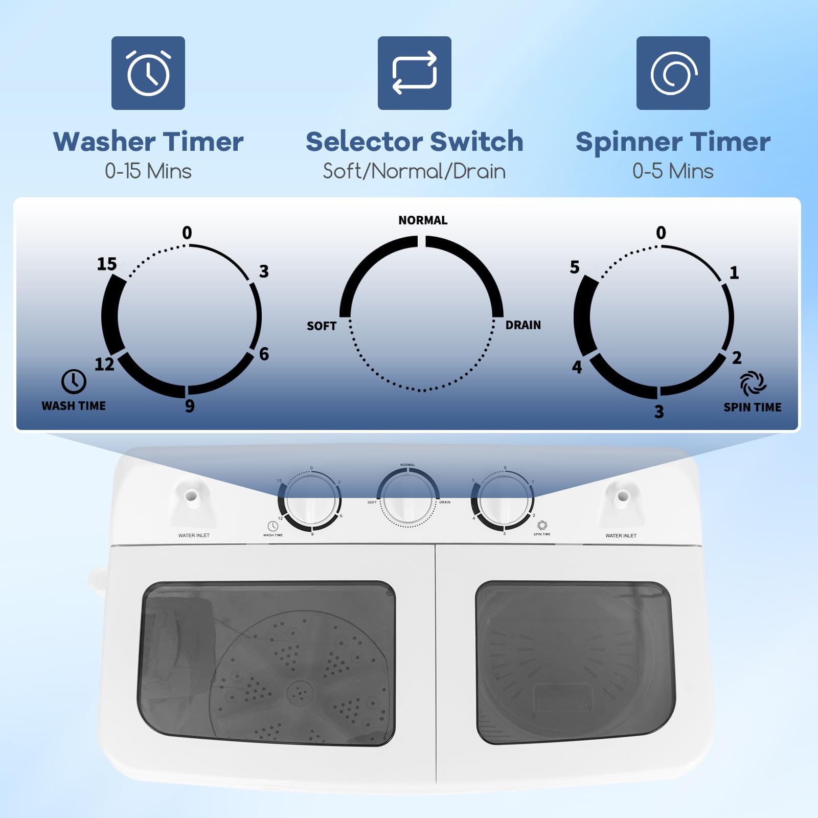 - 20LBS Capacity: The washing tub has a capacity of 12 lbs, while the spinner dryer can hold up to 8 lbs. You can adjust the rinse and spin cycles to suit your needs, allowing for flexibility in your laundry routine.