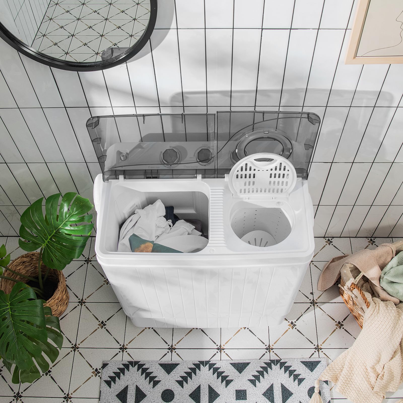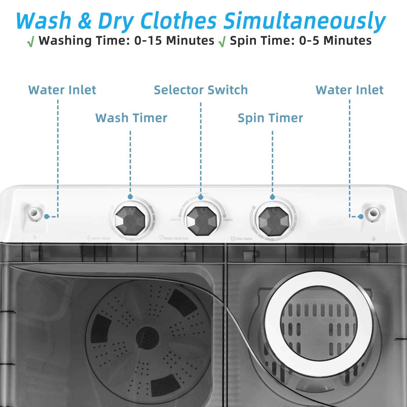 - [Twin Tub Design]: (18 lbs) and the spinning tub (8 lbs). Two tubs of this washing machine can work together or separately as you need.