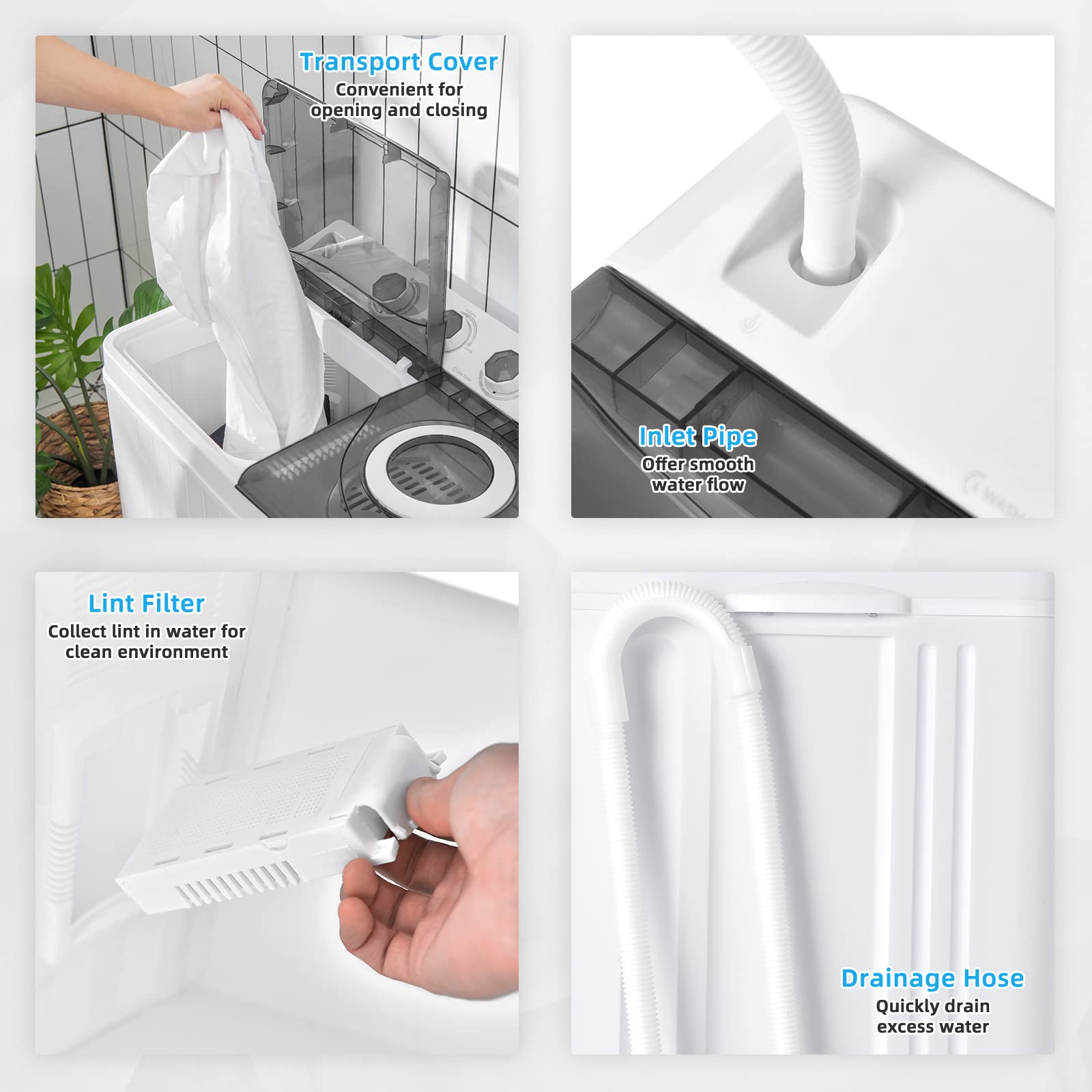 - [Highly Efficient Laundry]: Washing power (280W) and spinning power (140W) enables the portable washing machine to wash and spin fast. Pump drain also makes drain easy and powerful even drain container or hole is higher than the washer.
