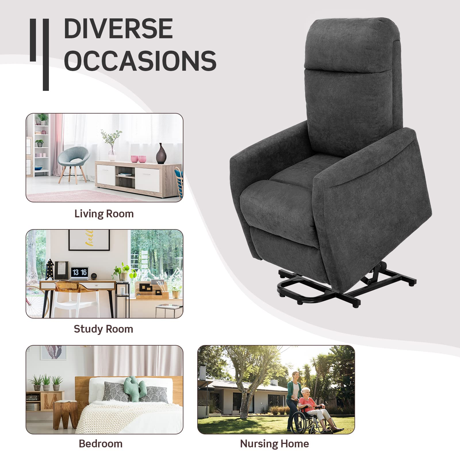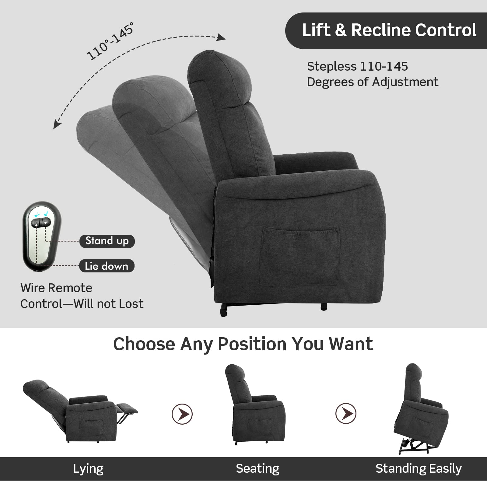 This electric recliner has a lift and recliner control through a wired remote which is easy to operate. The lift mode is an ideal helper for elderly people or people who suffer from joint problems and balance & spinal issues. And the recliner control enables the backrest to tilt with stepless 110-145 degrees of adjustment, choosing any position you want. The ergonomic design offers full support through the cranial area all the way down to the ankle area. The overstuffed chair is comfortably padded with a high-density sponge and soft fabric to ensure delightful seating. The frame is made of hard metal for quality and extended lifespan.