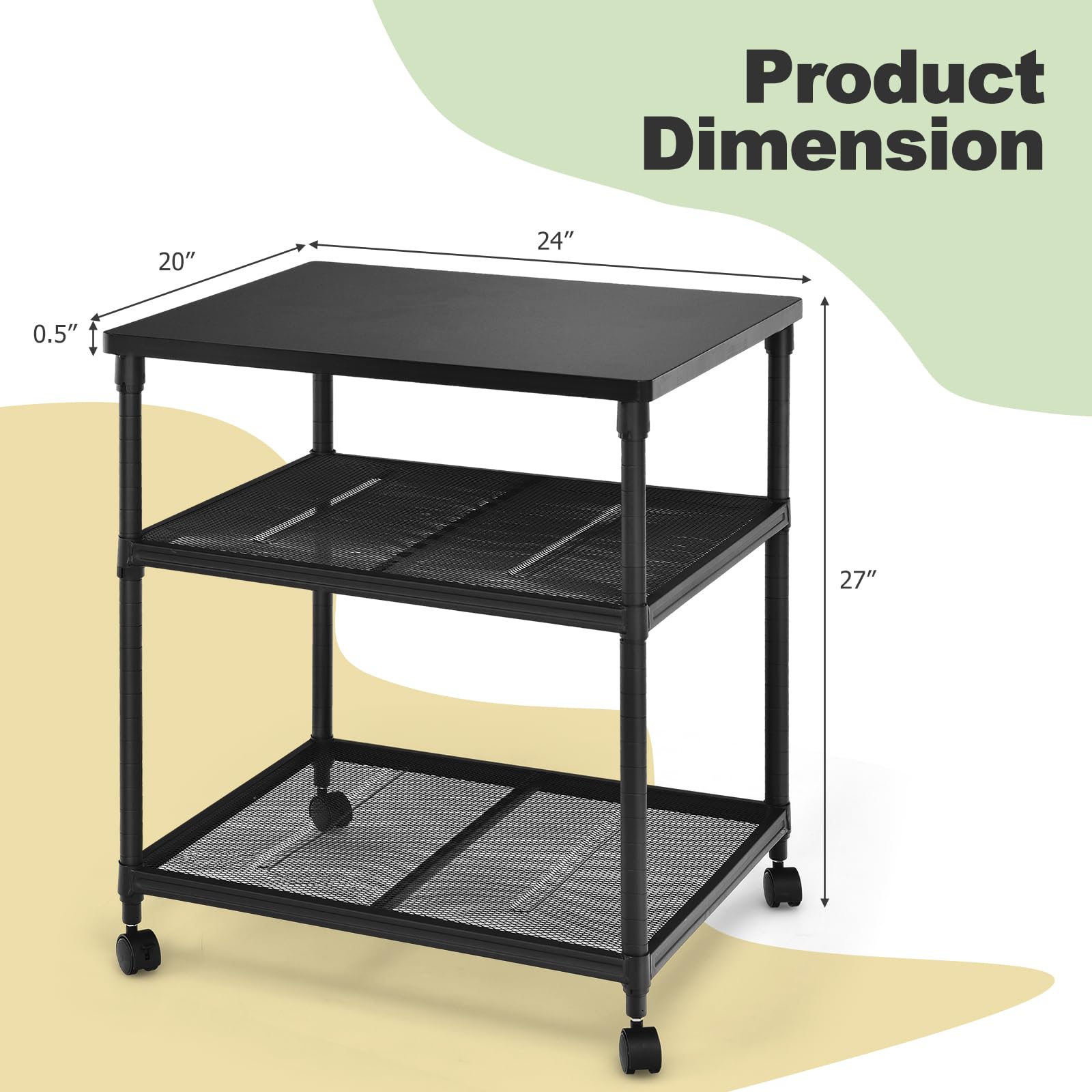 Enhance the organization of your office with our stylish 3-tier printer stand. This versatile stand provides ample storage space for your printer, books, files, and other essentials in a single, convenient location. The height-adjustable metal mesh shelves offer customization options, while the lockable casters guarantee stability and easy mobility.