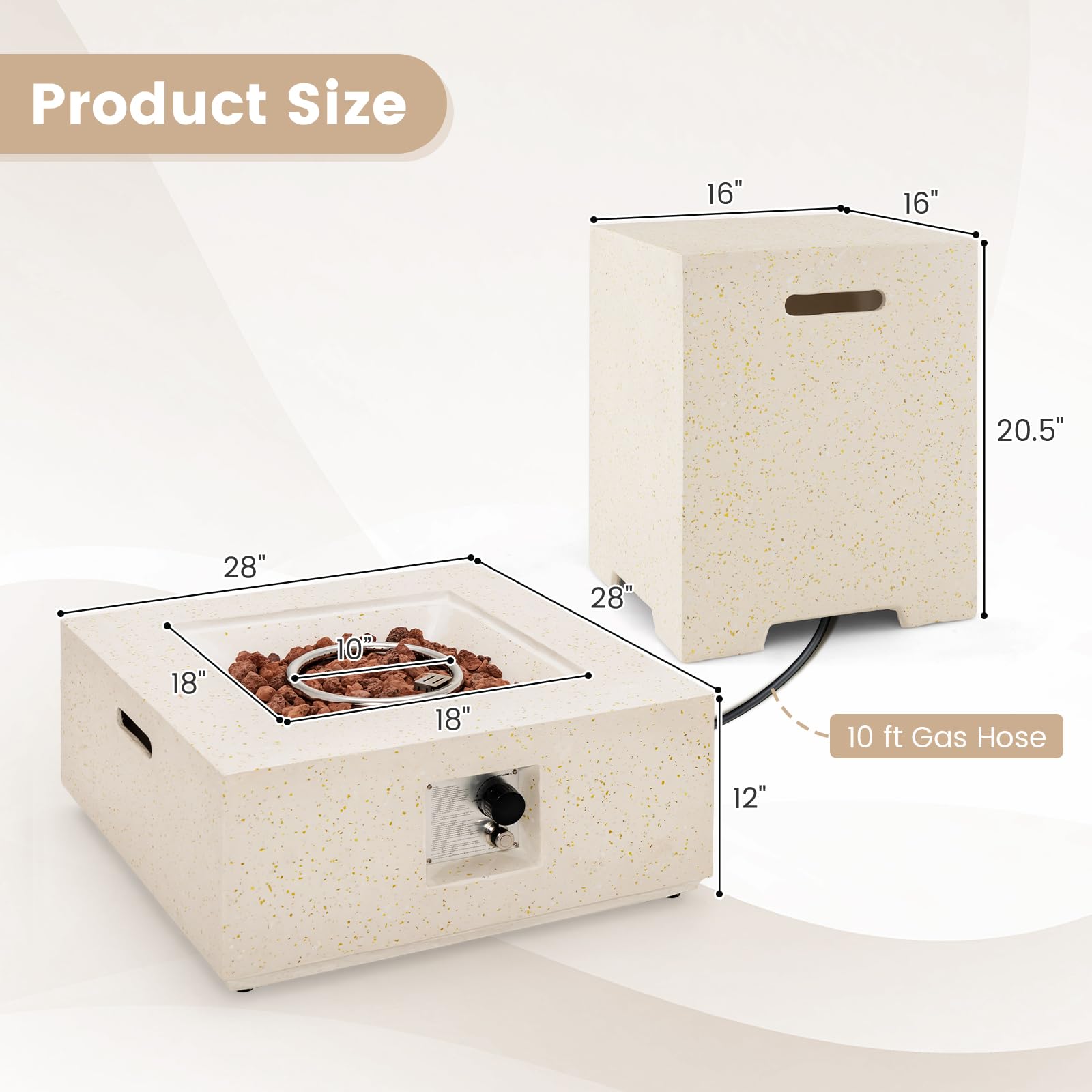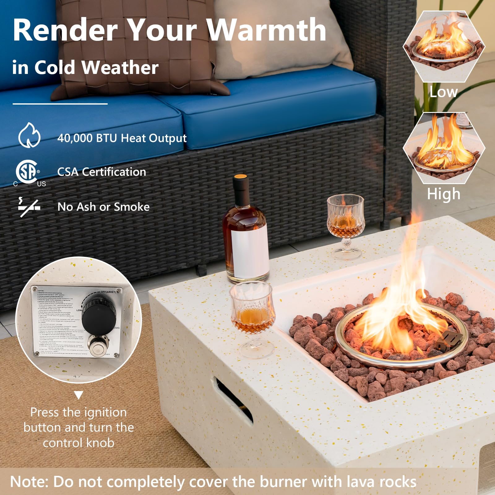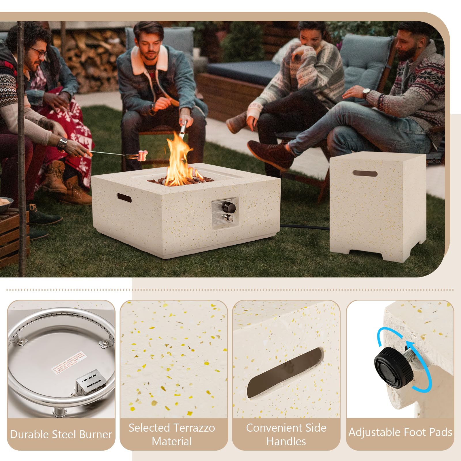 Create an ultimate gathering space in your outdoor space with this propane fire pit table set! Featuring 40,000 BTU heat output, the fire pit table creates warm and inviting ambiance to people around it. With just a simple connection to a propane tank, you can effortlessly ignite the fire pit. The easy-to-use knob allows you to control the flame intensity and warmth. In addition to be used as a side table, the tank holder also keeps the propane tank (not included) securely in place. All in all, the terrazzo square fire pit table set will effortlessly complement any patio or backyard decor. For longevity, please cover the fire pit table set when not in use. Note: Do not completely cover the burner with lava rocks