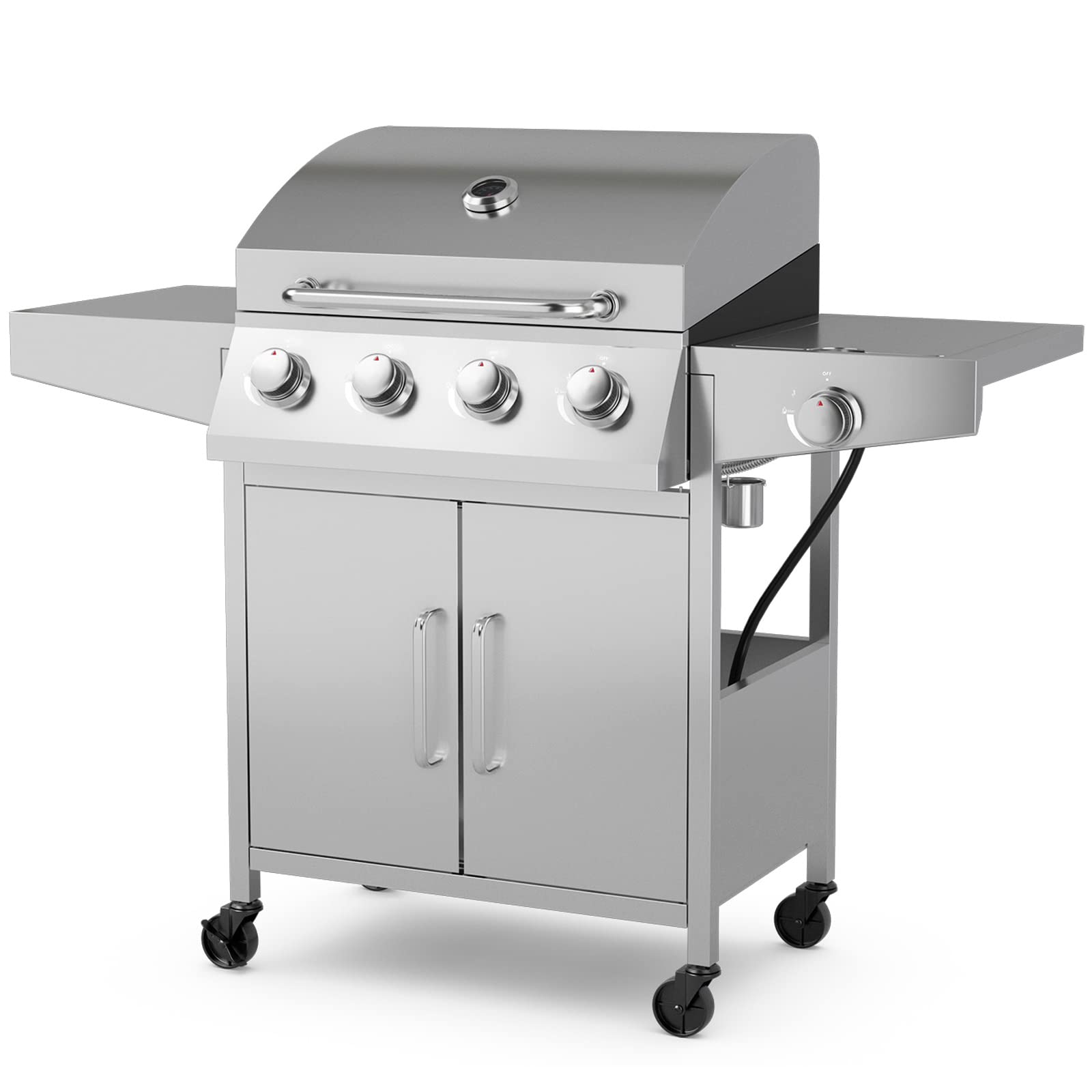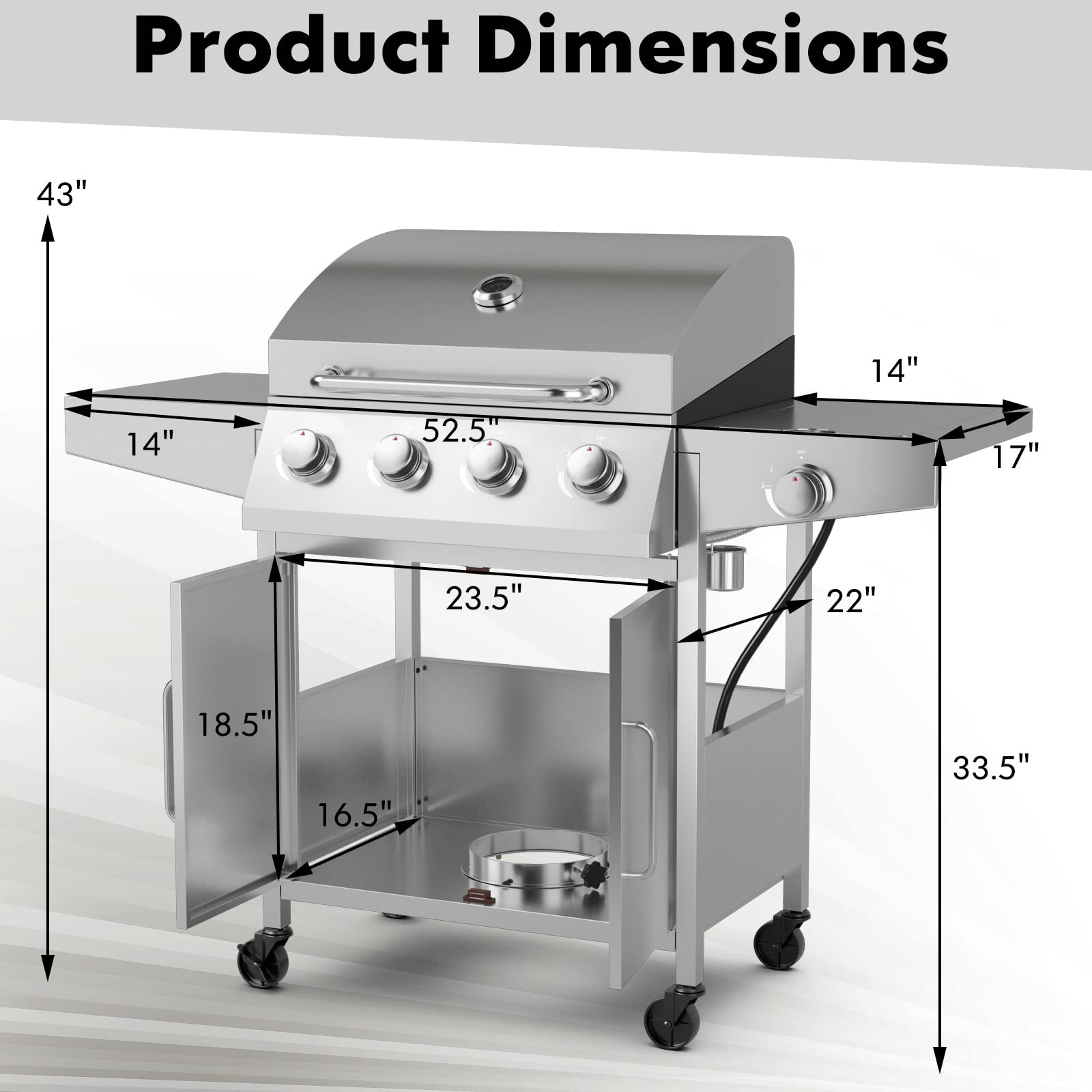 Our cabinet-style stainless steel propane gas grill comes with 460 sq. in total cooking space, providing enough delicious food for family gatherings or large parties. It has 2 side tables that provide more work and prep space for condiments and grilling tools. The 50,000 BTU gas grill includes 4 main burners and a side burner, delivering powerful heat and a great grilling experience. You can also monitor the temperature in real-time with the thermometer. In addition, our cooking grids are made of heavy-duty chrome-plated metal, which is sturdy and durable enough to effectively prevent rusting or cracking. It also has a door cabinet to store your propane tank (not included) and grilling accessories. When not in use, you can easily move it with 4 flexible wheels. This propane gas grill can be a perfect addition to any outdoor space, such as the garden, patio, poolside, terrace, and more.