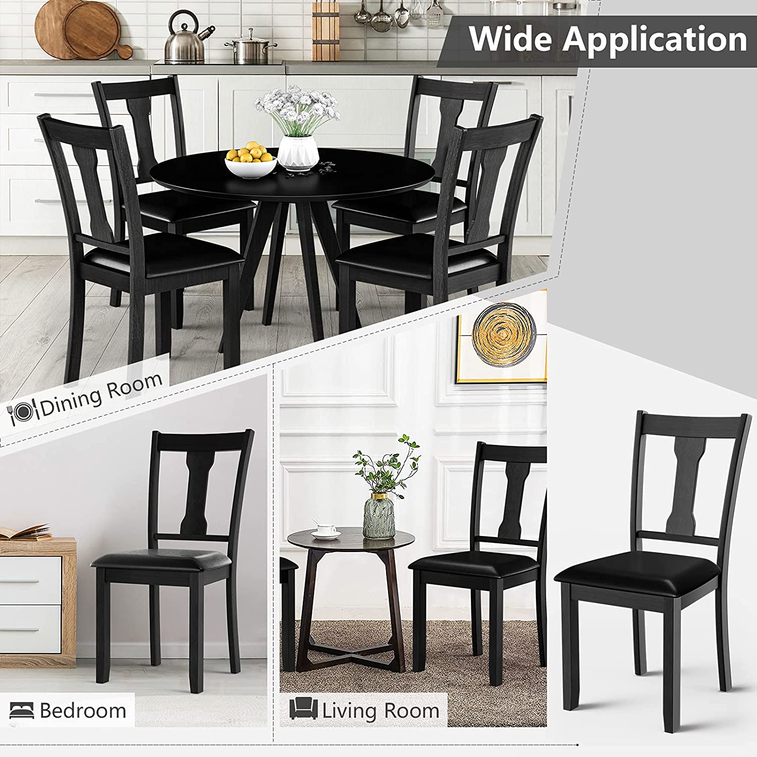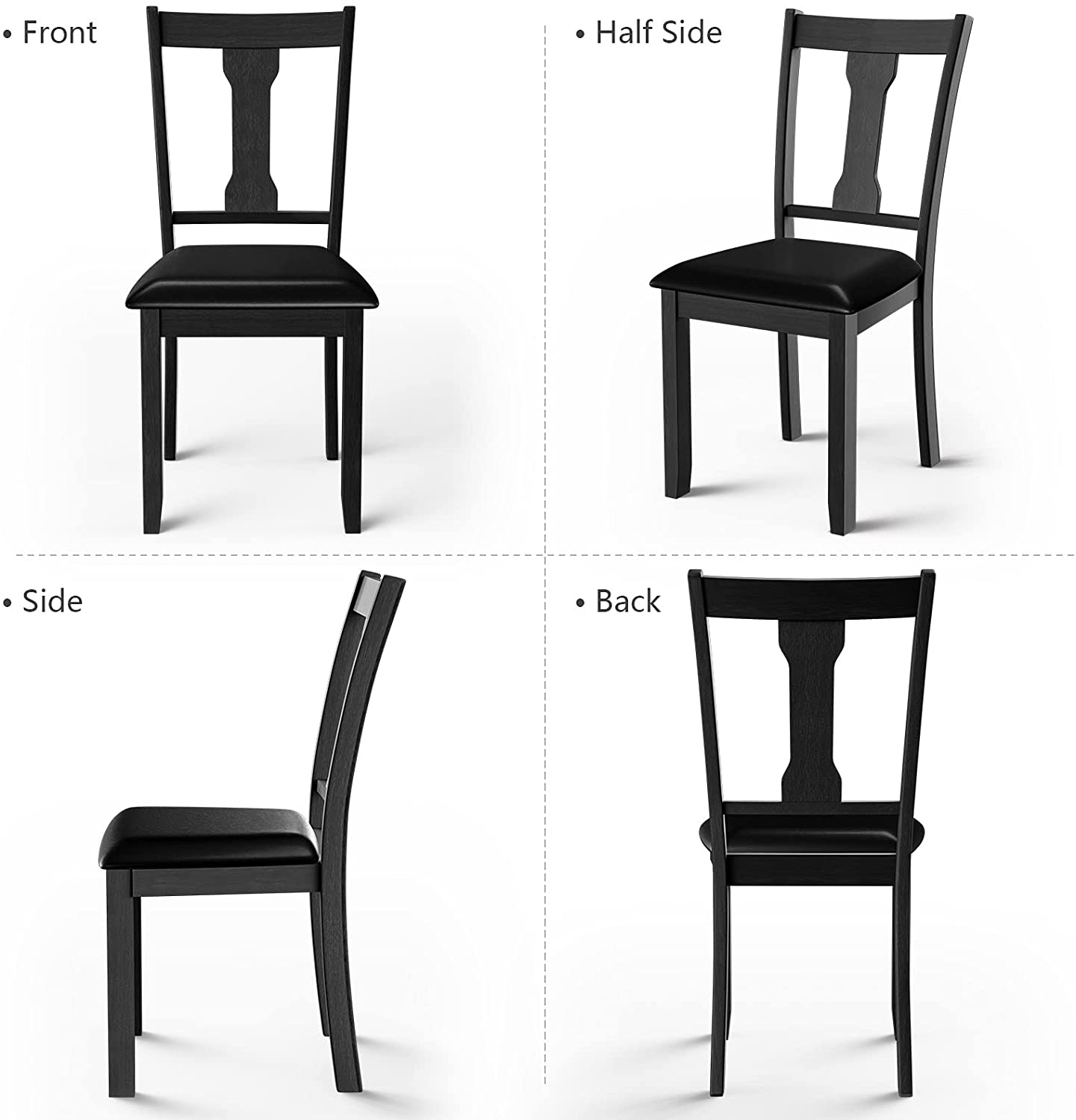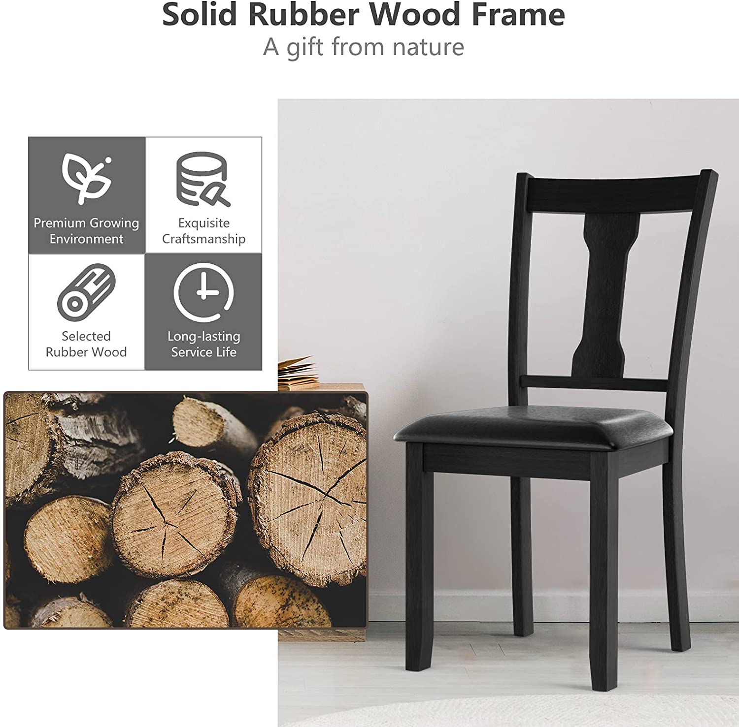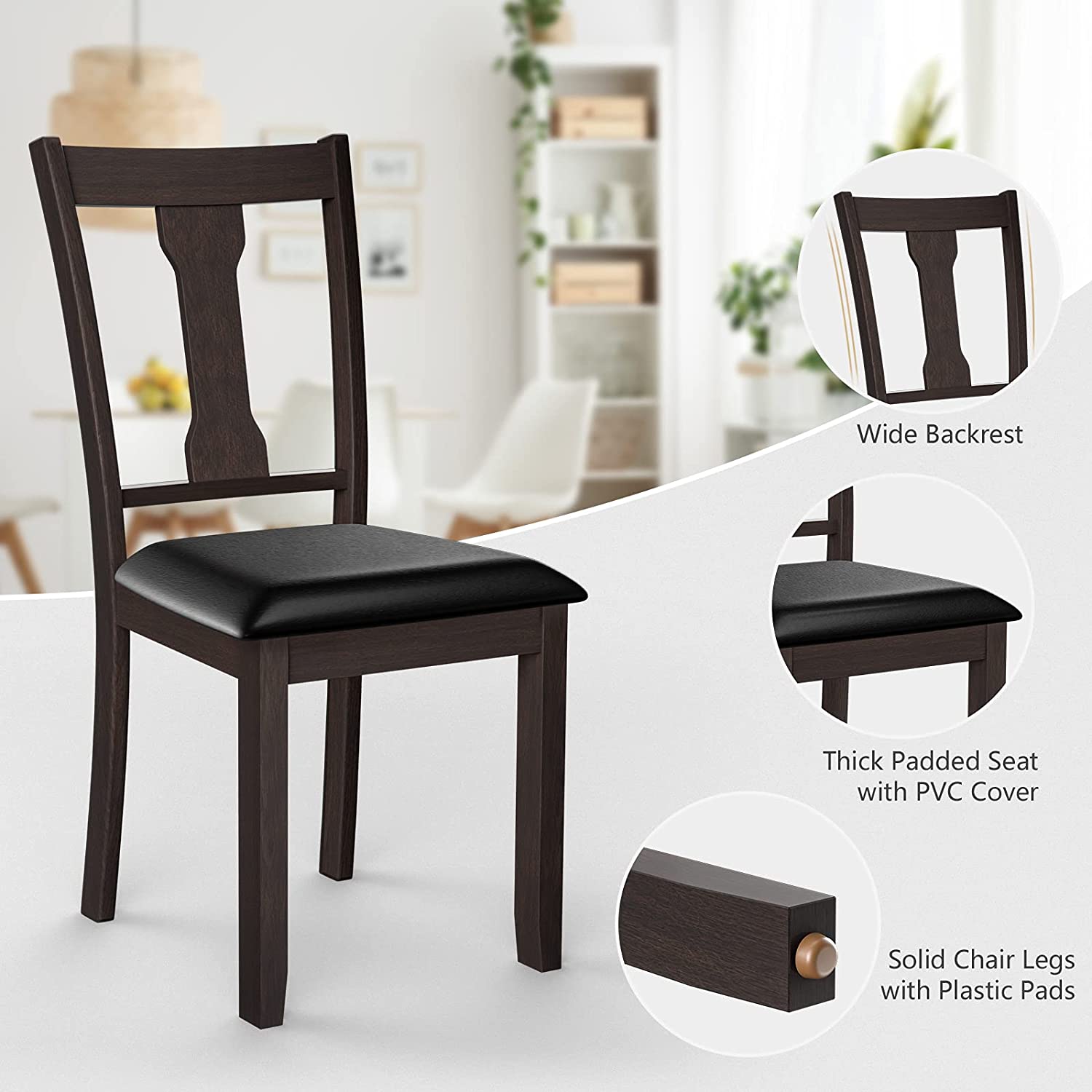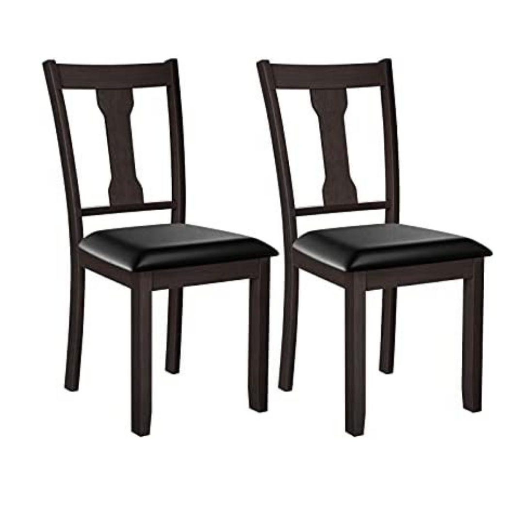 A wonderful dining chair can play an important role in creating a comfortable eating environment. Our dining chair can be a right answer for you. On the one hand, the wide seat and high backrest fit with the curve of human body well. In addition, the thick padded cushion covered by PVC leather will provide soft sitting experience for people. So you can fully relax your back and legs when you e eating with your family or friends. On the other hand, the quality of these chairs is also reliable. Made of natural rubber wood, the wood chair frame is sturdy enough to support people up to 330lbs. And PVC leather is skin-friendly and waterproof in daily use. Get this dining chair set and bring a classic tone to refresh your room decor!