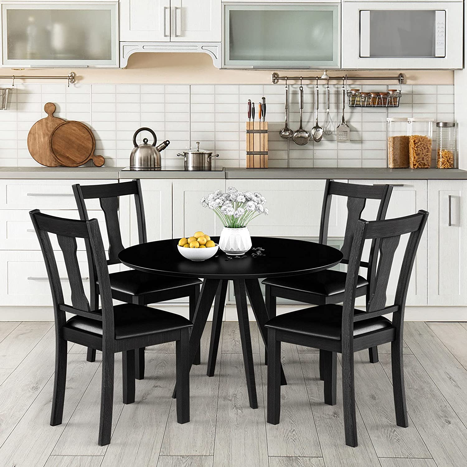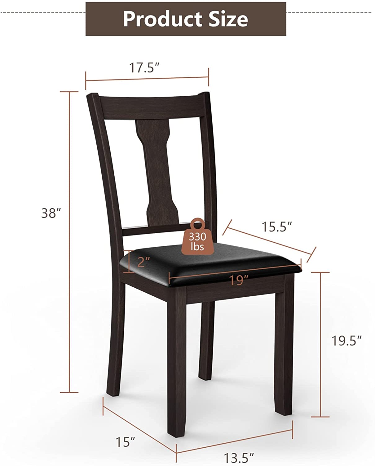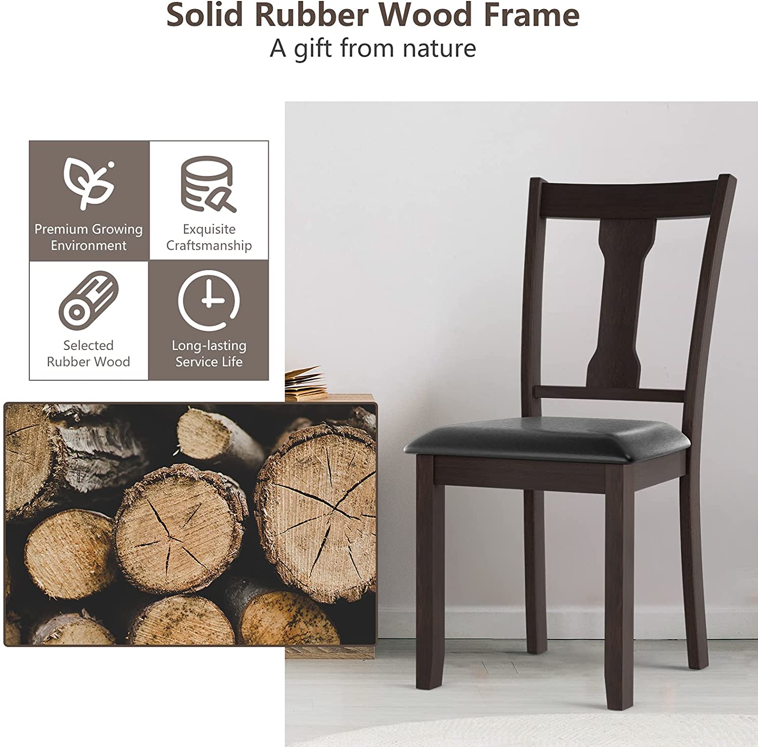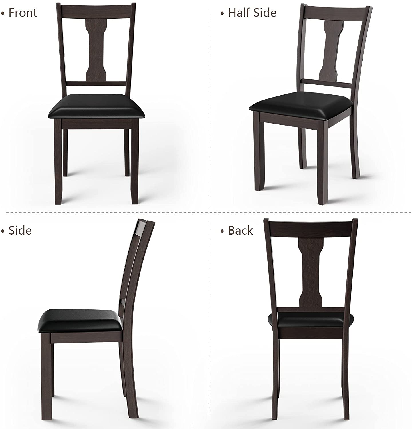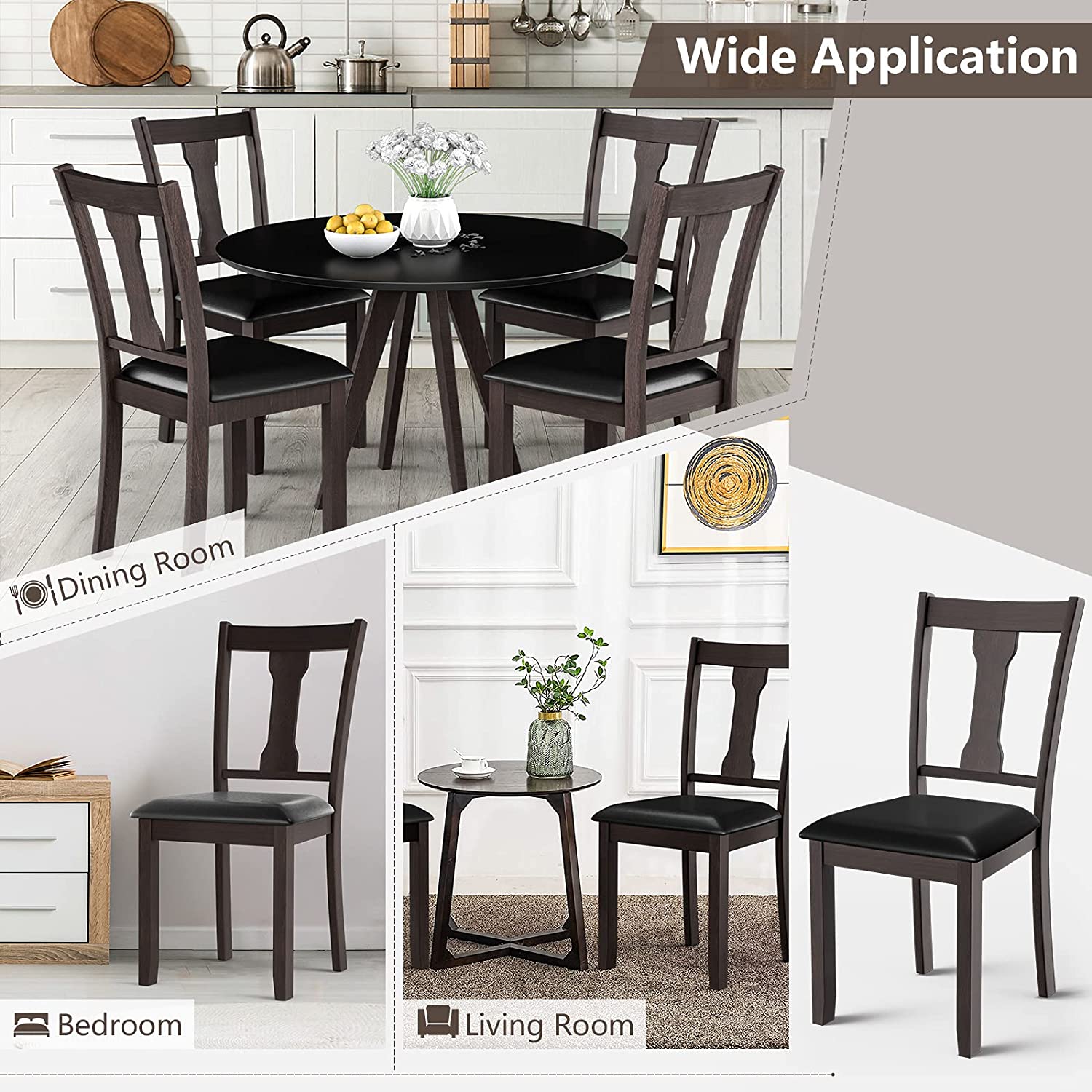 A wonderful dining chair can play an important role in creating a comfortable eating environment. Our dining chair can be a right answer for you. On the one hand, the wide seat and high backrest fit with the curve of human body well. In addition, the thick padded cushion covered by PVC leather will provide soft sitting experience for people. So you can fully relax your back and legs when you e eating with your family or friends. On the other hand, the quality of these chairs is also reliable. Made of natural rubber wood, the wood chair frame is sturdy enough to support people up to 330lbs. And PVC leather is skin-friendly and waterproof in daily use. Get this dining chair set and bring a classic tone to refresh your room decor!