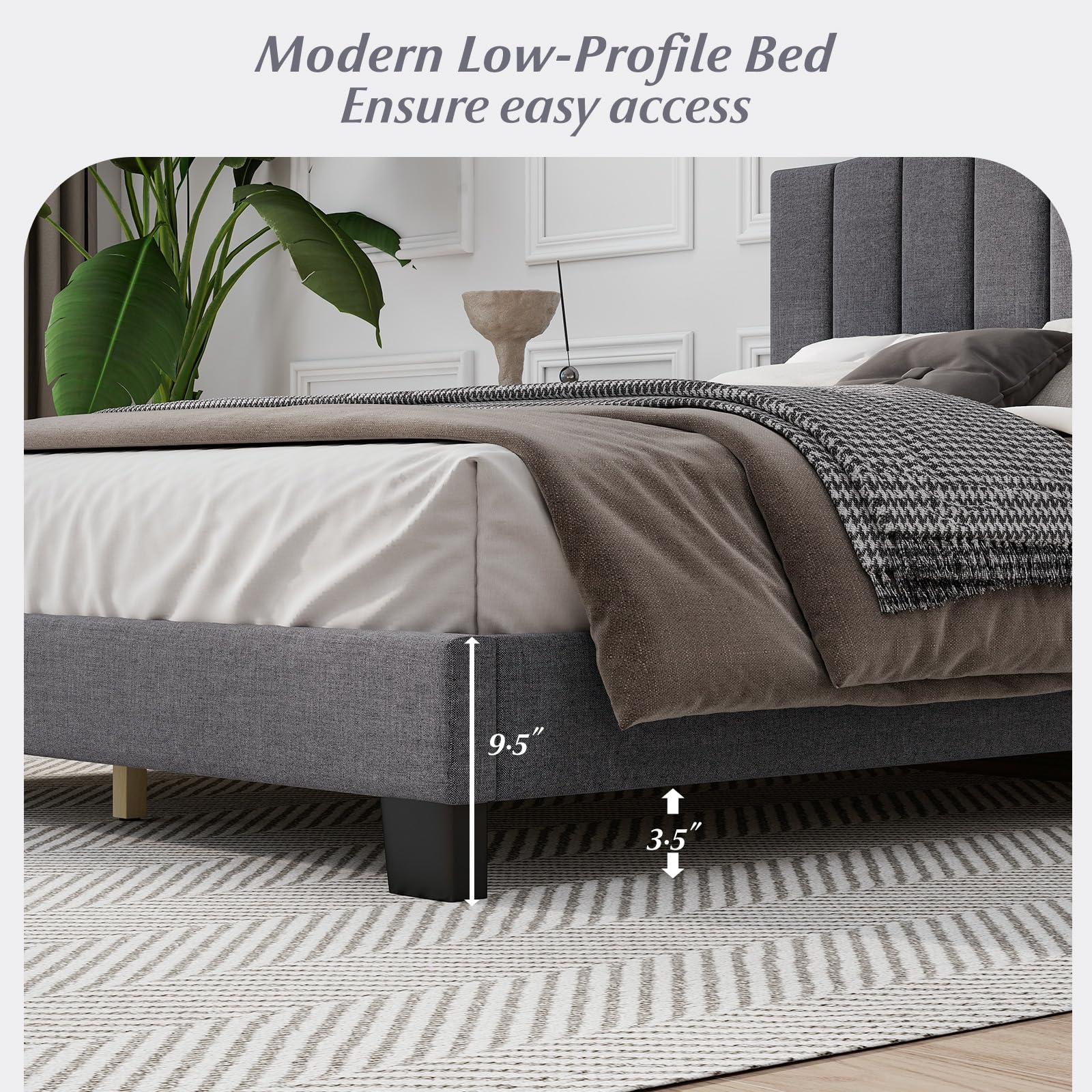 Elevate your sleep quality and room aesthetics with our queen size bed frame, offering not just a sleep platform but a statement of style. Wrapped in luxurious, breathable linen and padded for supreme comfort, the stylish tufted headboard adjusts to fit thick, cozy mattresses perfectly. Robust construction brings stability and support, holding up to 770 lbs effortlessly. Forget noisy nights and box springs—the advanced wooden slat system ensures silent, supportive slumber, extending mattress life. Plus, the sleek low-profile design subtly maximizes space, keeping your bedroom airy and elegant. Ready for a bedroom revolution? Click to experience the perfect blend of functionality and flair!